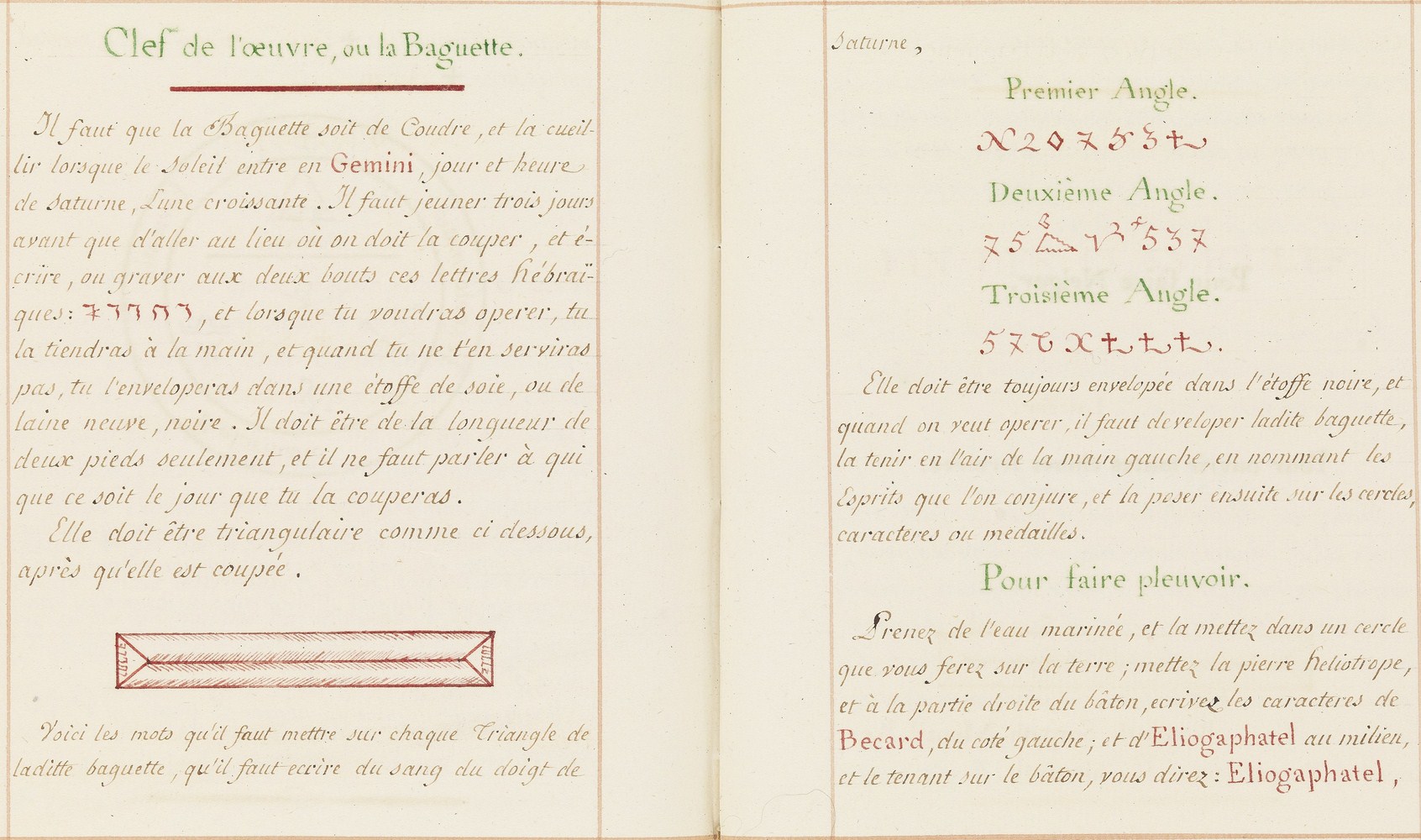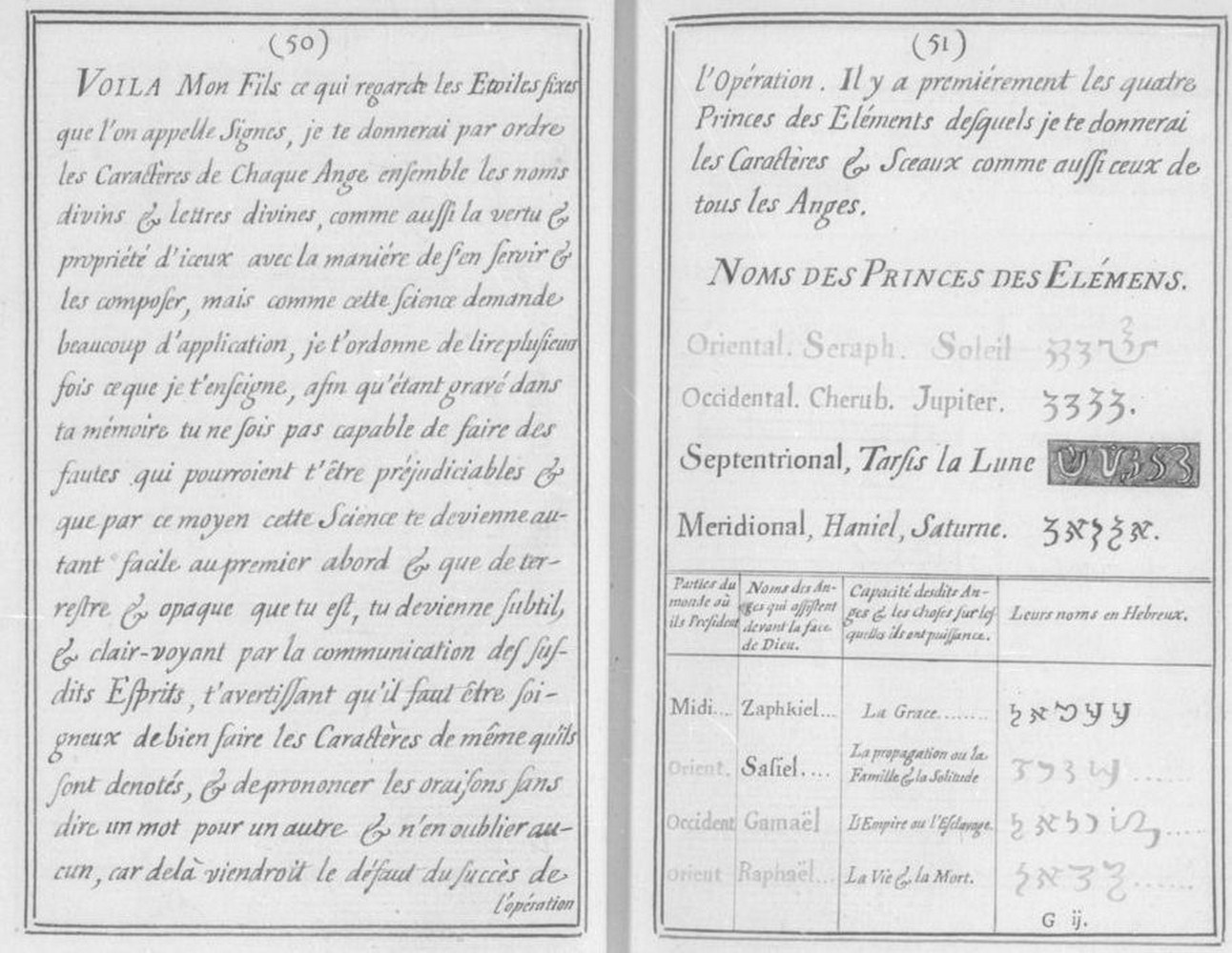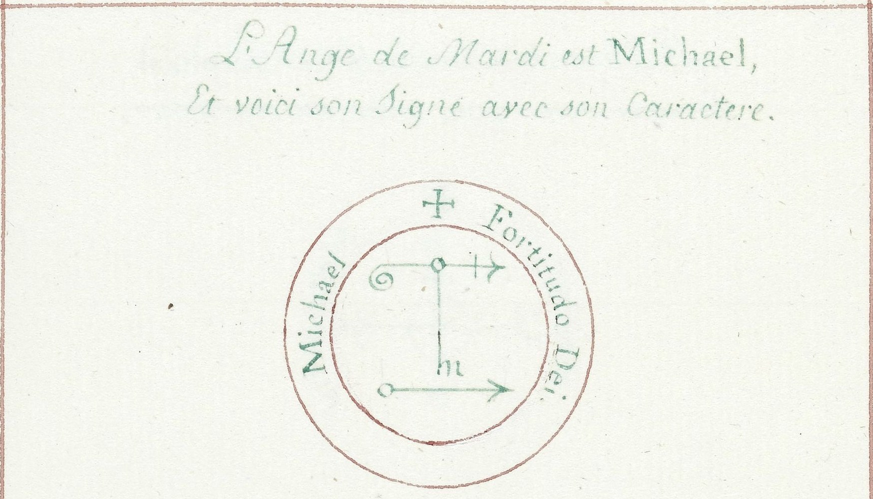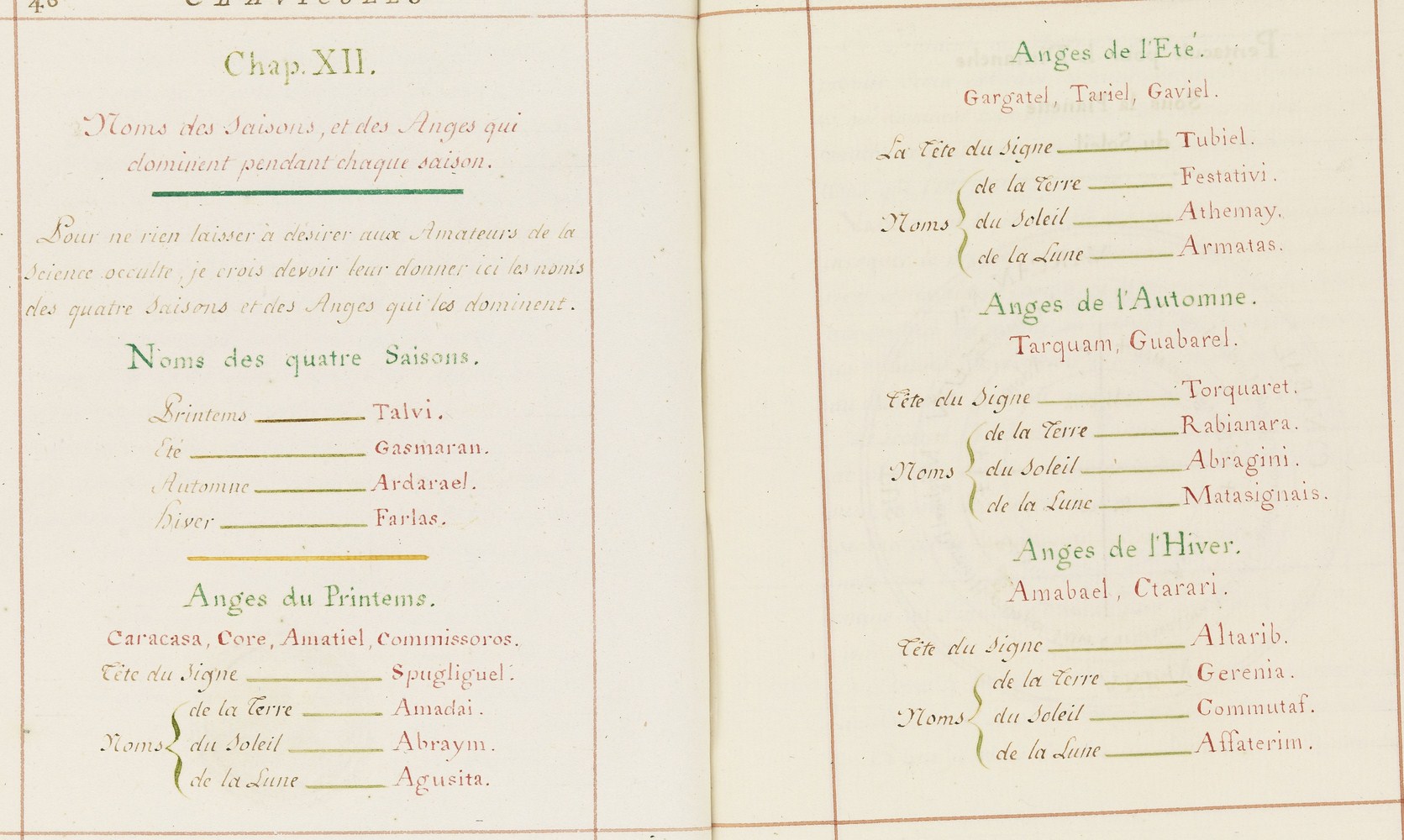 🕮 Dorbon-Aîné, ref.770 (pour le ms. WL) : Manuscrit très complet du XVIIIe siècle, l’un des rares, dans ce genre d’ouvrages, portant la date d’exécution et le nom du scribe. Il [est] d’ailleurs bien écrit sur papier vergé, texte encadré d’un filet rouge, et est illustré de 116 pantacles et tableaux, non compris quelques vignettes et caractères cabalistiques. — À la suite des « Clavicules » proprement dites se trouve un « Livre contenant plusieurs beaux et rares Secrets recueillis de divers bons et anciens autheurs cabalistes et negromantiens, et autres bien approuvés et expérimentés ».