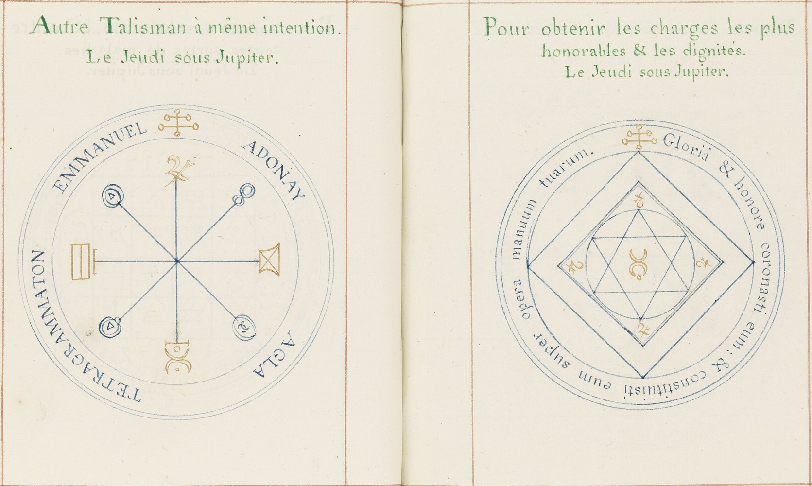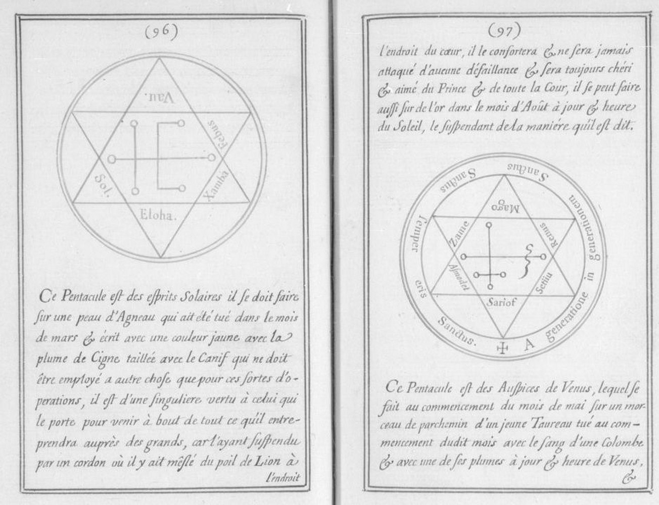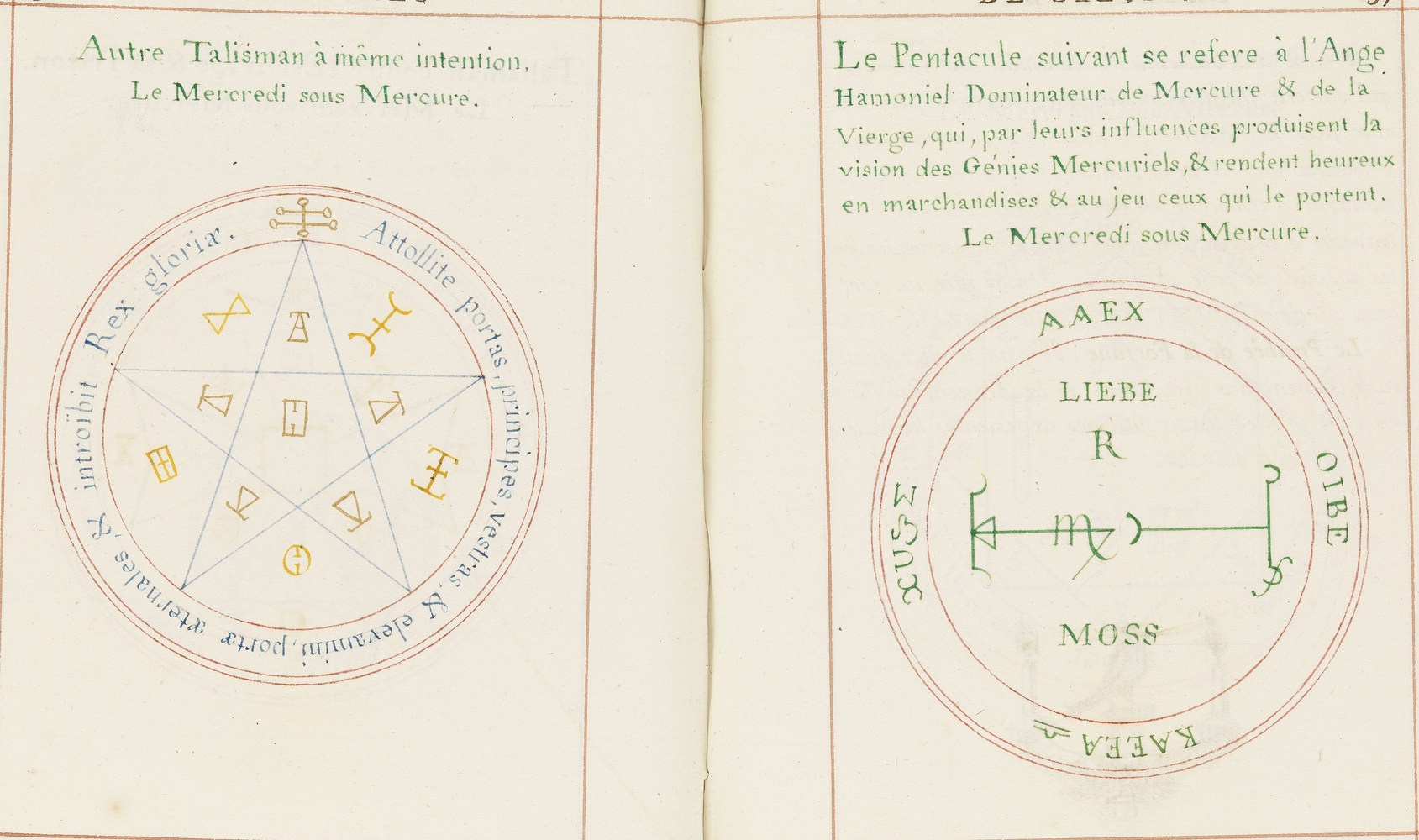 🕮 Dorbon-Aîné, ref.770 (pour le ms. Bnf) : […] Ce précieux manuscrit — dit une coupure de journal de l’époque — est un des rares écrits se rapportant à la kabbale pratique ou magie cérémonielle. Tous les grimoires du Moyen Age en sont des abgrégés plus ou moins fidèles. De plus, certaines copies fort incomplètes circulent sous ce titre. La «Magie cérémonielle » proprement dite est contenue dans les 60 premières pages où tous les détails nécessaires des recettes magiques, dénaturées par la plupart des grimoires, sont exposées de la page 60 à la page 85. Quarante-huit talismans sont décrits de la page 85 à la page 131 ; enfin le reste du volume est consacré aux anneaux magiques et à leur confection. On voit que le manuscrit reproduit est absolument complet.