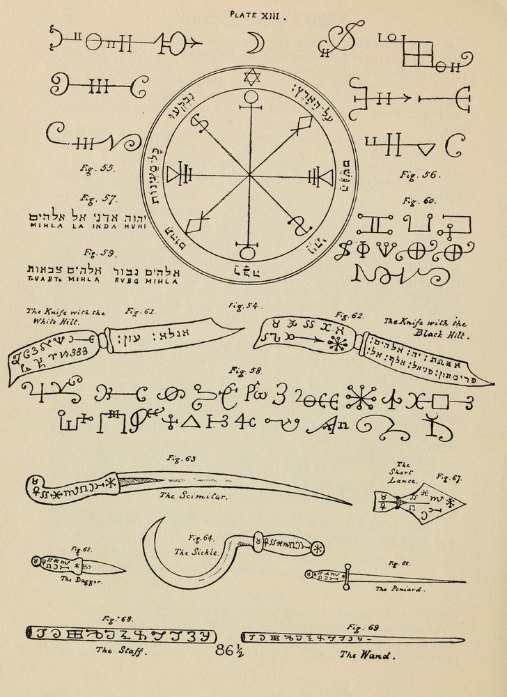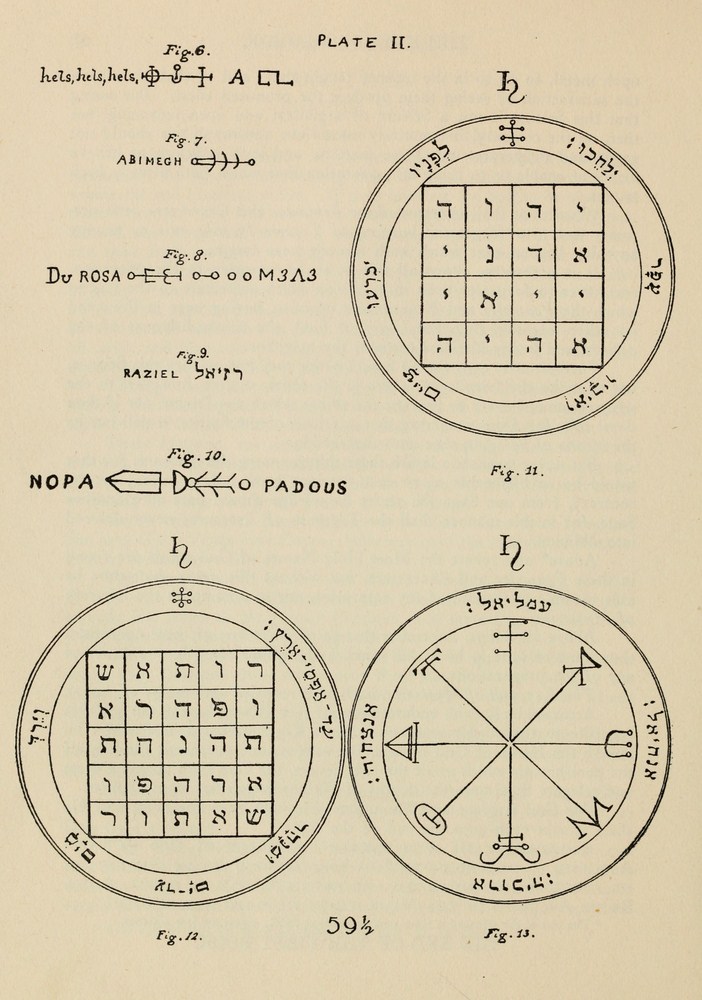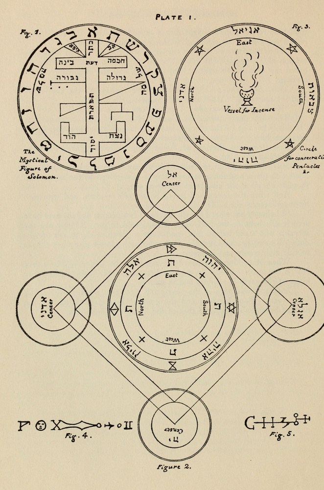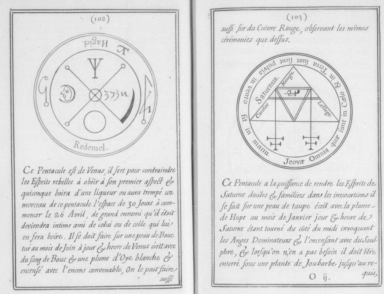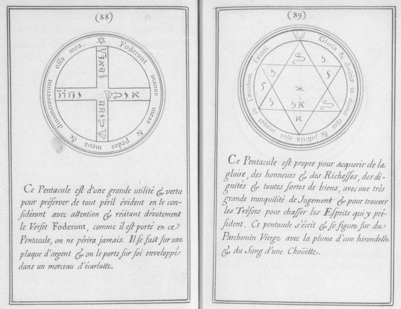 🕮 Dorbon-Aîné, ref.770 (pour le ms. Bnf) : […] Ce précieux manuscrit — dit une coupure de journal de l’époque — est un des rares écrits se rapportant à la kabbale pratique ou magie cérémonielle. Tous les grimoires du Moyen Age en sont des abgrégés plus ou moins fidèles. De plus, certaines copies fort incomplètes circulent sous ce titre. La «Magie cérémonielle » proprement dite est contenue dans les 60 premières pages où tous les détails nécessaires des recettes magiques, dénaturées par la plupart des grimoires, sont exposées de la page 60 à la page 85. Quarante-huit talismans sont décrits de la page 85 à la page 131 ; enfin le reste du volume est consacré aux anneaux magiques et à leur confection. On voit que le manuscrit reproduit est absolument complet.