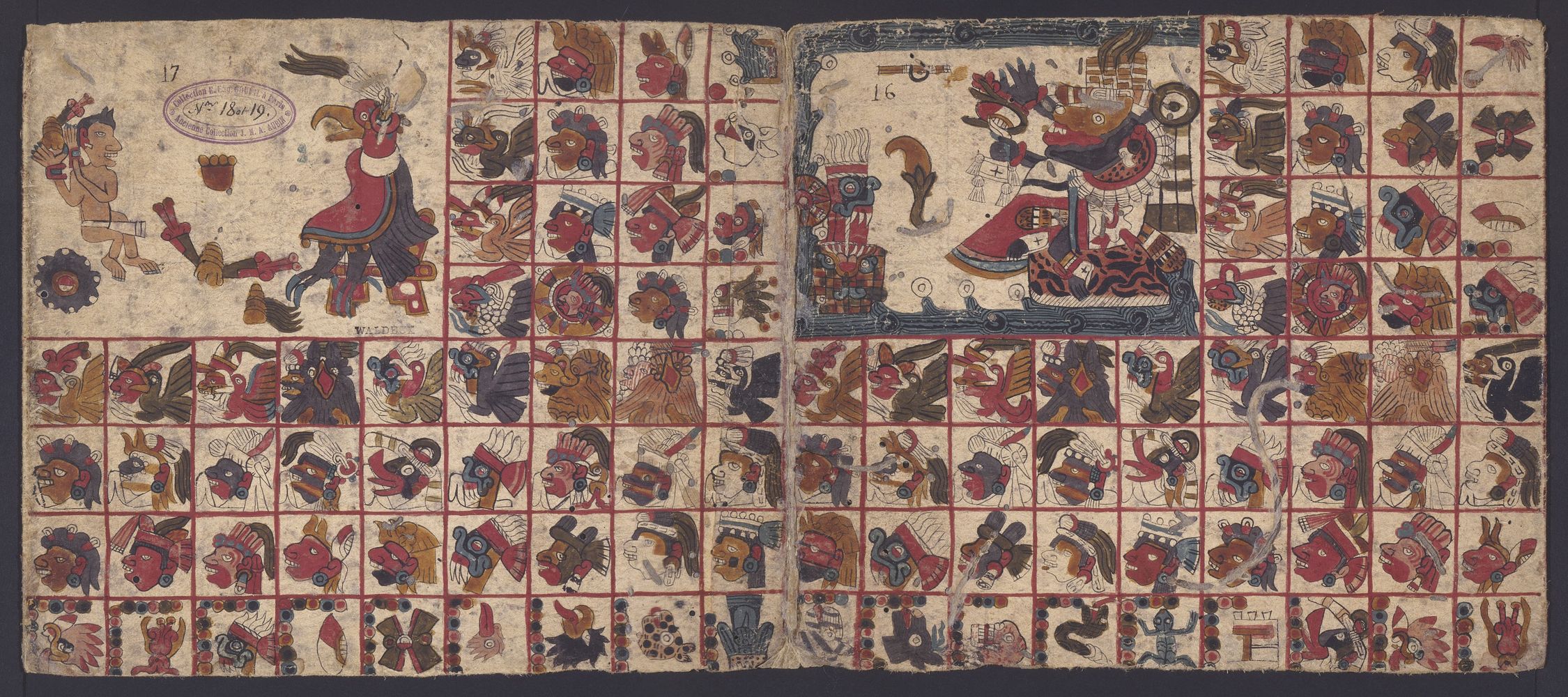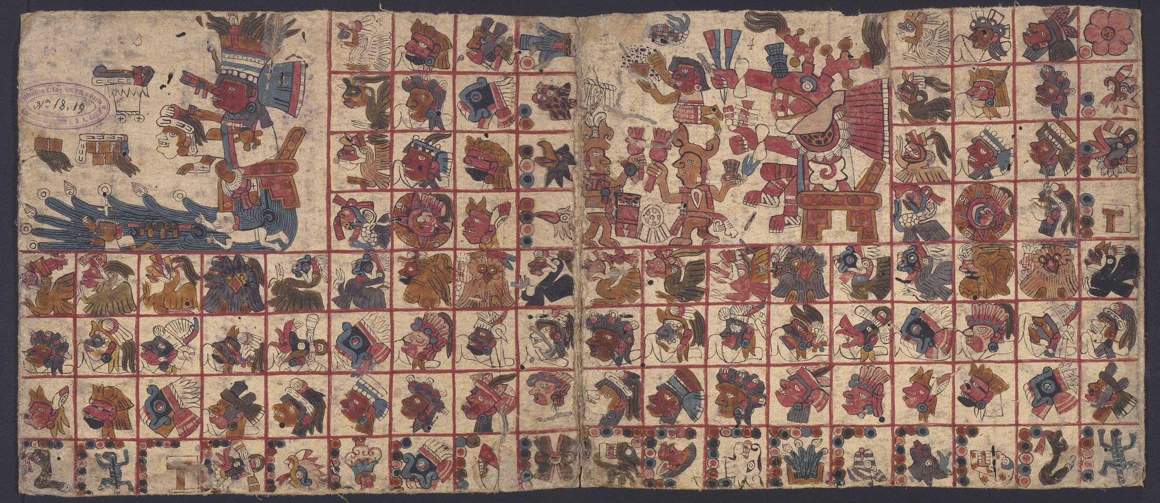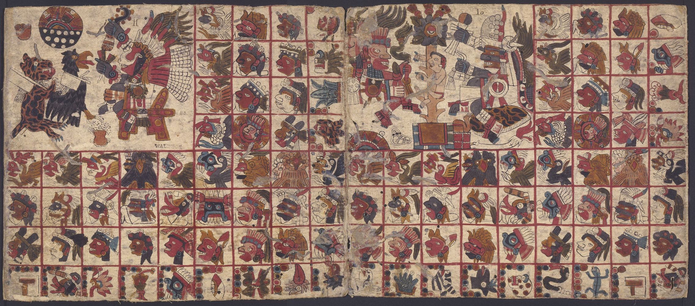 ► Ce tonalpohualli (calendrier religieux de 260 jours) auquel il manque vraisemblablement deux feuillets, est probablement originaire de la la région de l’État de Tlaxcala. Écrit en nahuatl, il se parcourt de haut en bas et de droite à gauche.