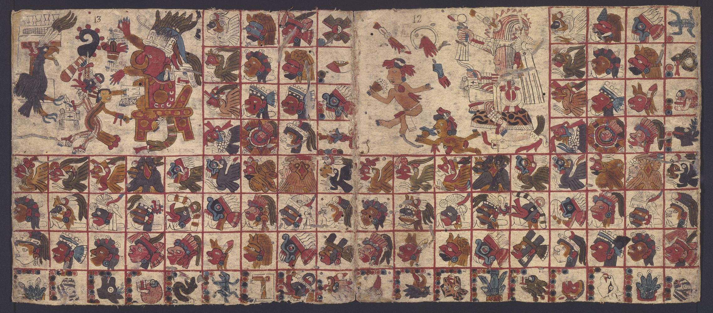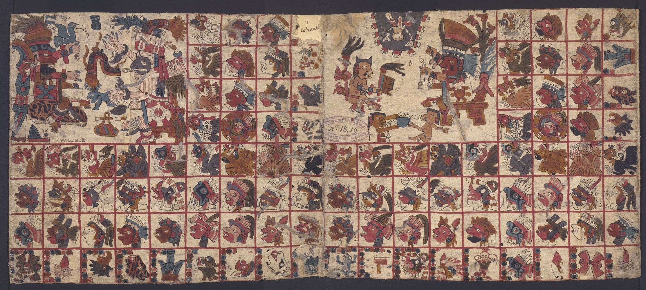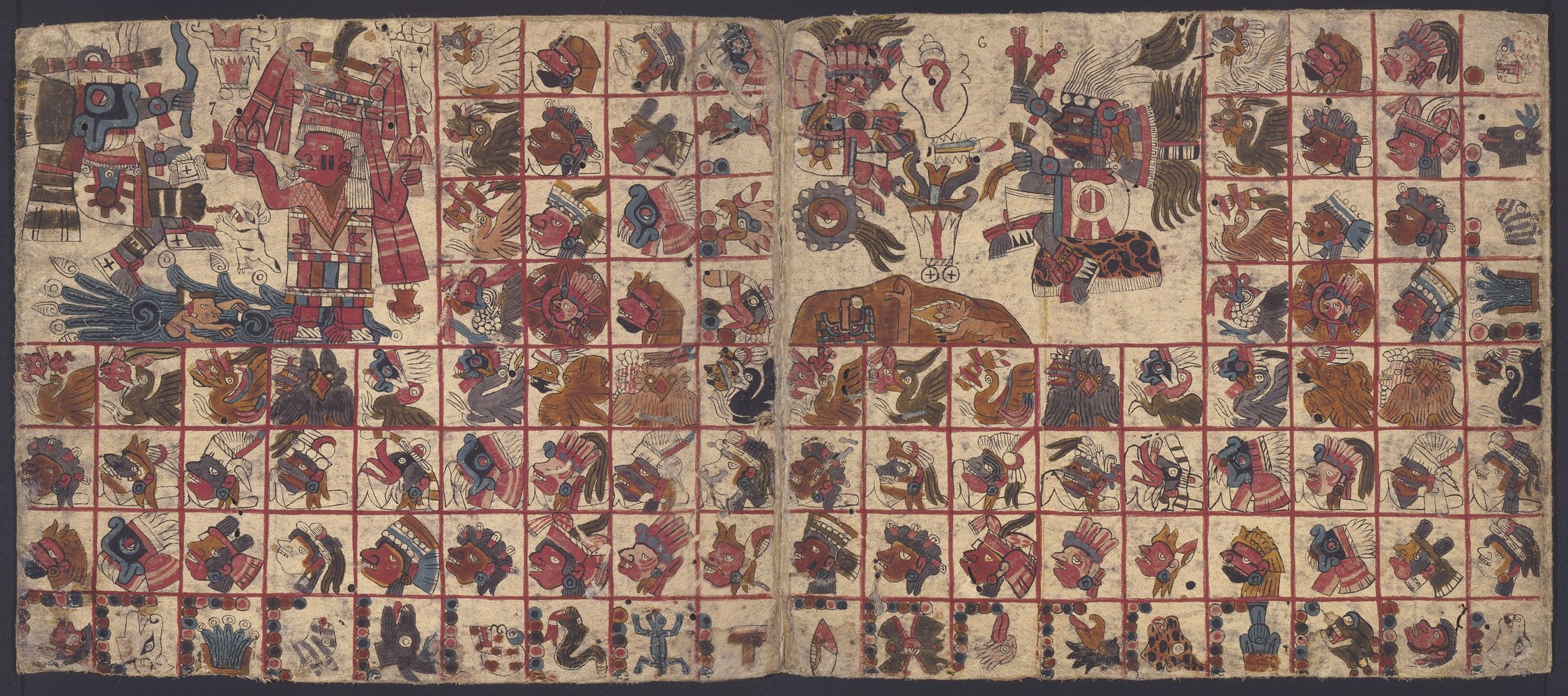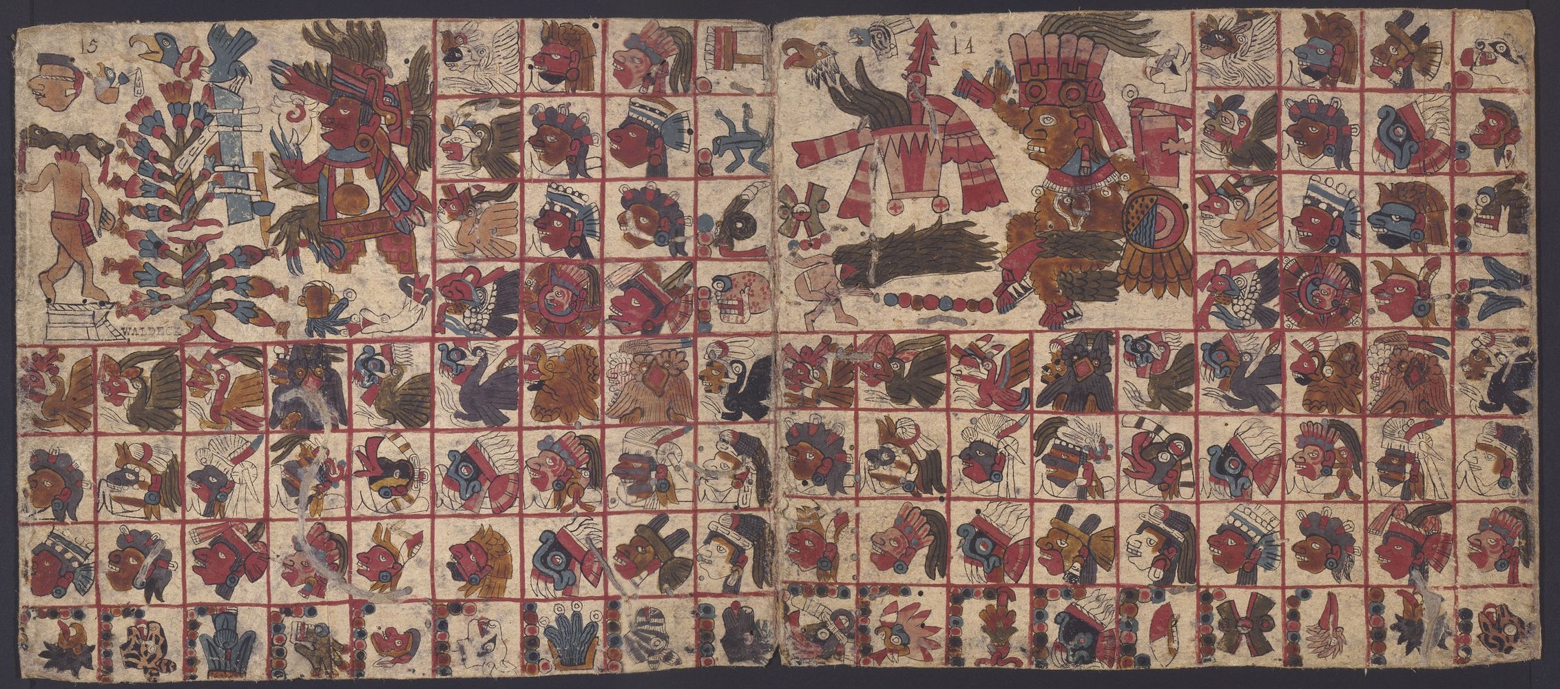 ► Ce tonalpohualli (calendrier religieux de 260 jours) auquel il manque vraisemblablement deux feuillets, est probablement originaire de la la région de l’État de Tlaxcala. Écrit en nahuatl, il se parcourt de haut en bas et de droite à gauche.