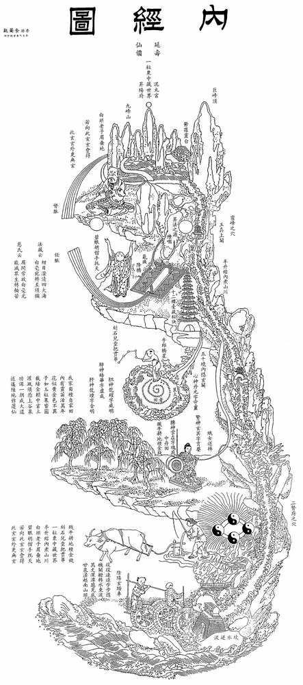 ► Ces schémas complémentaires sont les plus célèbres dessins représentant l’alchimie interne orientale, en l’occurrence le neidan de la secte du Portail du Dragon {Longmen (龍門)} de l’école de la Voie de la Parfaite Complétude {Quanzhen Dao (全真道)}, cette dernière étant dominante dans la voie du cinabre en Chine. Les copies du Neijing Tu qui circulent prennent leur source depuis un mur et une stèle de 1886 situés au Temple du nuage blanc de Pékin. Du reste, lui et le Xiuzhen Tu sont au moins tirés des dessins des Dix travaux sur la cultivation de la perfection {Xiuzhen shishu (修真十書)} datant du XII mais remonteraient à une date bien antérieure si on en croit la tradition.