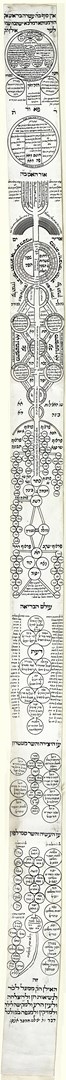 ► Cette intéressante amulette lourianique polonaise du XIX mesure 877x40 mm et tient probablement sa source du Maroc ou d’Israël. Elle contient plusieurs configurations séphirothiques typiques, une description des palais {heikhalot} et des 32 voies de la sagesse. Divers parties du texte figurent des correspondances avec le corps Humain. Le texte supérieur est une formule de bénédiction et d’adoration à Adam Kadmon.