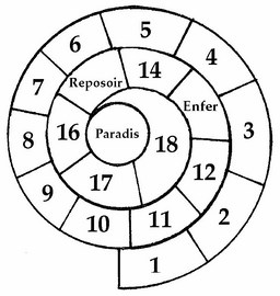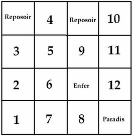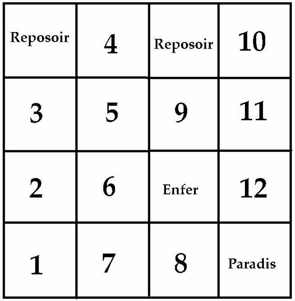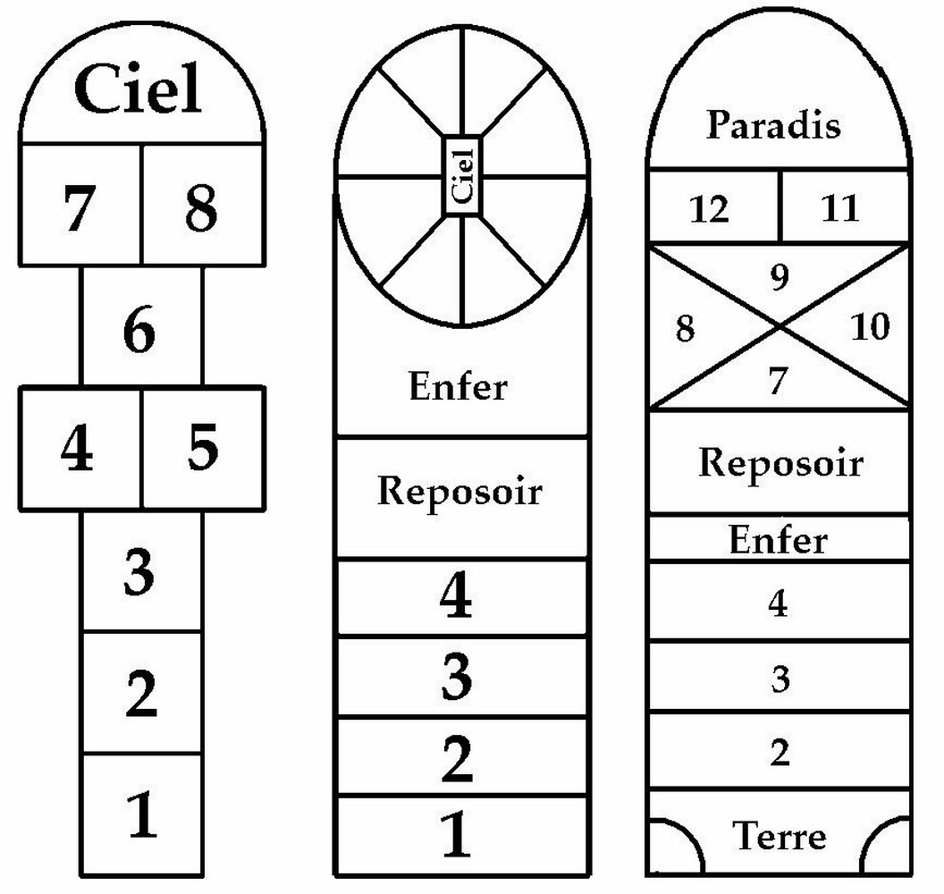 ► Selon les lieux et les époques, le nom bien sur, mais aussi le plan du jeu diffère et beaucoup de variantes plus ou moins complexes sont répertoriées. Les formes les plus communes sont la croix, le colimaçon et le carré agrémentés de trois cases : la terre, l’enfer et le ciel. Sa forme peut rappeler dans le premier cas le plan simplifié d’une cathédrale, dans le second le Jeu de l’Oie et enfin dans le dernier un labyrinthe.