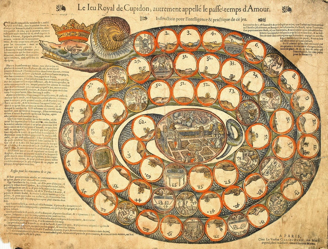 ☩ Illustration : photographie en ligne du Jeu de l’Oie, 1550 – 1600, Musée britannique (Londres, Angleterre).