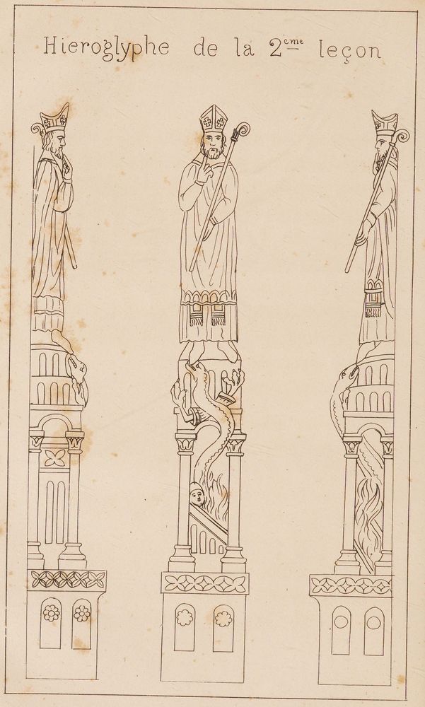 Passant un jour devant Notre-Dame de Paris, j’examinais avec beaucoup d’attention les belles sculptures dont les trois portes sont ornées, et je vis à l’une de ces trois portes un hiéroglyphe des plus beaux, duquel je ne m’étais jamais aperçu, et pendant plusieurs jours de suite j’allais le consulter pour pouvoir donner le détail de tout ce qu’il représentait, à quoi je parvins — Par ce qui suit, le lecteur s’en convaincra, et mieux encore en se transportant de lui-même sur les lieux.