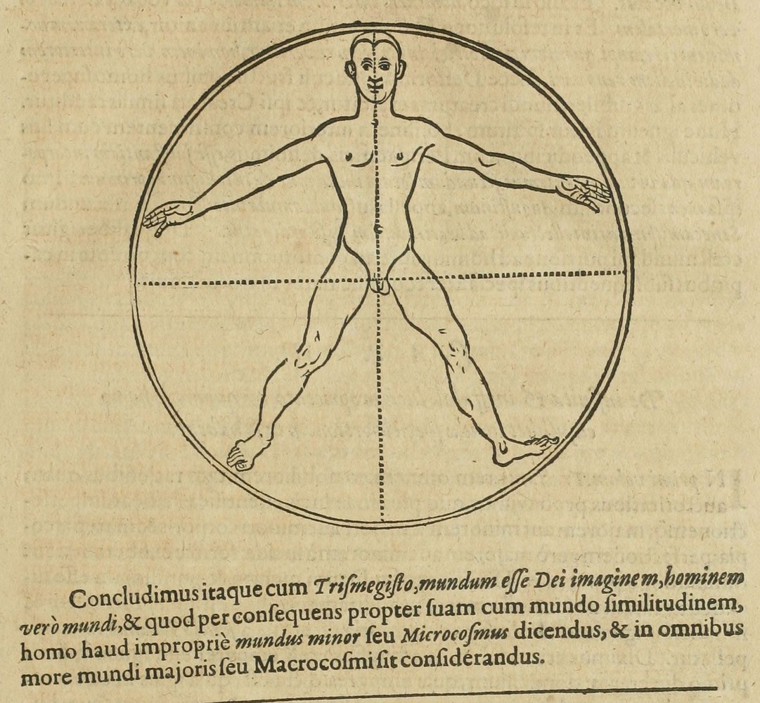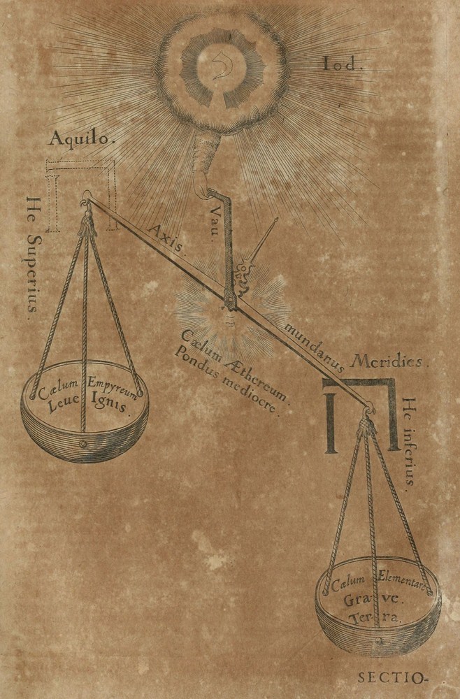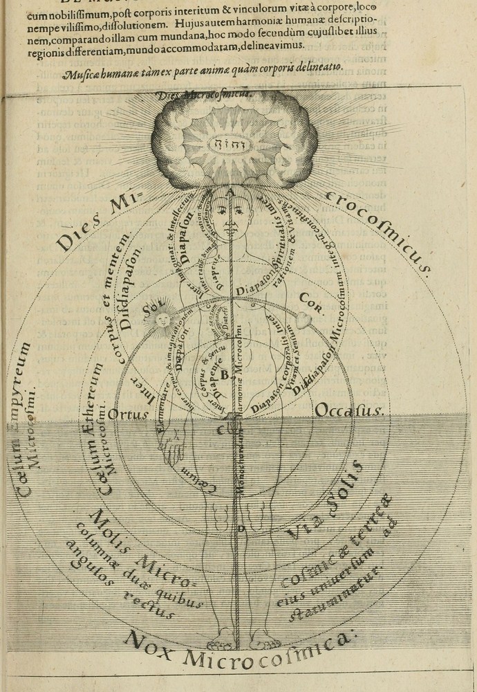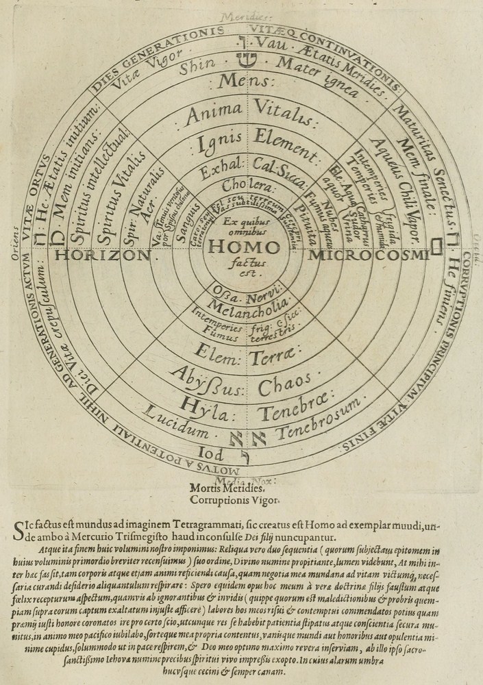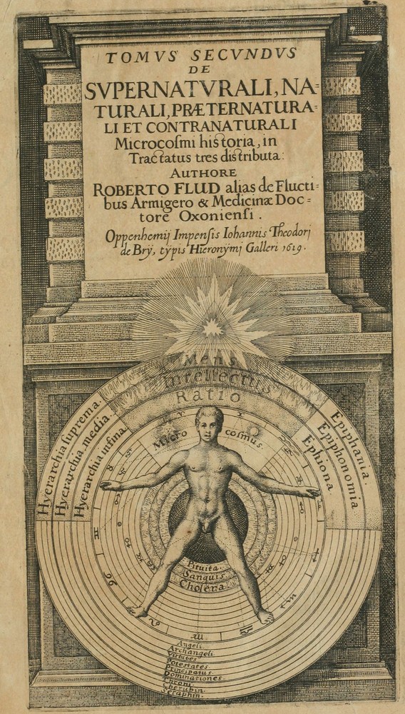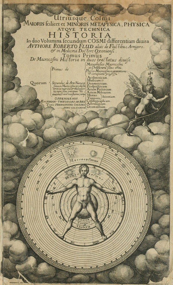 ↳ Fludd différencie les sciences macrocosmiques, où l’Homme singe la nature et celles, microcosmiques et qualifiées d’intérieures, correspondant aux sciences occultes. Les deux univers sont liés par le principe analogique, de même que l’Homme est ainsi lié au cosmos. Nombre des passages sur le macrocosme sont en fait une reprise les cours que Fludd avait préparé pour ses élèves lors de son activité de précepteur. Le début du texte tente de concilier la Genèse et le Pymandre.
