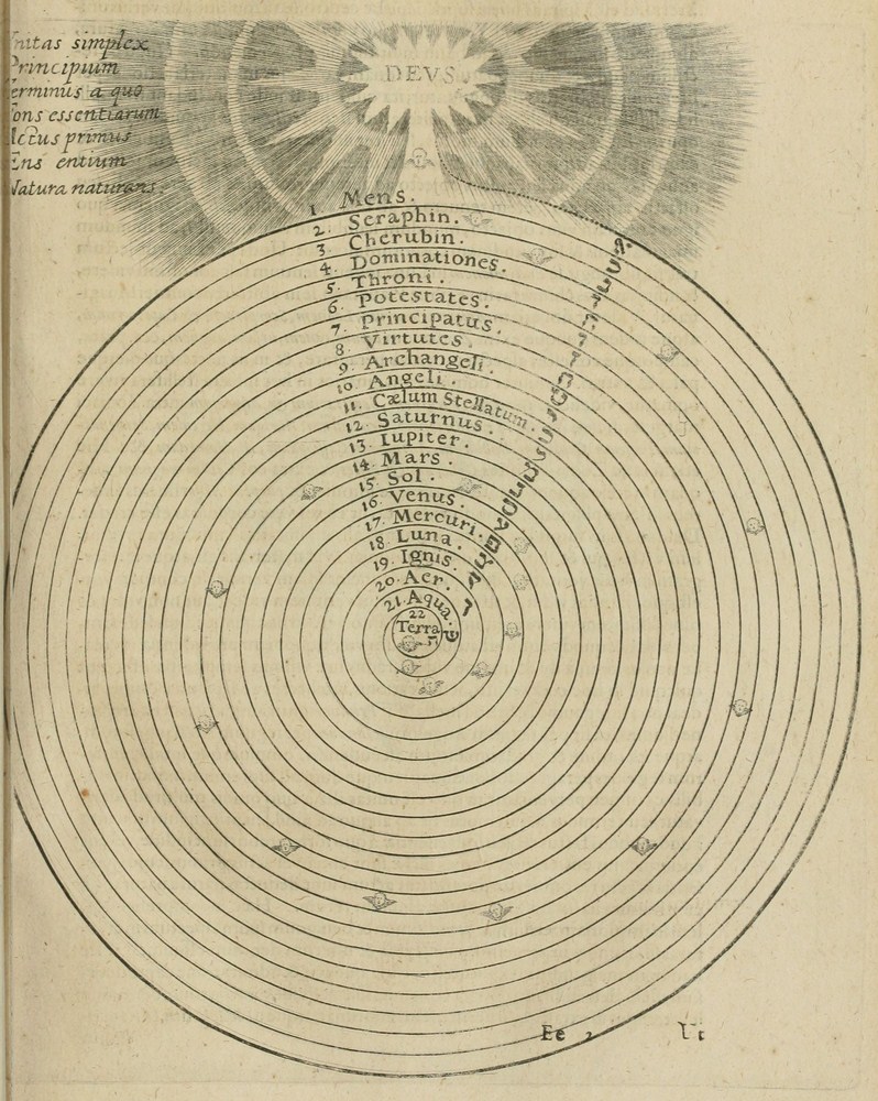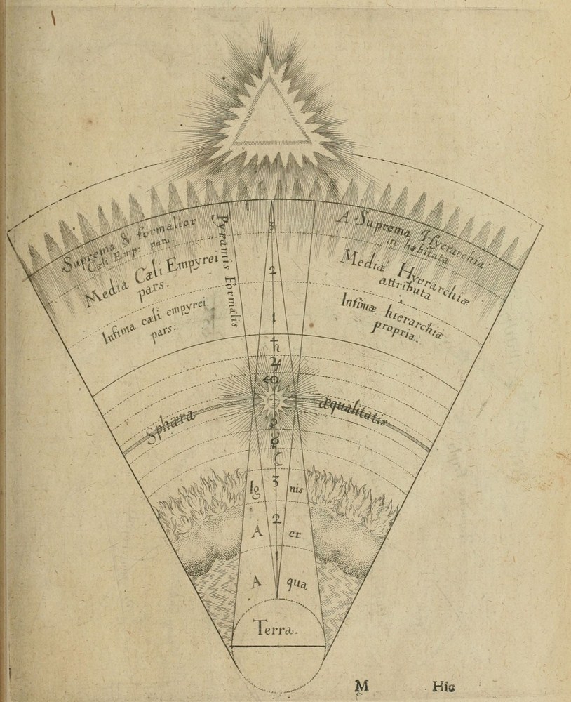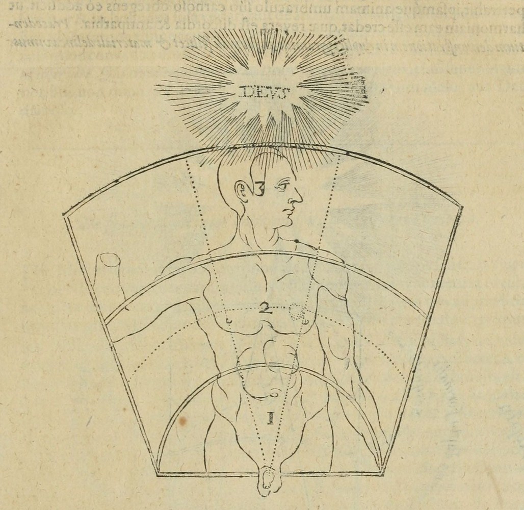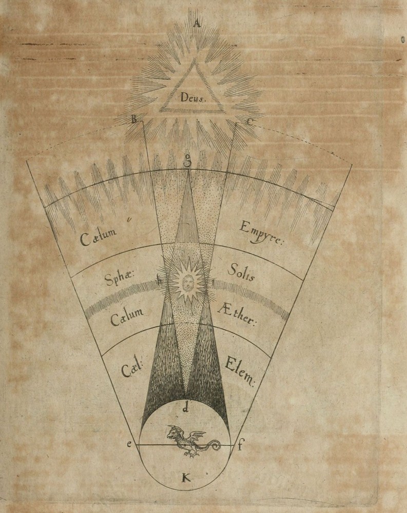 ↳ Fludd différencie les sciences macrocosmiques, où l’Homme singe la nature et celles, microcosmiques et qualifiées d’intérieures, correspondant aux sciences occultes. Les deux univers sont liés par le principe analogique, de même que l’Homme est ainsi lié au cosmos. Nombre des passages sur le macrocosme sont en fait une reprise les cours que Fludd avait préparé pour ses élèves lors de son activité de précepteur. Le début du texte tente de concilier la Genèse et le Pymandre.