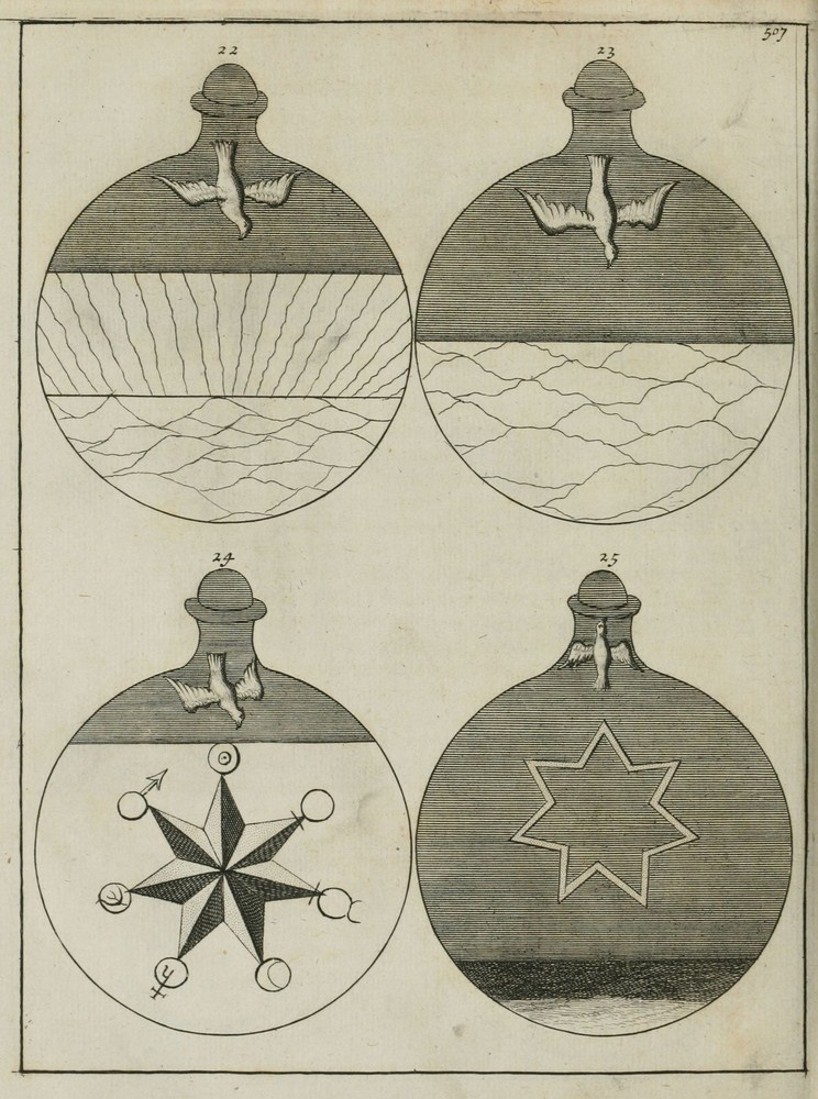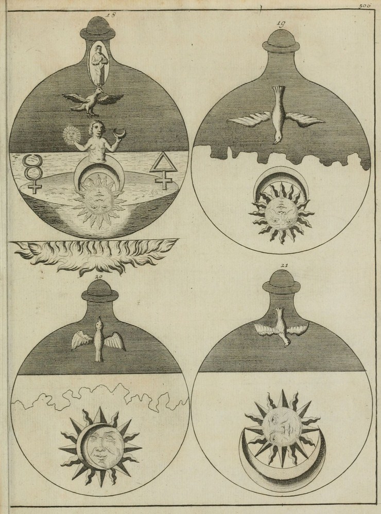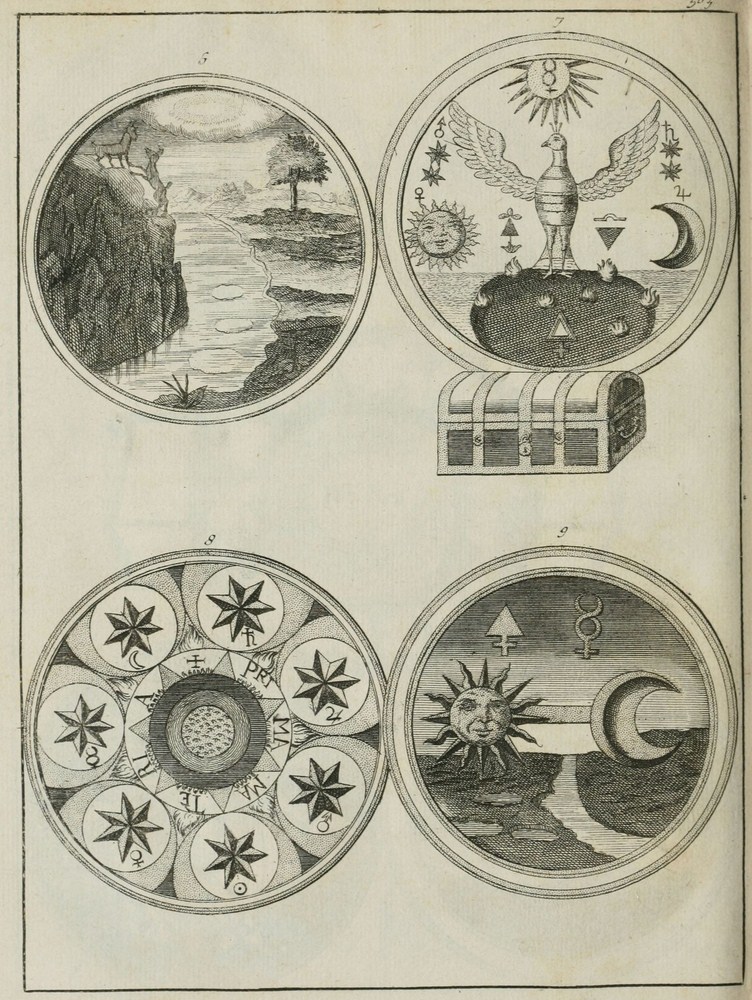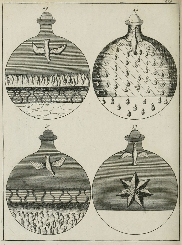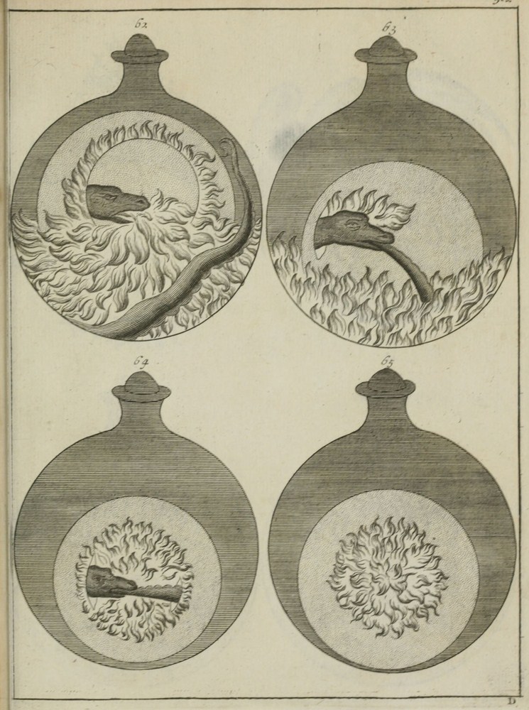► Ce livre est une version augmentée de l’originale parue en 1698 sous le nom Pyrosophia. Les figures sont, pour les deux premières, présentes dans la partie I, section II, chapitre IV : De Instrumentis (De la Chimie). Pour les deux suivantes, elles viennent de la partie II du livre V, chapitre II, nommé également : De Instrumentis (De la métallurgie). Enfin, la dernière série et la plus connue dans la partie III du livre V : De Alchimia vel Chrysopoeia.