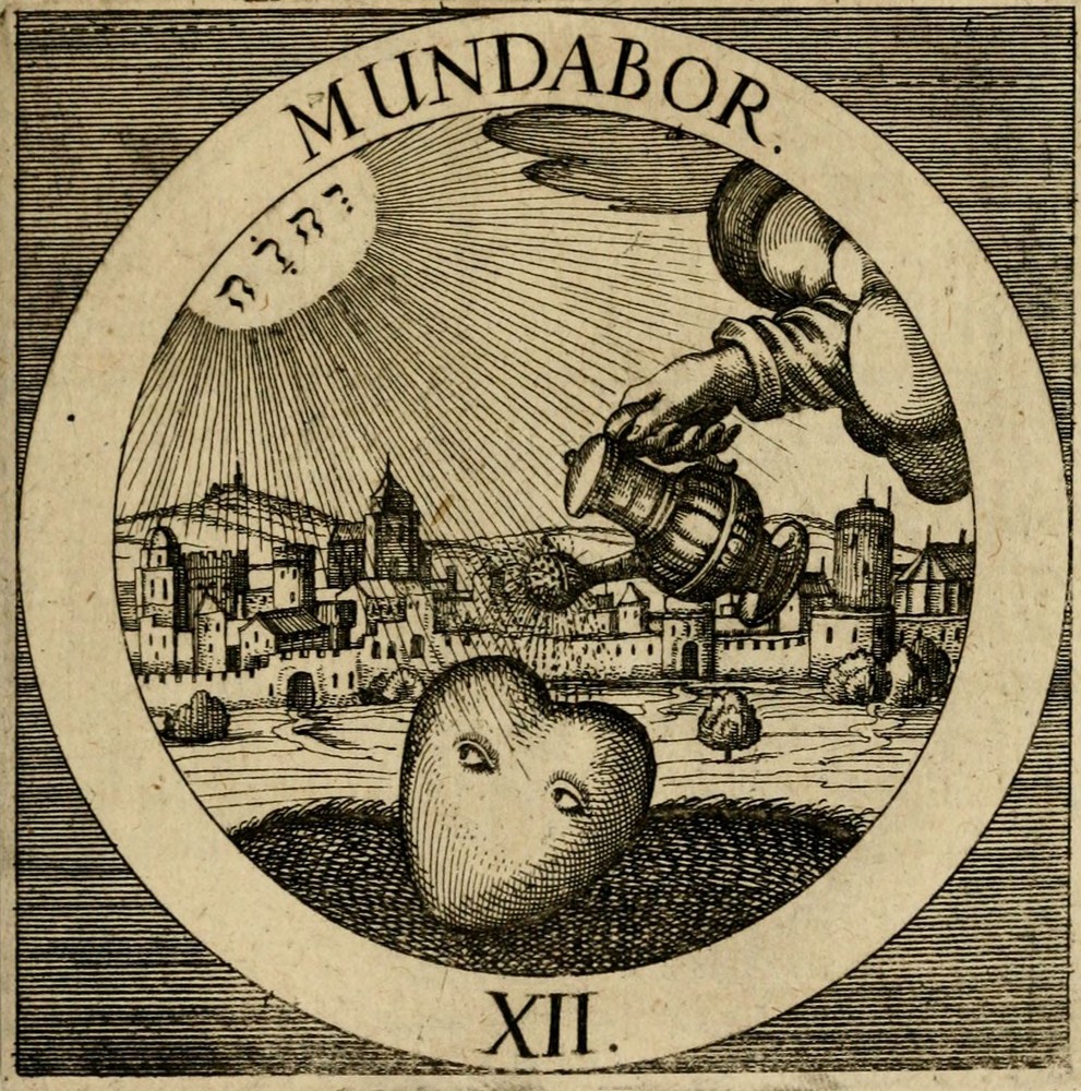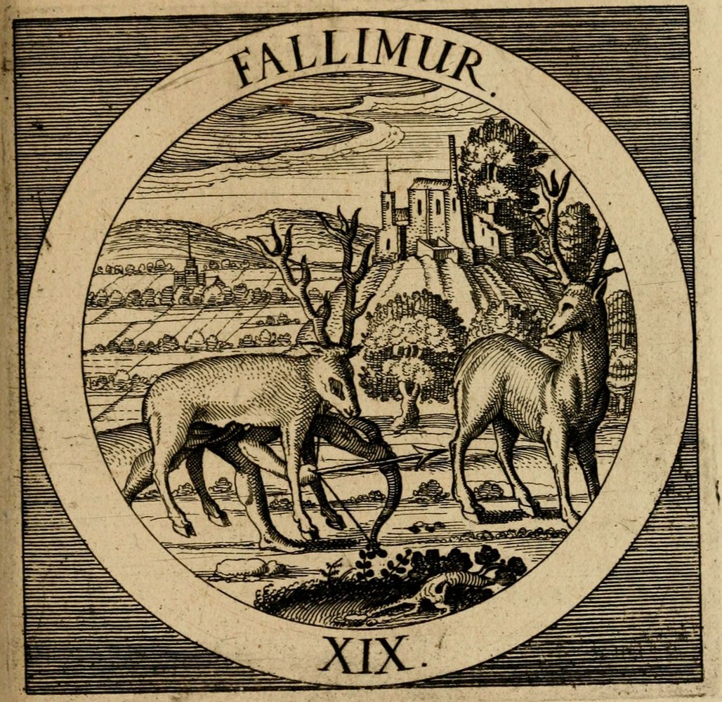 ► La première édition que l’on trouve par exemple à la Bibliothèque d’État de Bavière, ne comportait que quarante figures dans chaque livre, celle de 1624 en comportant cinquante et amenant le nombre d’emblèmes à cent, nous reproduisons donc celle-ci. À noter que dans la première édition, une mention était présente : Societas Iesu et Rosæ-Crucis Vera