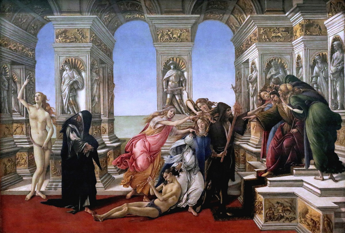 Commentaire : Ce tableau, sorte de talisman peint, constitue l’une des plus importantes œuvres ésotériques et demeure une des meilleures synthèses visuelles du néoplatonisme médicéen et de la magie naturelle de Ficin. Botticelli avait fréquenté l’Académie à la villa médicéenne de Careggi par l’intermédiaire de Lorenzo di Pierfrancesco de Médicis, son protecteur. Ce tableau a vraisemblablement été commandé par Laurent pour son cousin en même temps que Pallas et le Centaure. Dans une lettre au Magnifique, Ficin analyse ce tableau à la lumière d’un mysticisme astral. 𝕍 l’analyse de Jacky Lorette