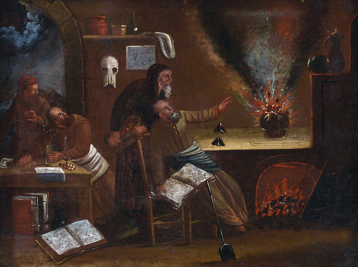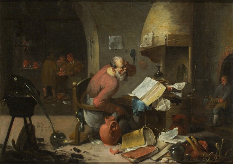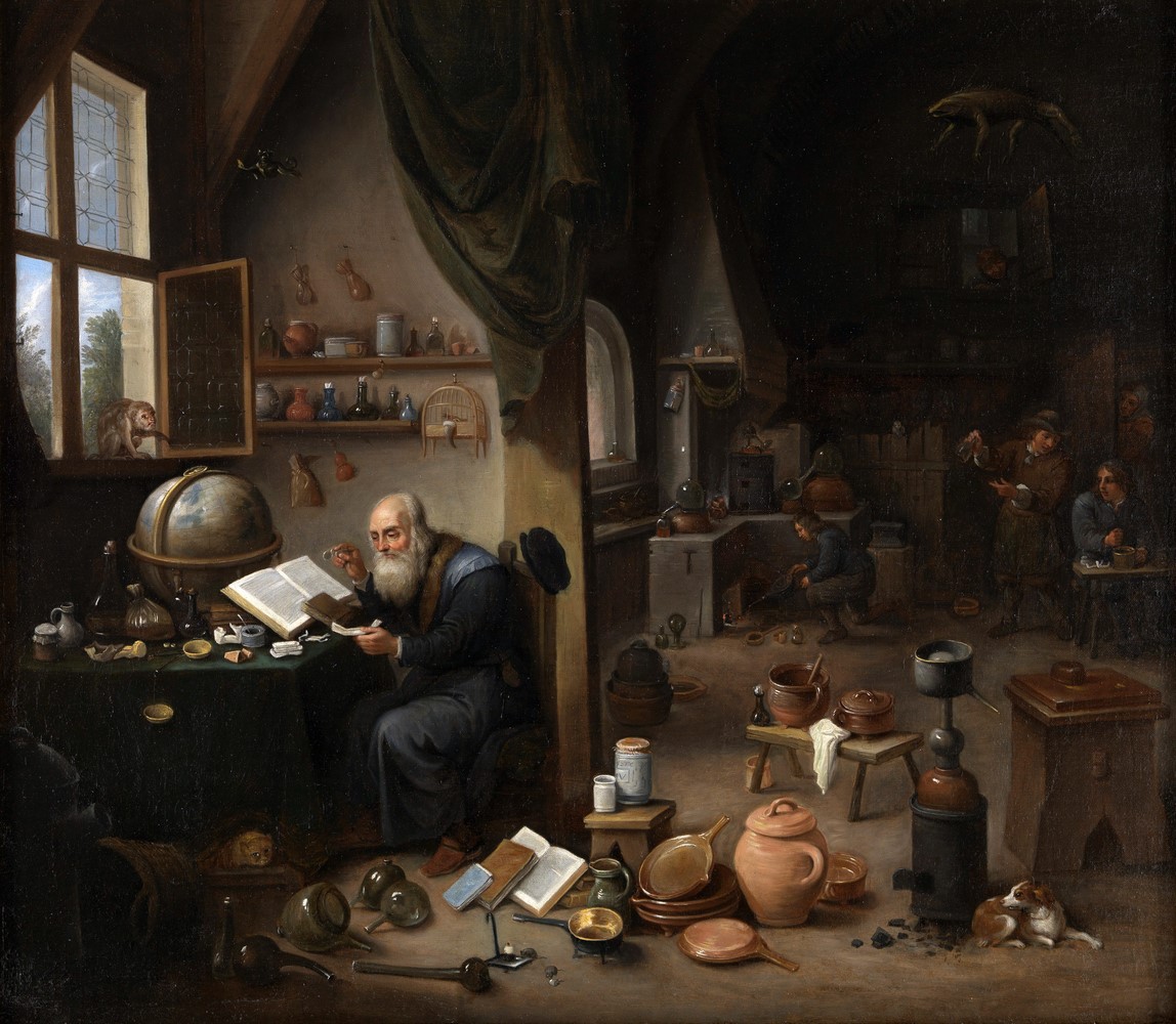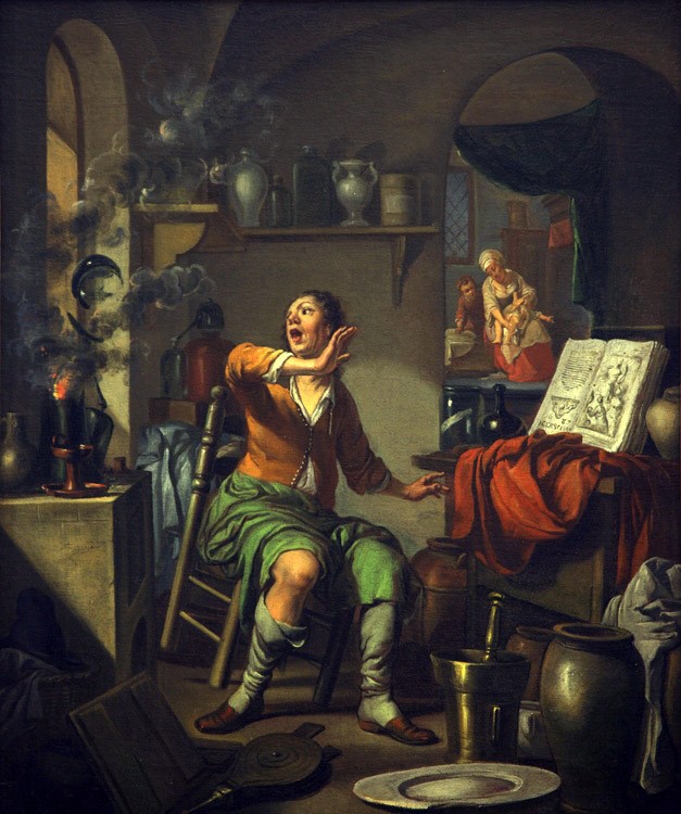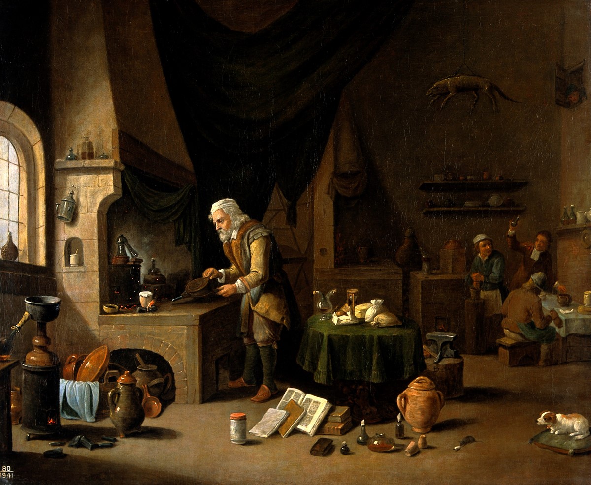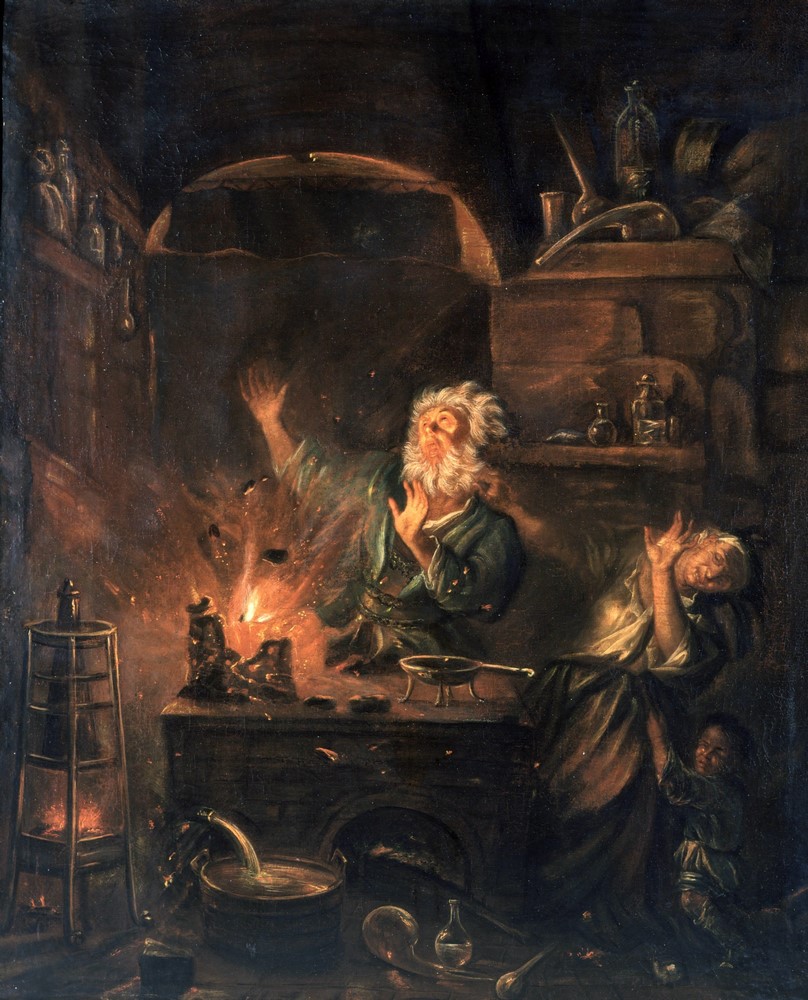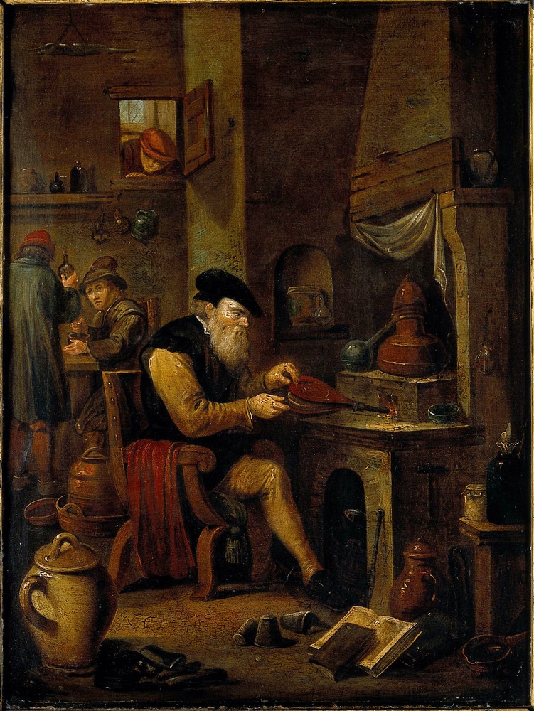 Commentaire : Le nom complet de la toile est : L’alchimiste, à la recherche de la pierre philosophale, découvre le phosphore, et prie pour la réussite de son expérience, comme c’était la coutume des anciens astrologues chimistes. En référence au nom de l’œuvre, certains estiment que le tableau représenterait Hennig Brandt, découvreur du phosphore en 1669.