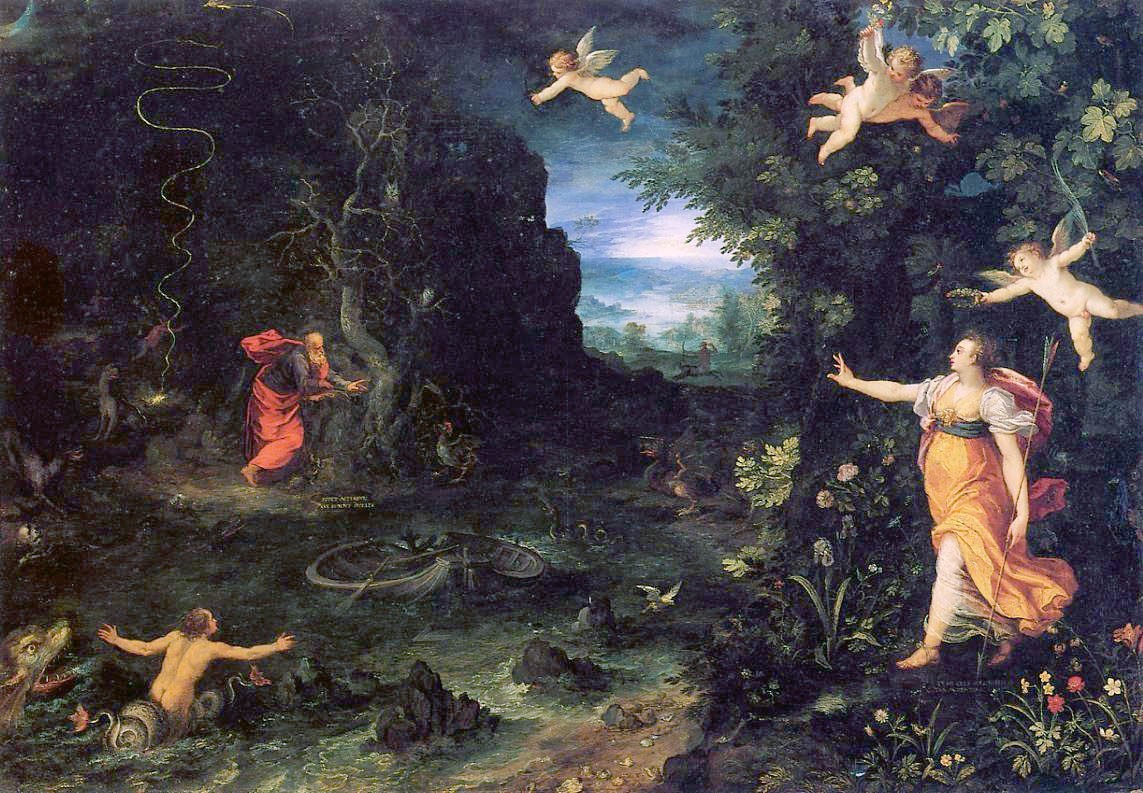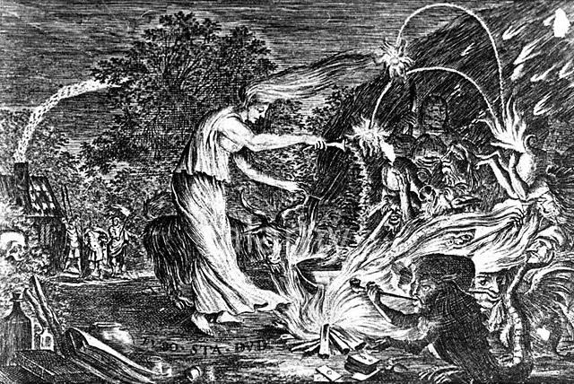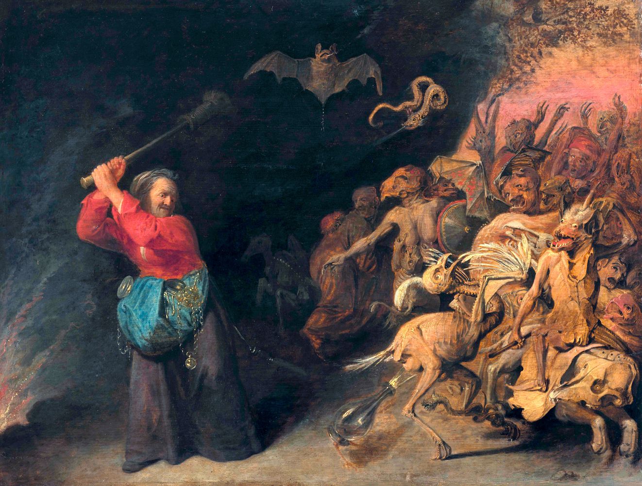 Commentaire : La 'Dulle Griet' (ou 'Margaret la folle') n'est pas une sorcière au sens strict mais l'archétype de la femme castratrice, acariâtre et pingre qui n'a peur de rien ni personne, fussent-t-ils le Diable lui-même. On la voit ici pénétrer en Enfer pour récupérer du butin, mettant les démons en fuite en brandissant son balais.
