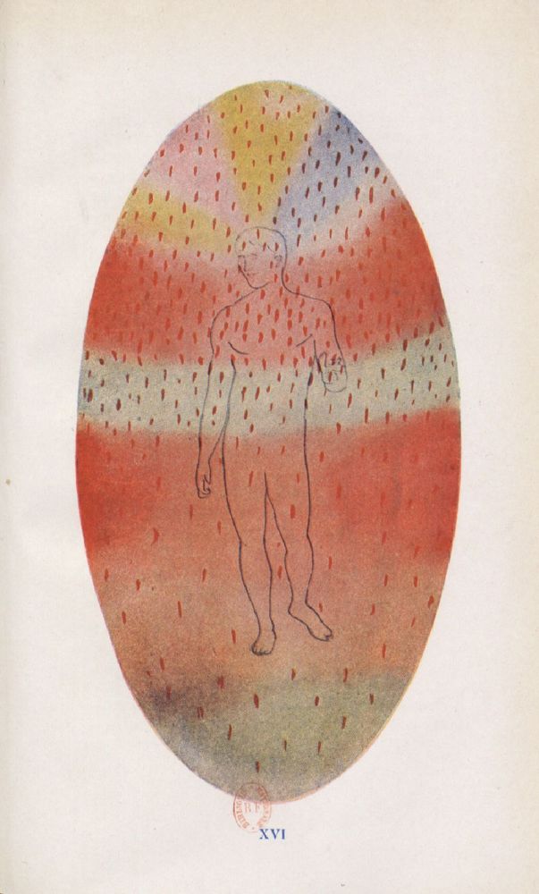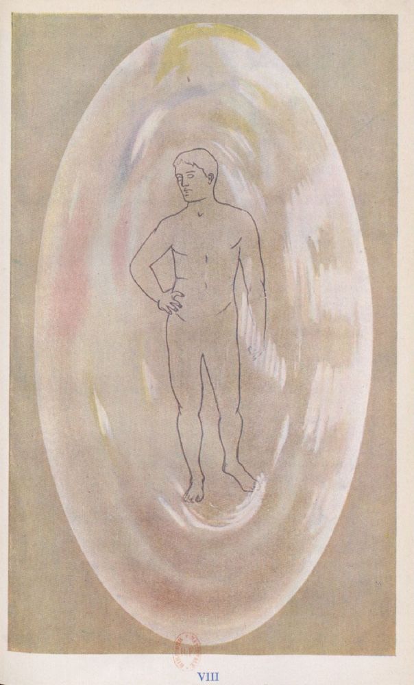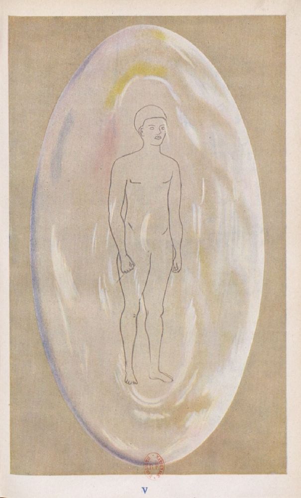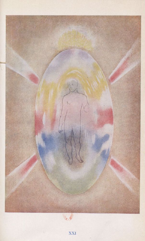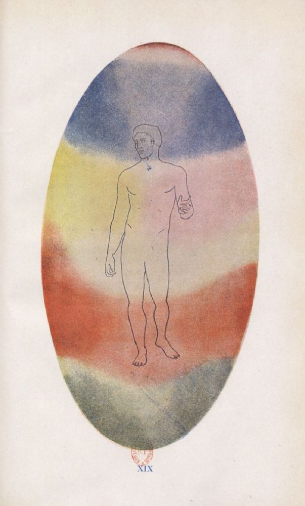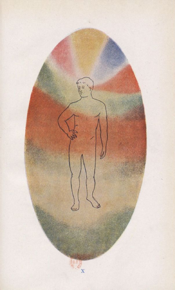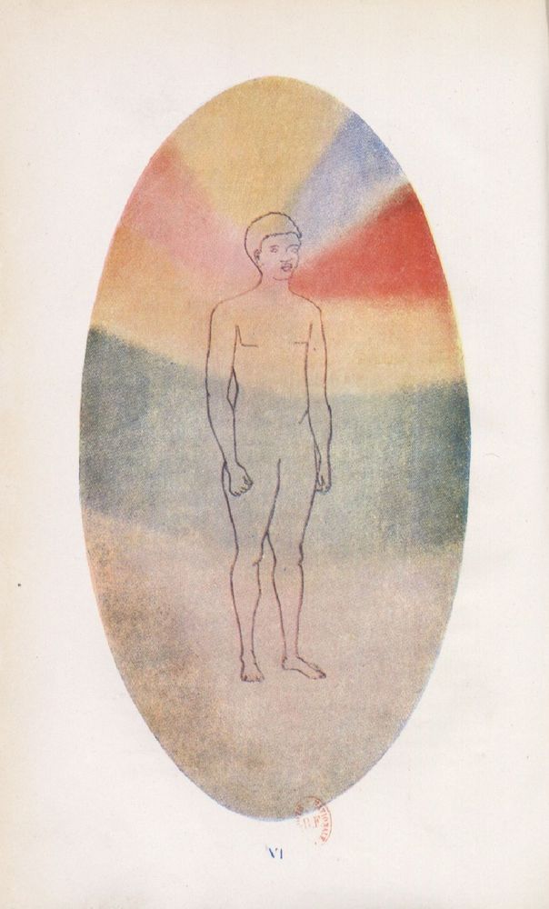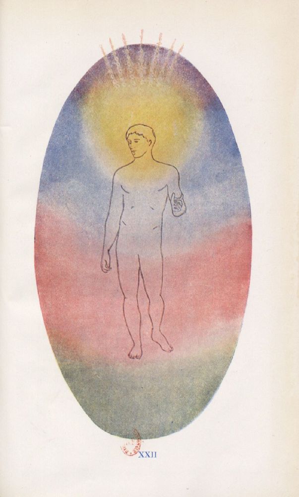 Note du traducteur: Le rendement des illustrations de cet ouvrage, par la photochromogravure, n’a pas donné tout ce que l’auteur en attendait. Pour ceux qui ont eu la bonne fortune d’examiner les illustrations originales, il semble, de prime-abord, que la reproduction en a accentué les oppositions et les contours et atténué par contre le fondu et ce quelque chose de vivant qui caractérisait les originaux. Cet ouvrage n’en présente pas moins un intérêt capital, car c’est le premier qui nous permette, avec l’aide de nos sens limités, de nous faire une idée approximative des véhicules subtils de l’âme tels qu’ils peuvent être observés par un clairvoyant exercé.