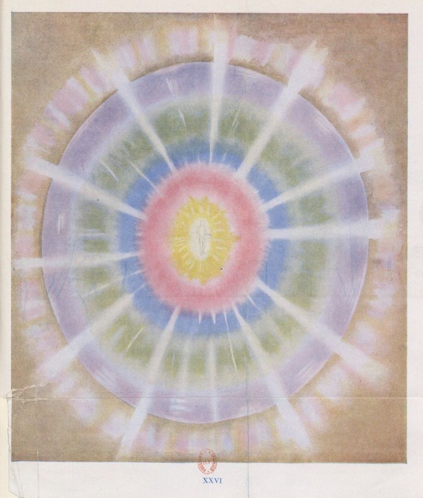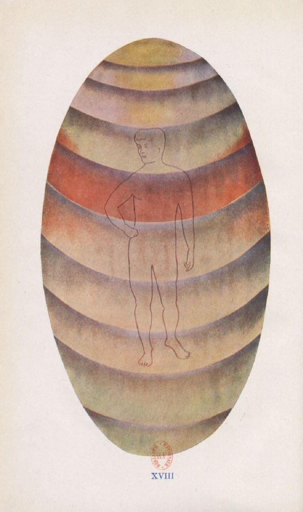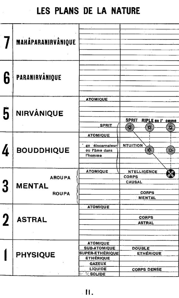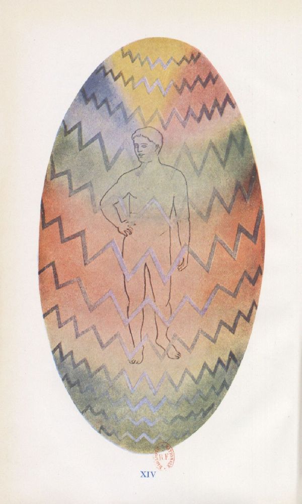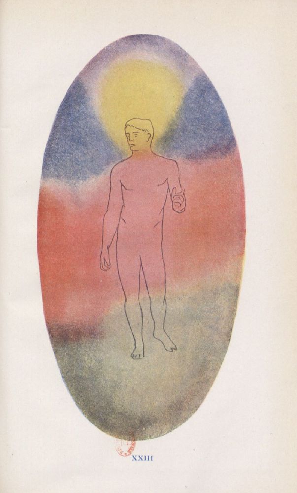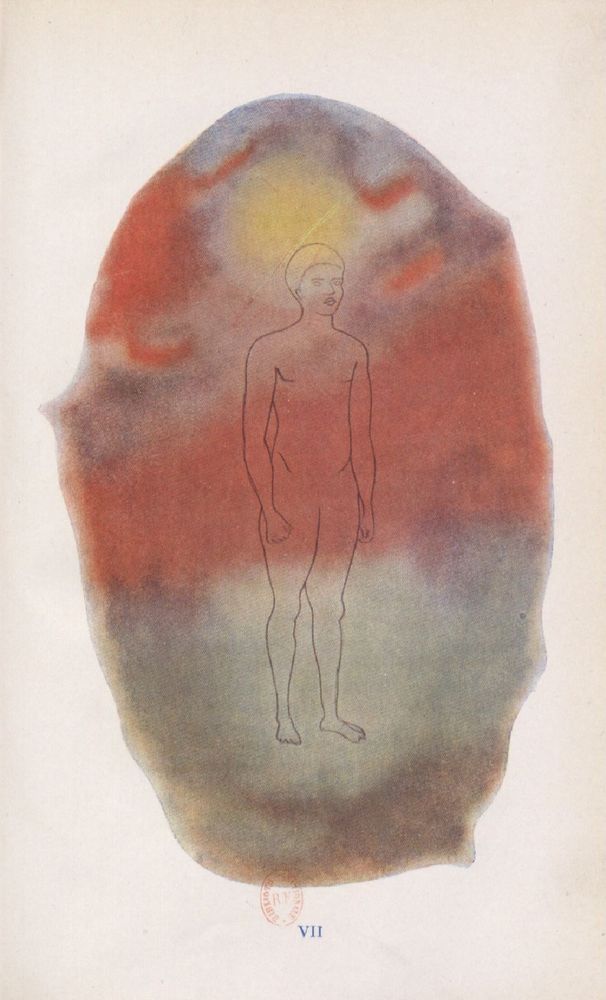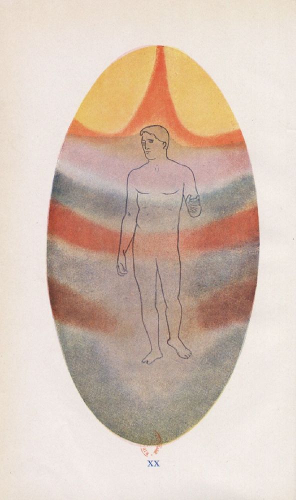 Note du traducteur: Le rendement des illustrations de cet ouvrage, par la photochromogravure, n’a pas donné tout ce que l’auteur en attendait. Pour ceux qui ont eu la bonne fortune d’examiner les illustrations originales, il semble, de prime-abord, que la reproduction en a accentué les oppositions et les contours et atténué par contre le fondu et ce quelque chose de vivant qui caractérisait les originaux. Cet ouvrage n’en présente pas moins un intérêt capital, car c’est le premier qui nous permette, avec l’aide de nos sens limités, de nous faire une idée approximative des véhicules subtils de l’âme tels qu’ils peuvent être observés par un clairvoyant exercé.