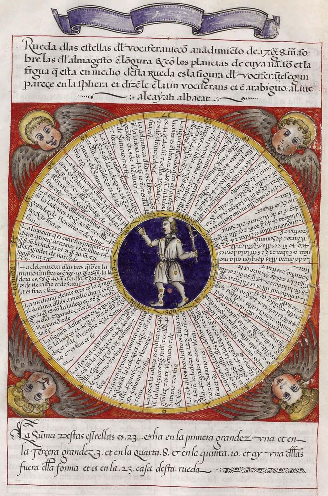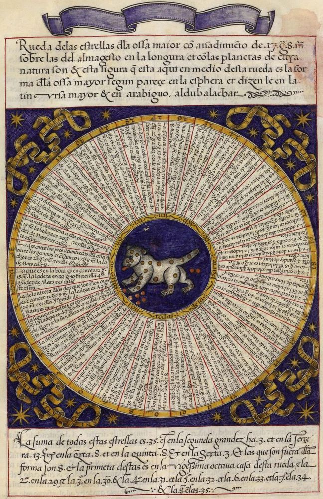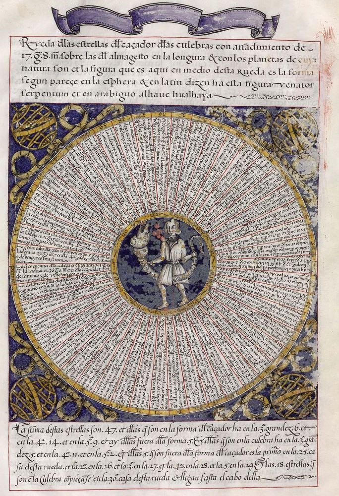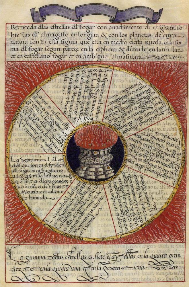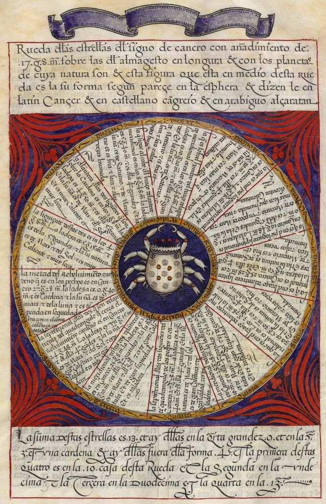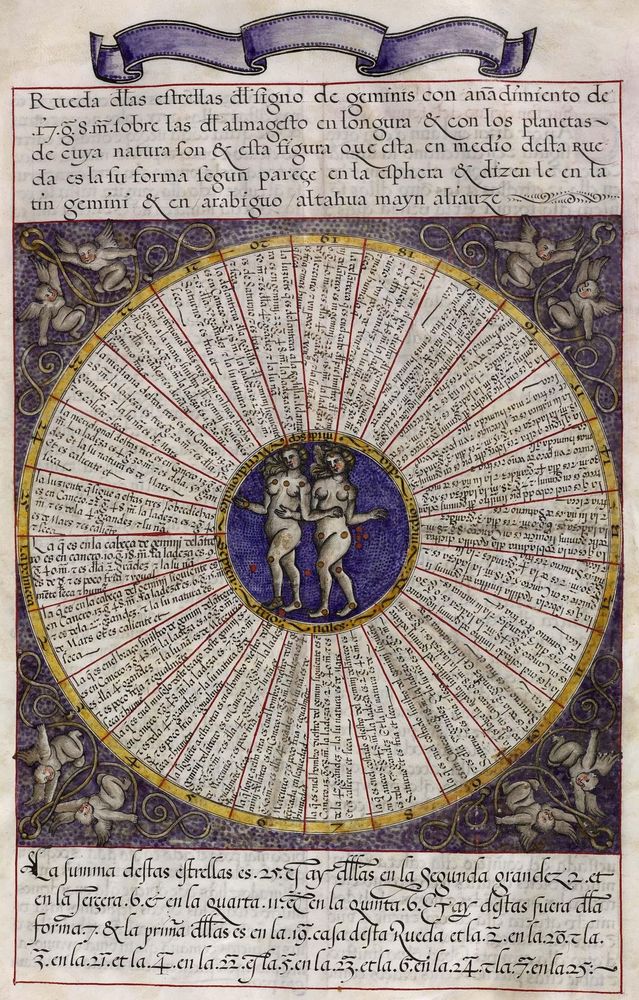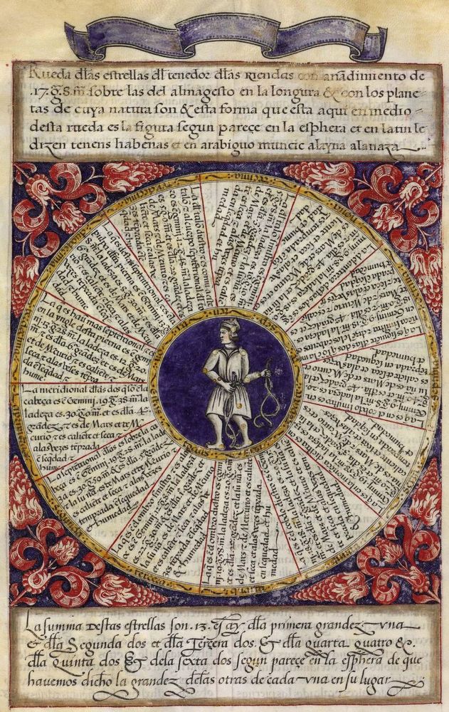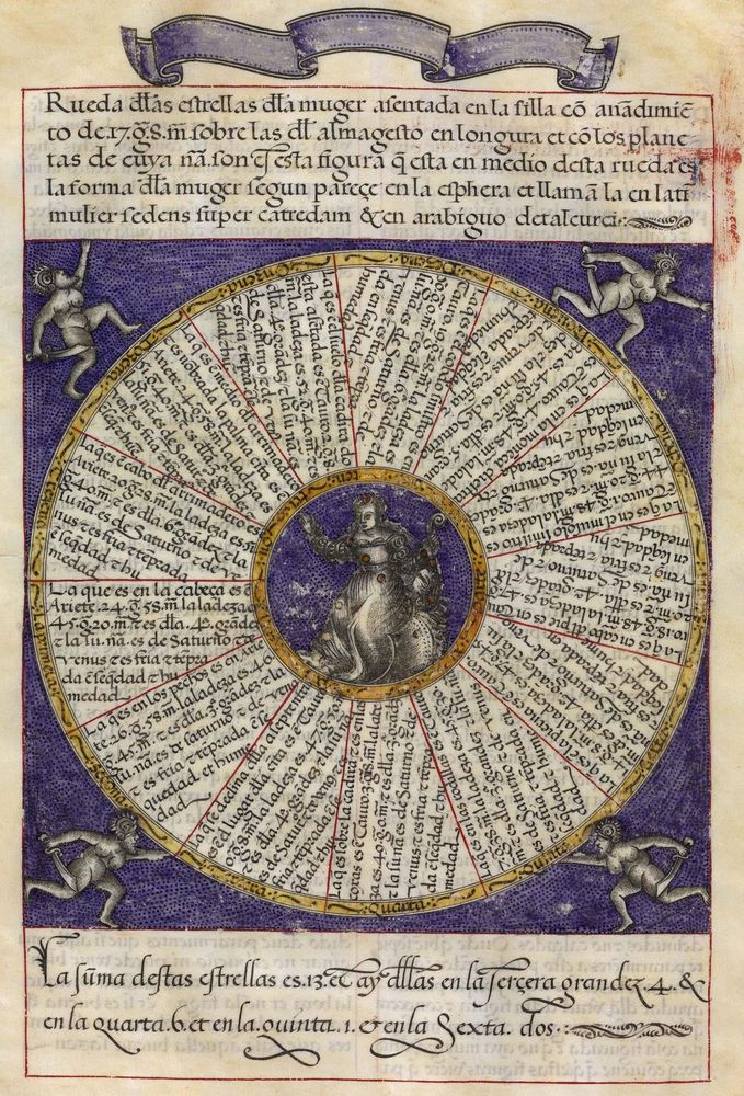► Ouvrage célèbre à l’origine du renouveau astrologique européen, il fit la notoriété d’Alphonse X et eu de nombreuses éditions à partir d’une copie française de 1320. Il se veut un nouvel établissement des connaissances de l’époque en mettant à profit Ptolémée et les passeurs arabes comme le Livre des étoiles fixes d’Azophi {Abd al-Rahman al-Soufi} ou les travaux d’Azarchel {Al-Zarqali}.