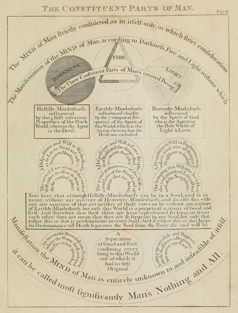 ► William Law illustra sa compréhension du commentaire de son maître Dionysius Freher sur l’œuvre de Böhme, par trois séries de figures(1) représentant l’Homme avant sa chute, après sa chute et lors de sa régénération. Les trois séries représentent de même, le corps, l’âme፧ et l’esprit.