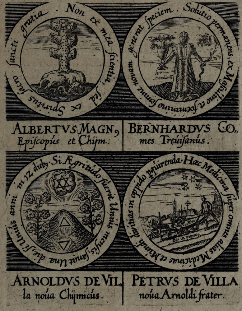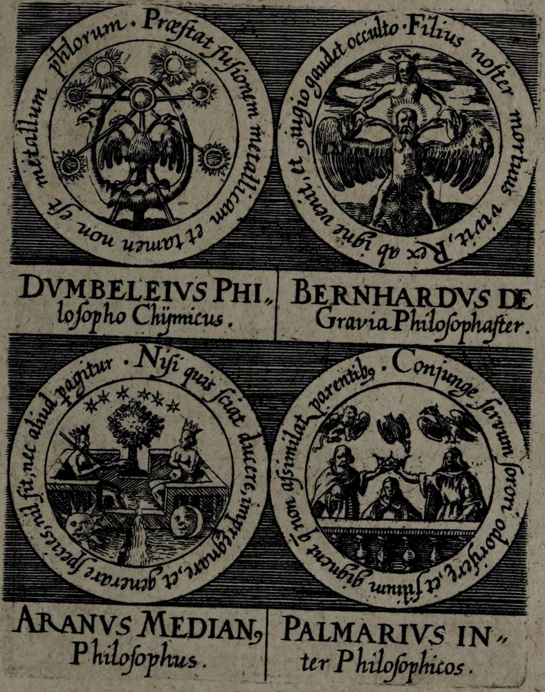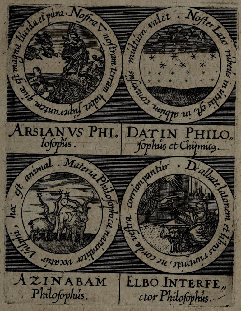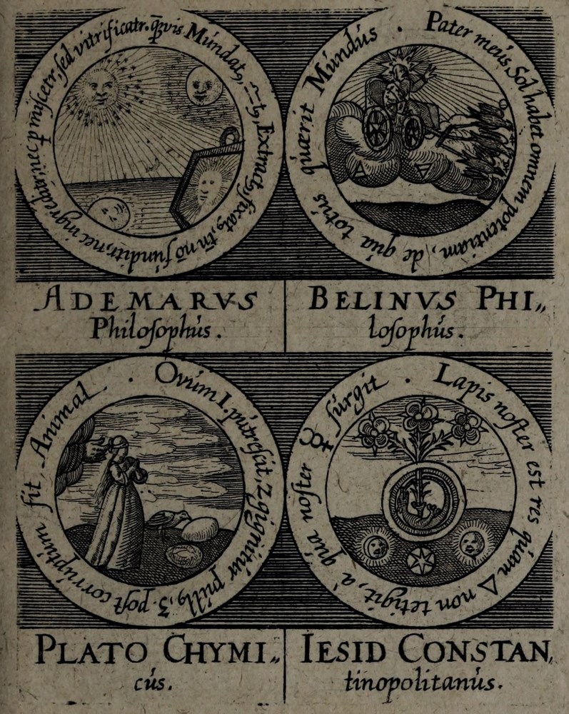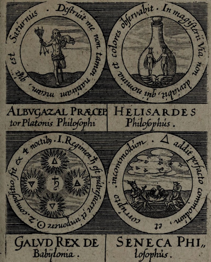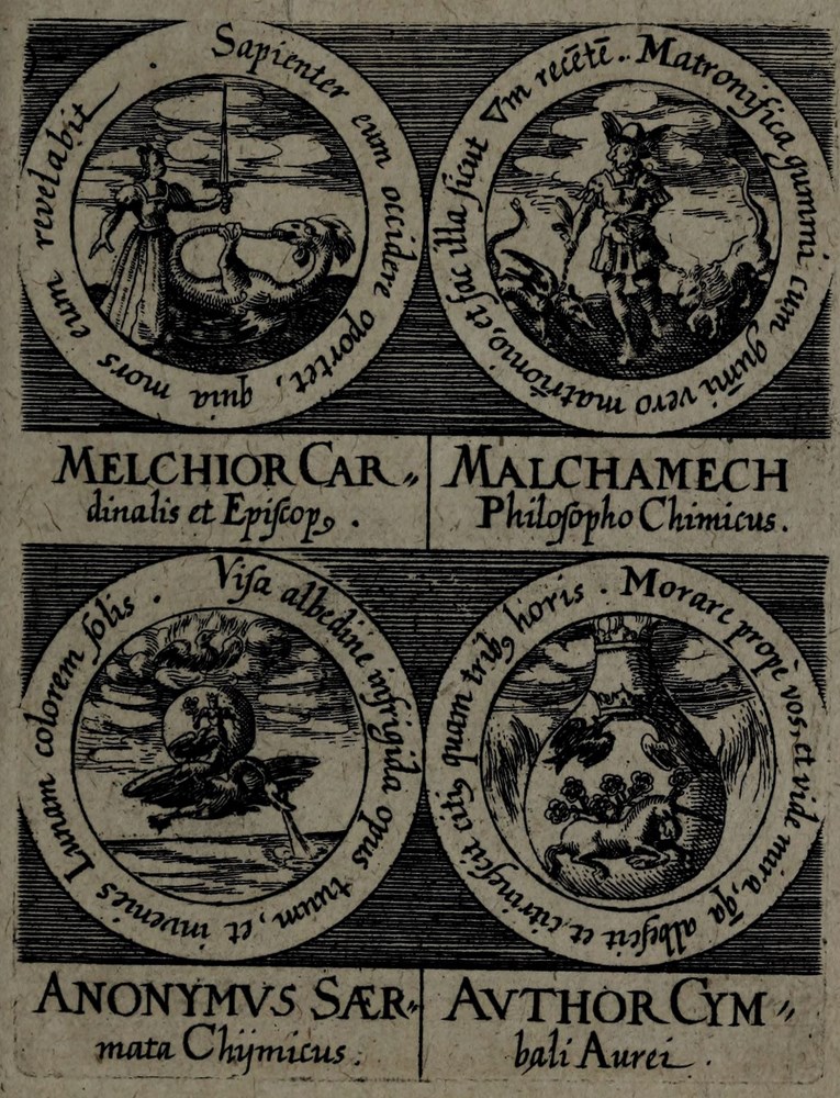 ► On retrouve dans les sceaux, chacun attribué à un auteur alchimique, quelques originalités comme des illustrations d’alchimistes tel Cléopatre, mais aussi des reprises de nombreux traités antérieurs comme Azoth, le Très précieux don de Dieu ou encore le Livre de la Sainte Trinité.