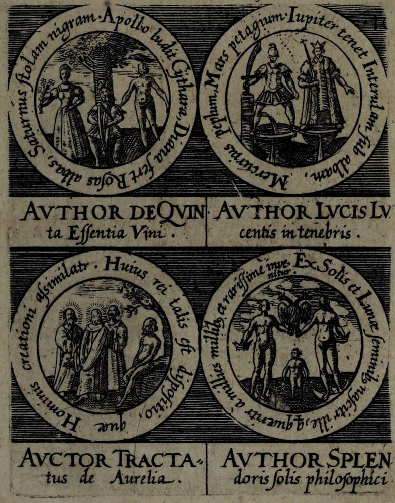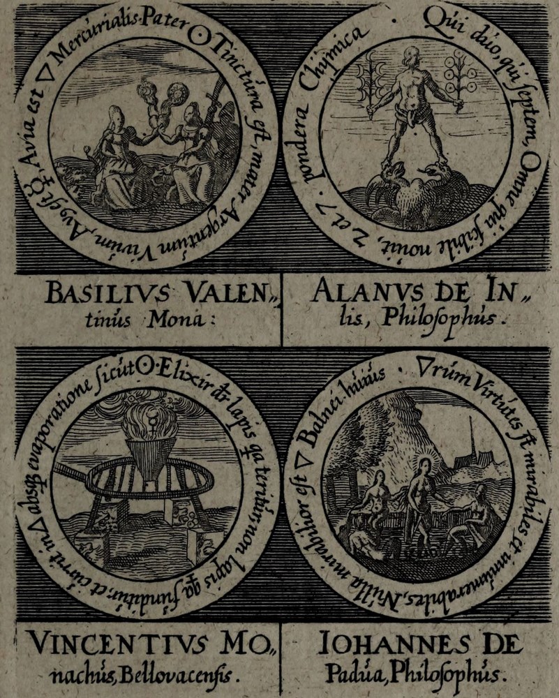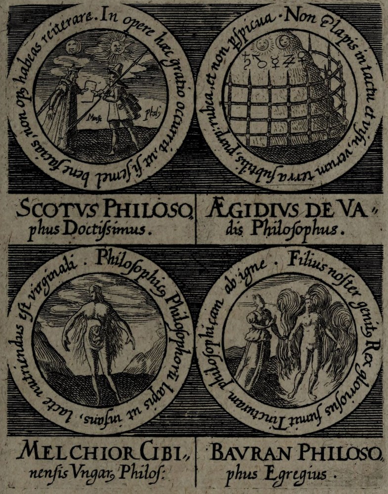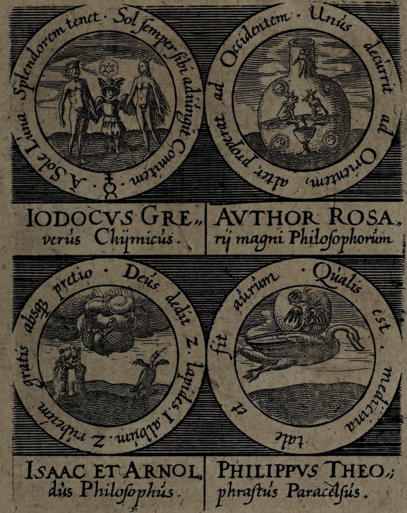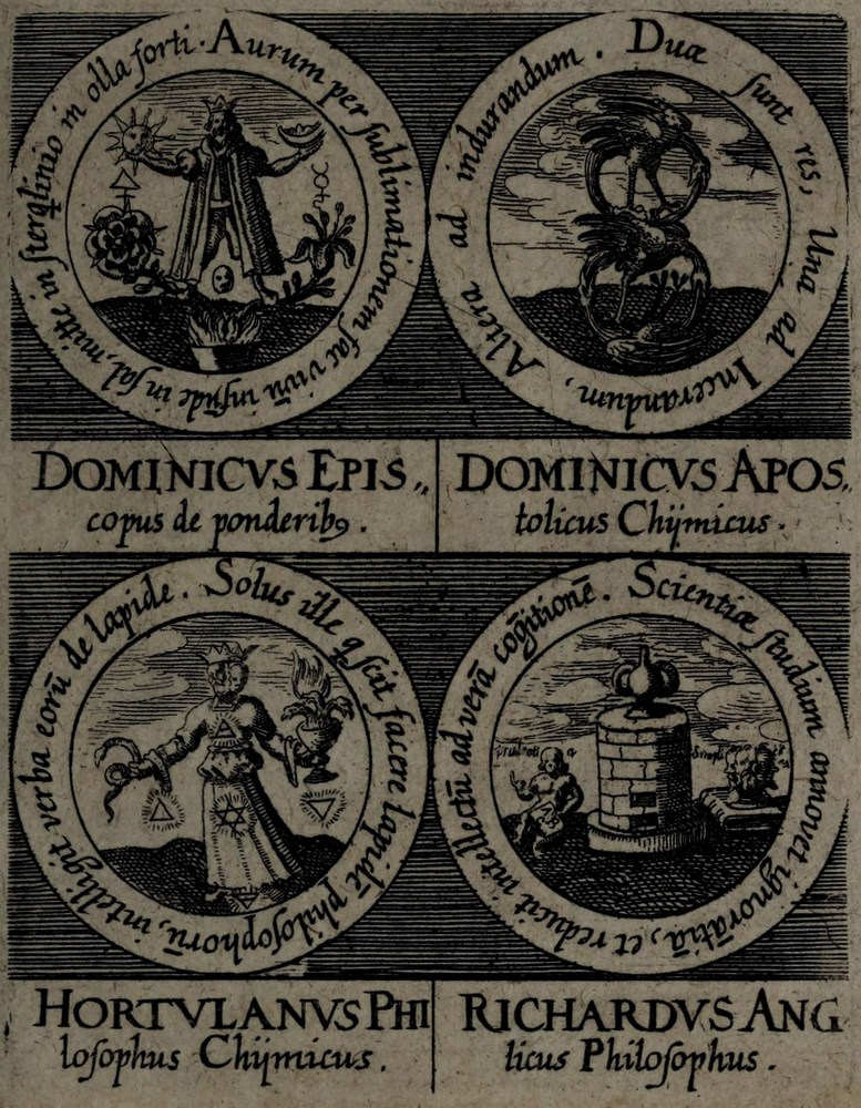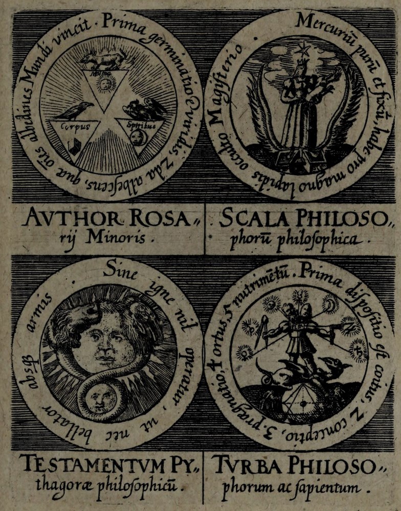 ► On retrouve dans les sceaux, chacun attribué à un auteur alchimique, quelques originalités comme des illustrations d’alchimistes tel Cléopatre, mais aussi des reprises de nombreux traités antérieurs comme Azoth, le Très précieux don de Dieu ou encore le Livre de la Sainte Trinité.
