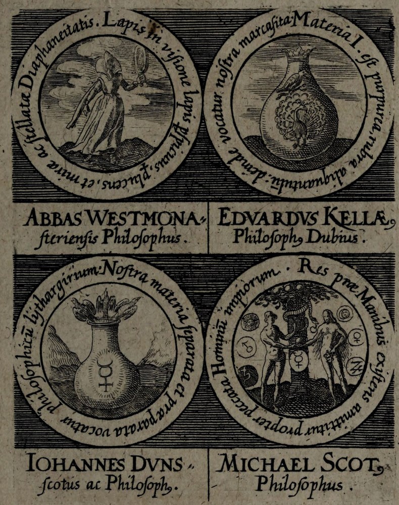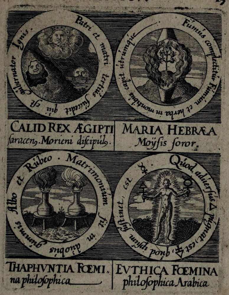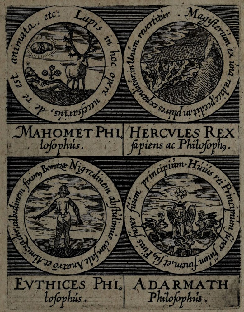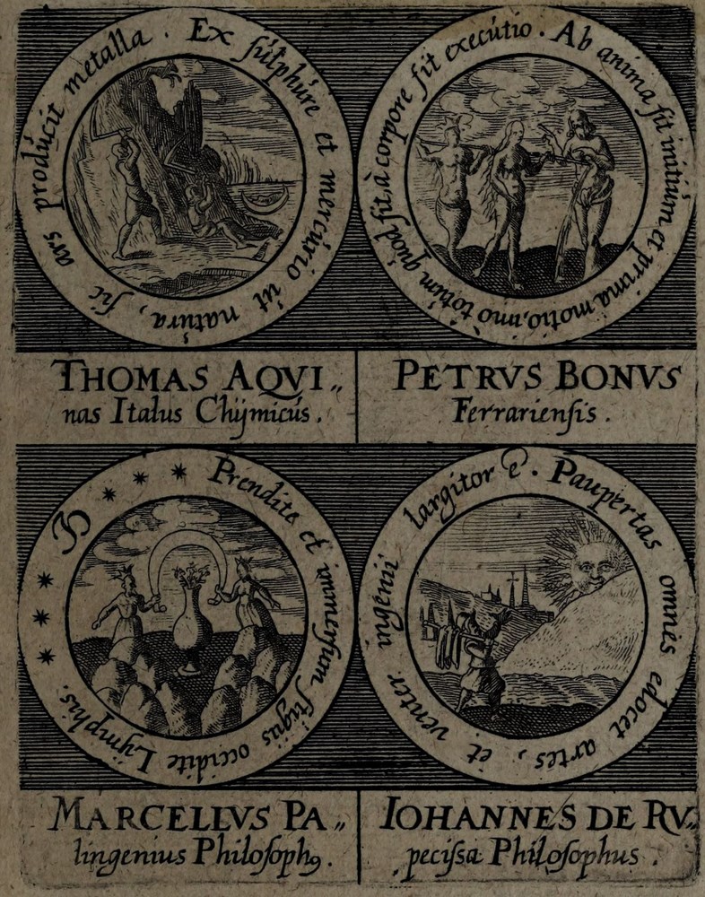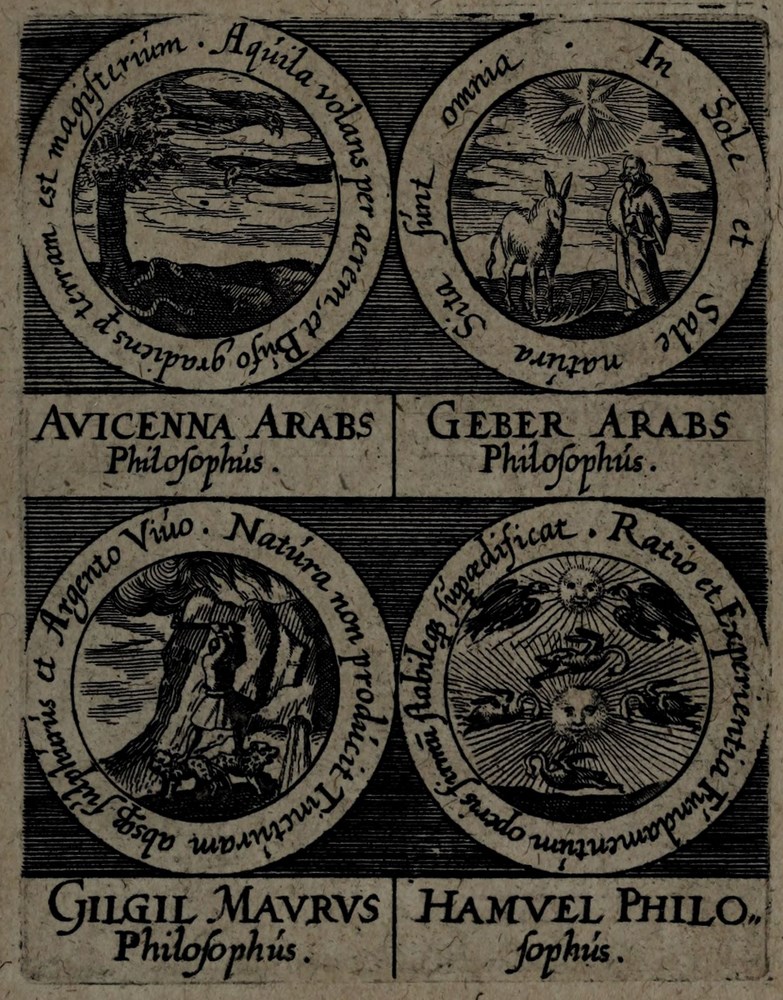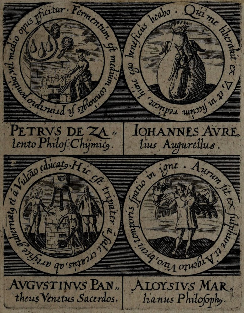 ► On retrouve dans les sceaux, chacun attribué à un auteur alchimique, quelques originalités comme des illustrations d’alchimistes tel Cléopatre, mais aussi des reprises de nombreux traités antérieurs comme Azoth, le Très précieux don de Dieu ou encore le Livre de la Sainte Trinité.