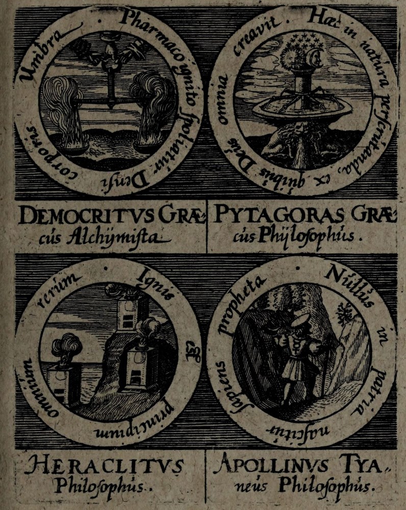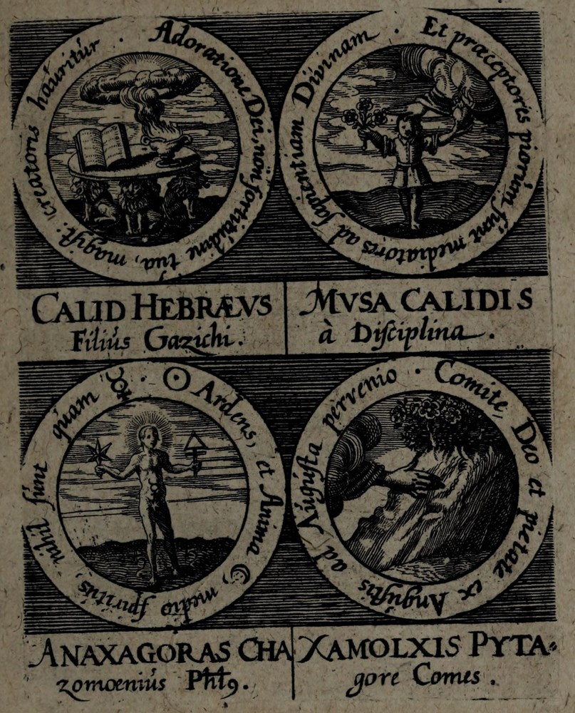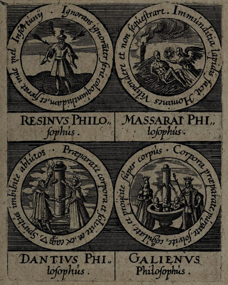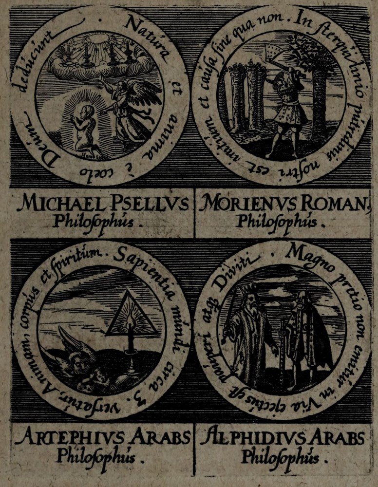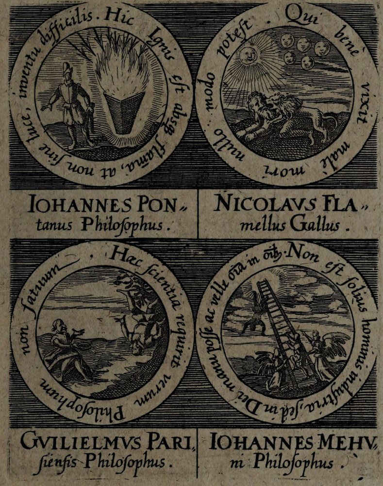 🕮 Lenglet Du Fresnoy, ref.772:2 : […] Ce sont de petits cartouches gravés en rond, d’un pouce de diamètre, où l’on représente des emblêmes, avec le nom du philosophe, dont elle est tirée, autour est une inscription, et au bas deux vers latins. Ce figures sont imprimées à la fin du tome II, de la Bibliothèque de Manget.