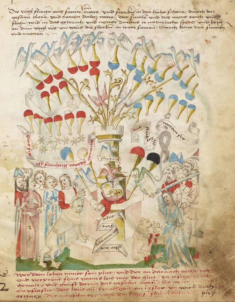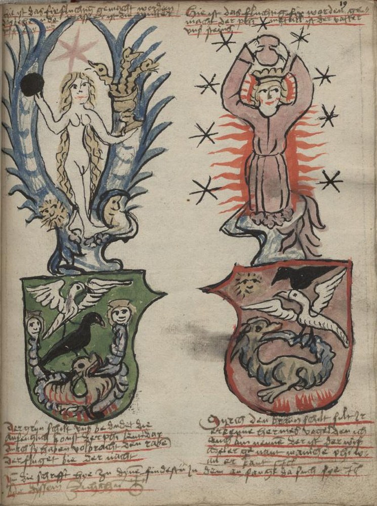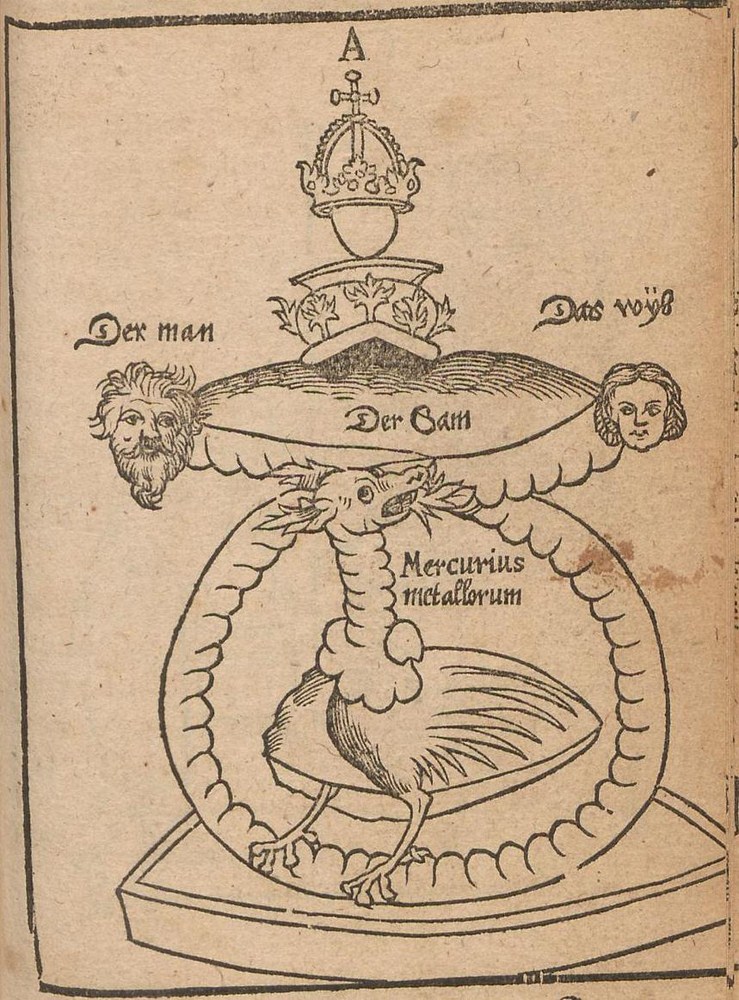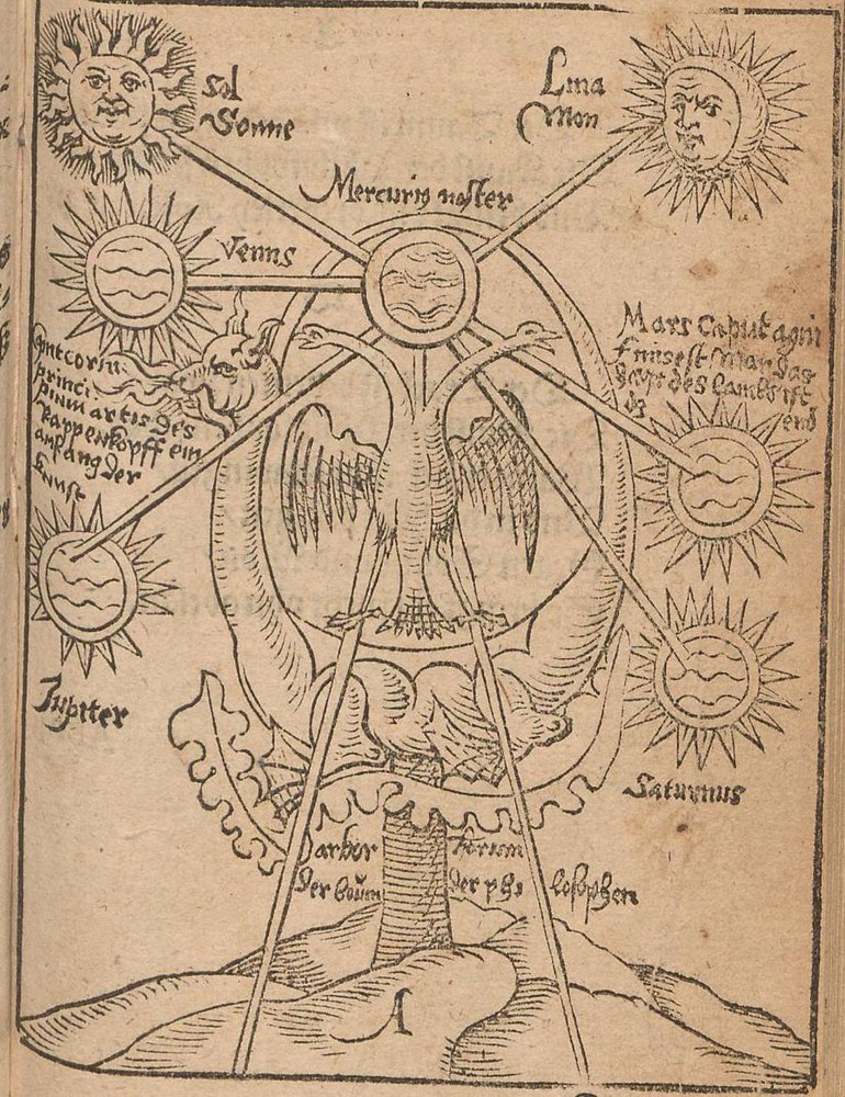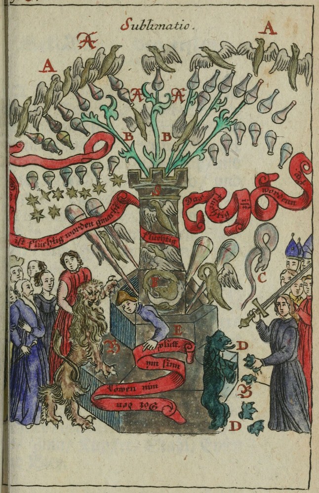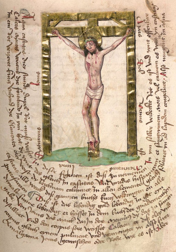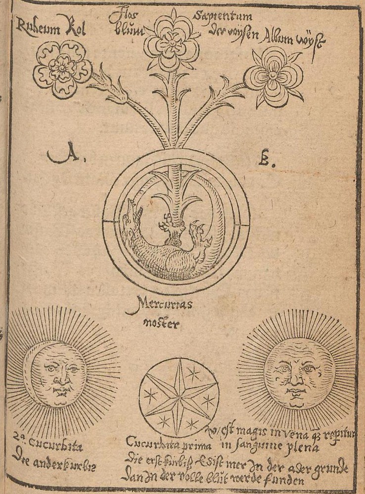 ► Ces illustrations sont d’ailleurs parmi les premières illustrations alchimiques accompagnant un texte, texte qui est également un des premiers de l’alchimie allemande dont on notera la symbolique chrétienne qui est ici omniprésente. Cette symbolique à été majoritairement expurgée par la suite dans les éditions ultérieures(2).