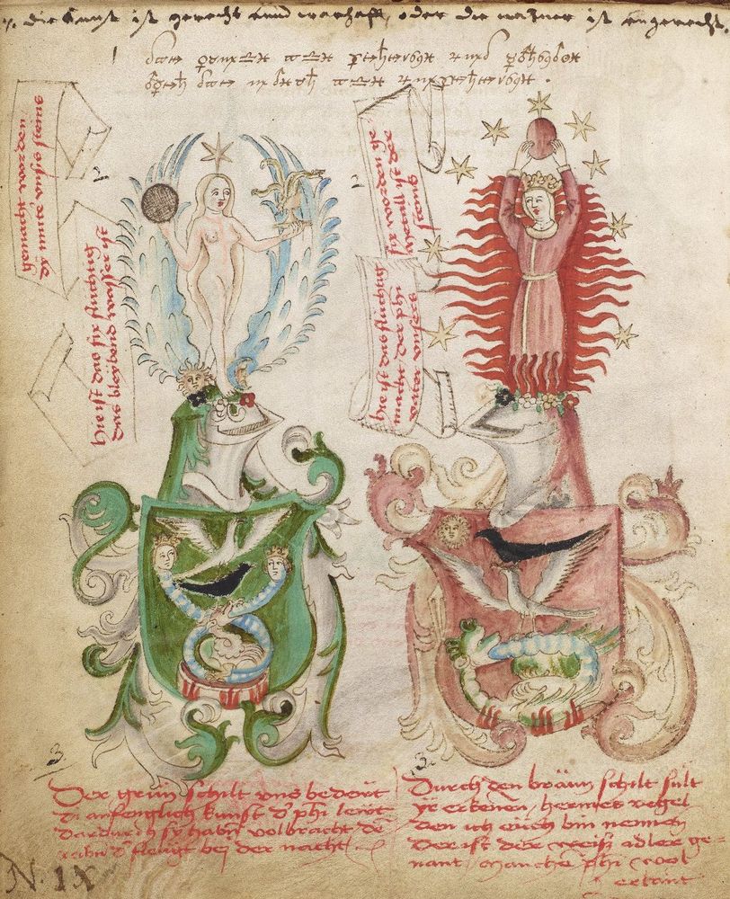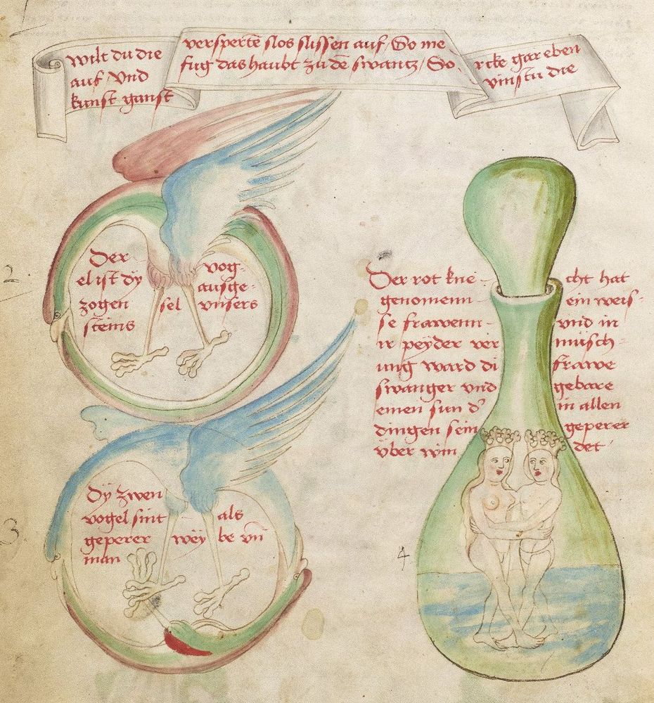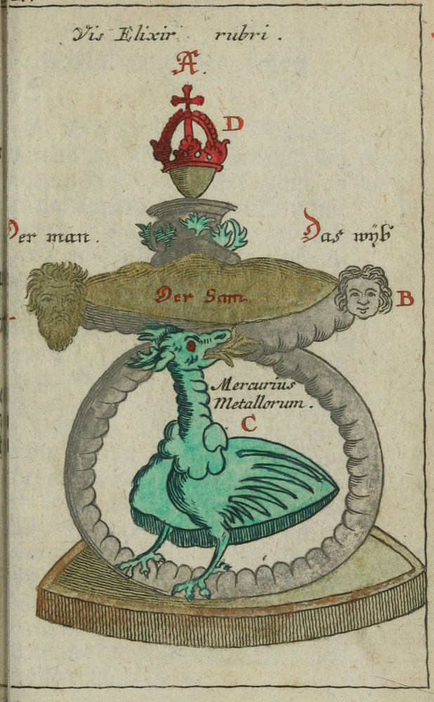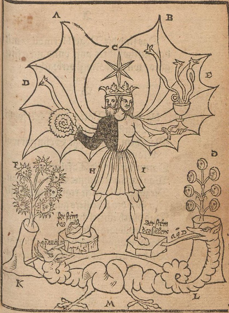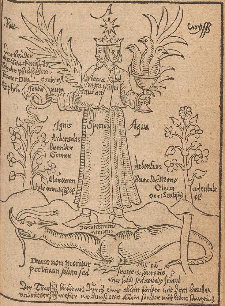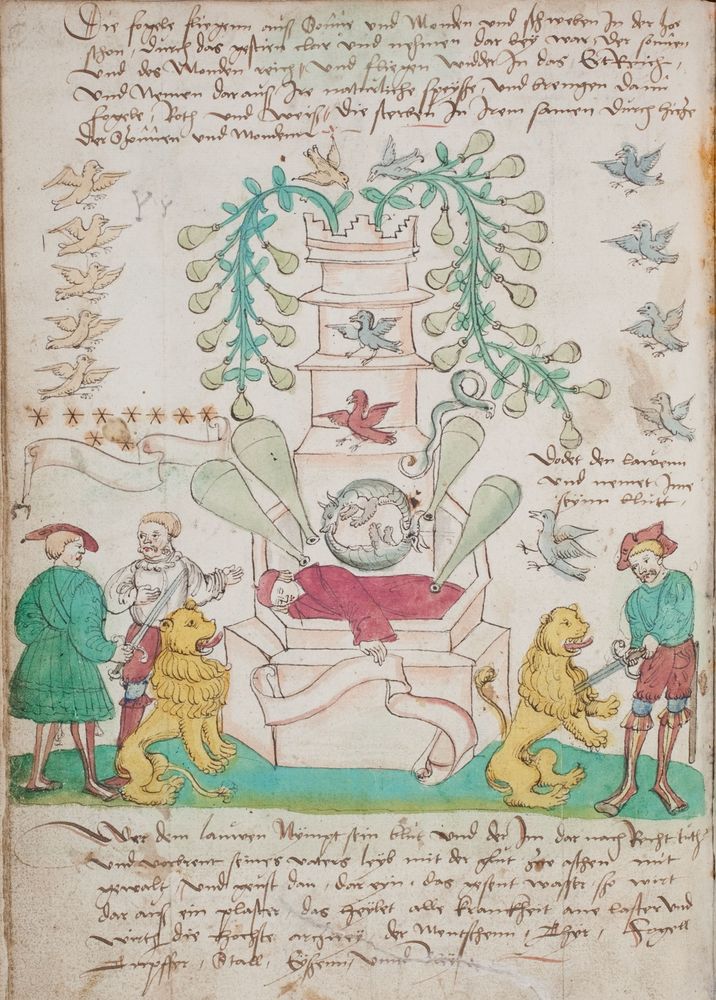► Ces illustrations sont d’ailleurs parmi les premières illustrations alchimiques accompagnant un texte, texte qui est également un des premiers de l’alchimie allemande dont on notera la symbolique chrétienne qui est ici omniprésente. Cette symbolique à été majoritairement expurgée par la suite dans les éditions ultérieures(2).