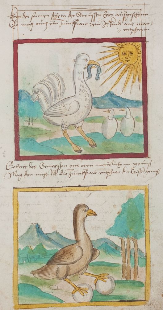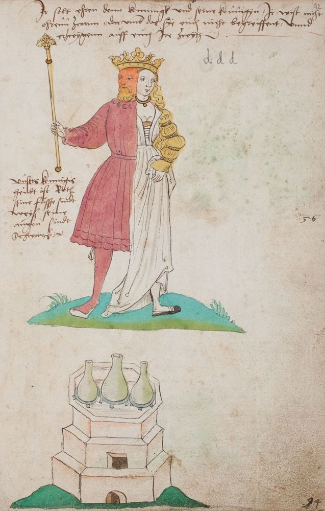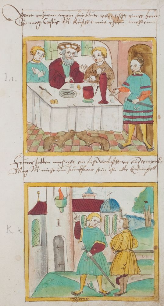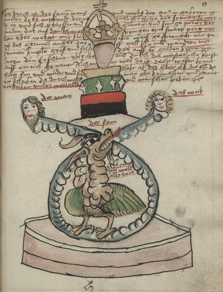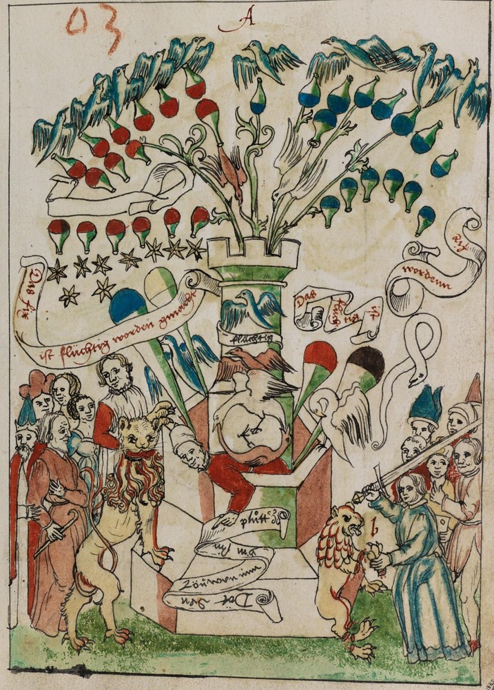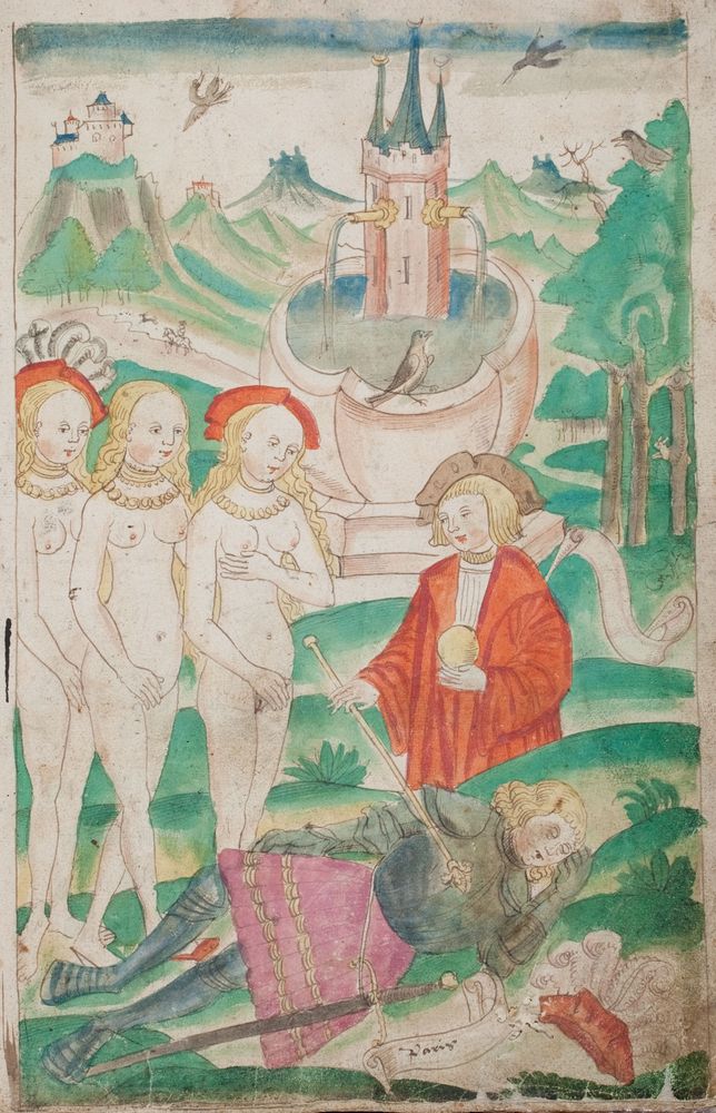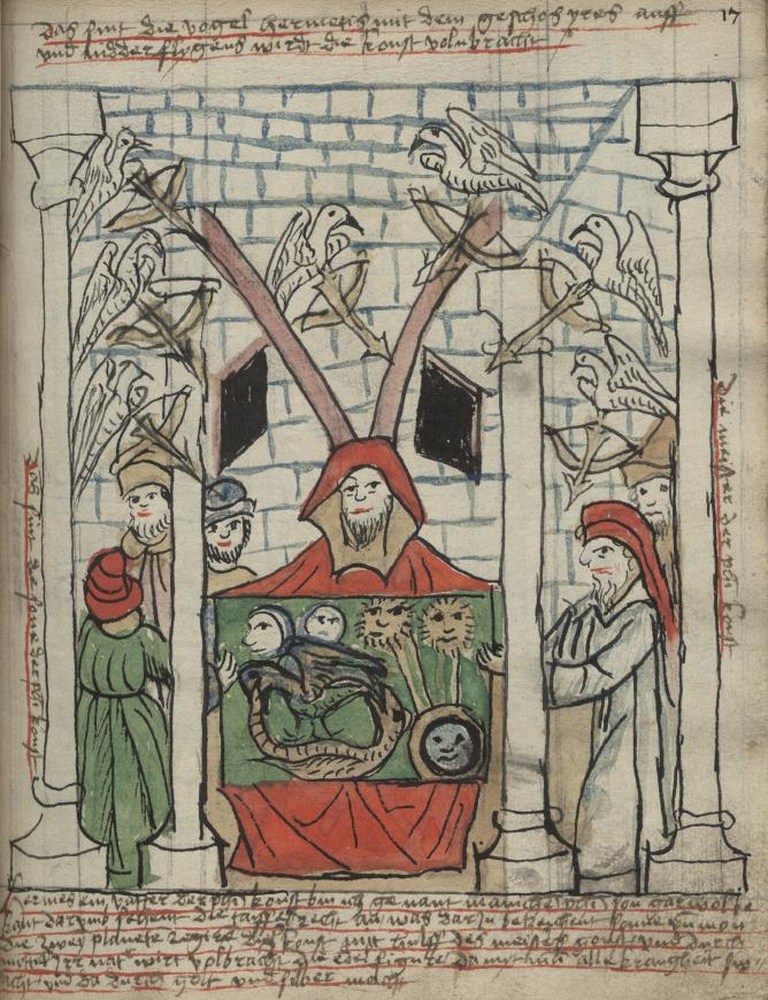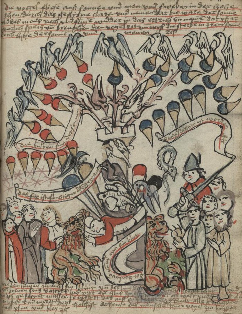 ► Il existe plusieurs copies du manuscrit(1) et un certain nombre d’éditions contiennent des illustrations : notamment celles de Munich (1467), Dresde (1492) et Cassel (1529) que nous avons ici reproduit. Il nous manque notablement le Cod.XXIII.D.135 de Prague (XV) et le VadSlg Ms 428 de Saint-Gall (1488)