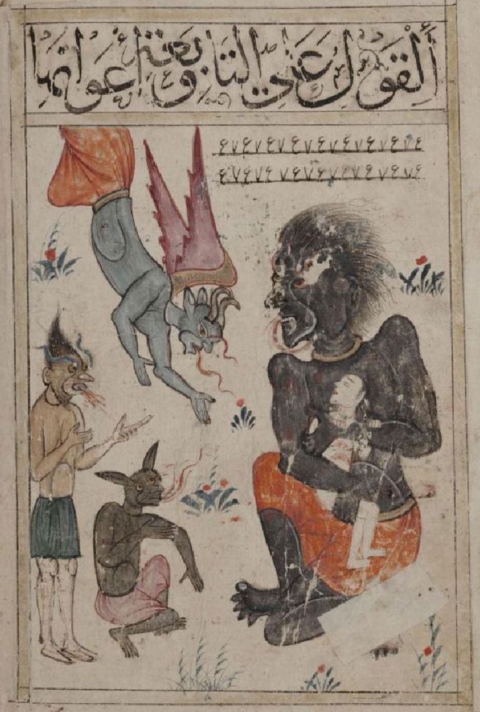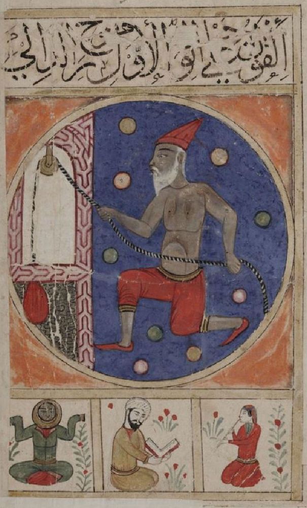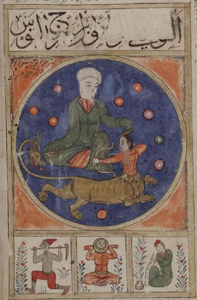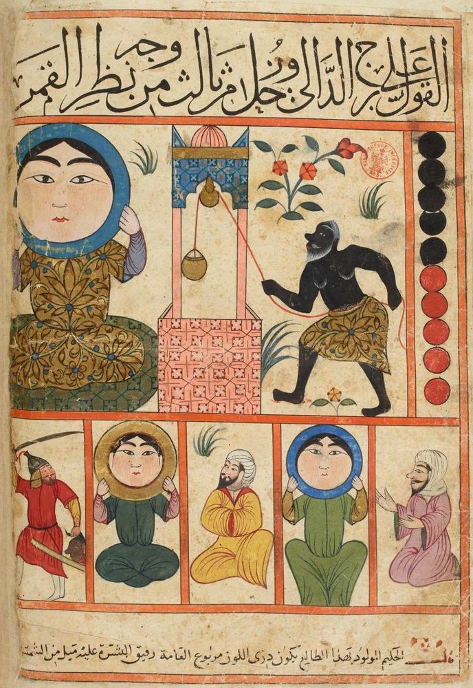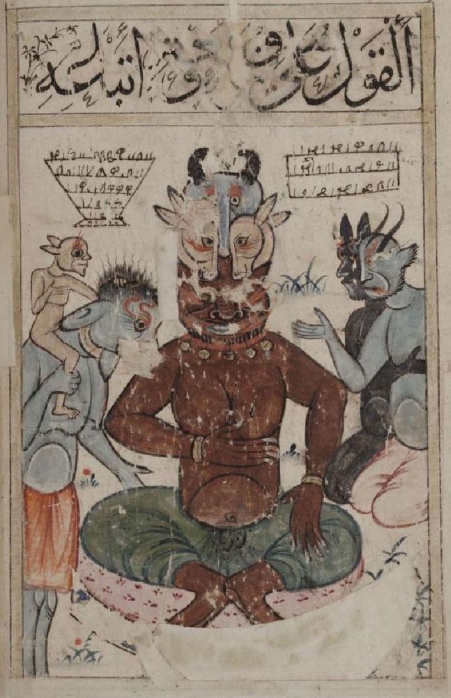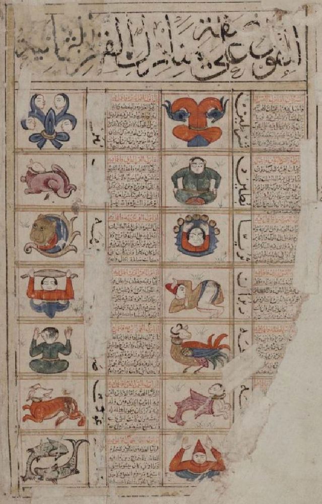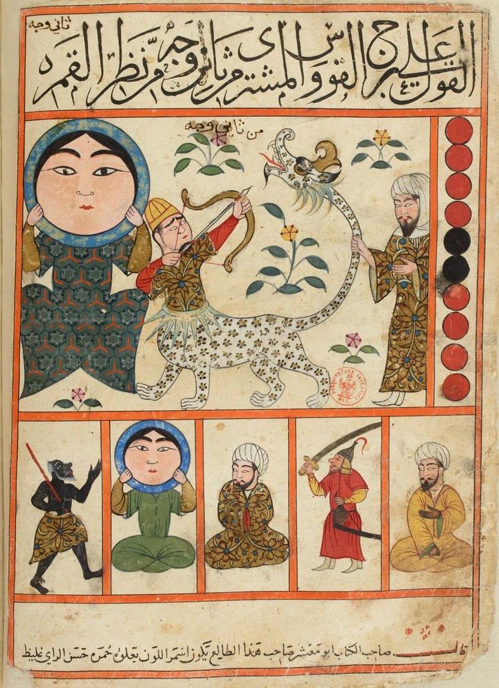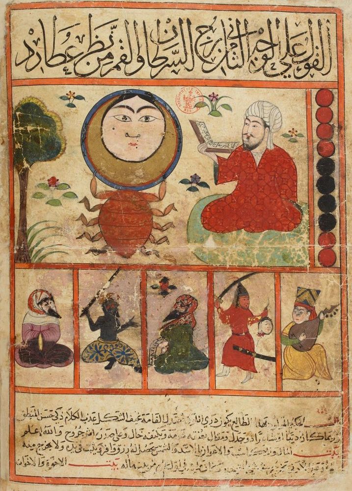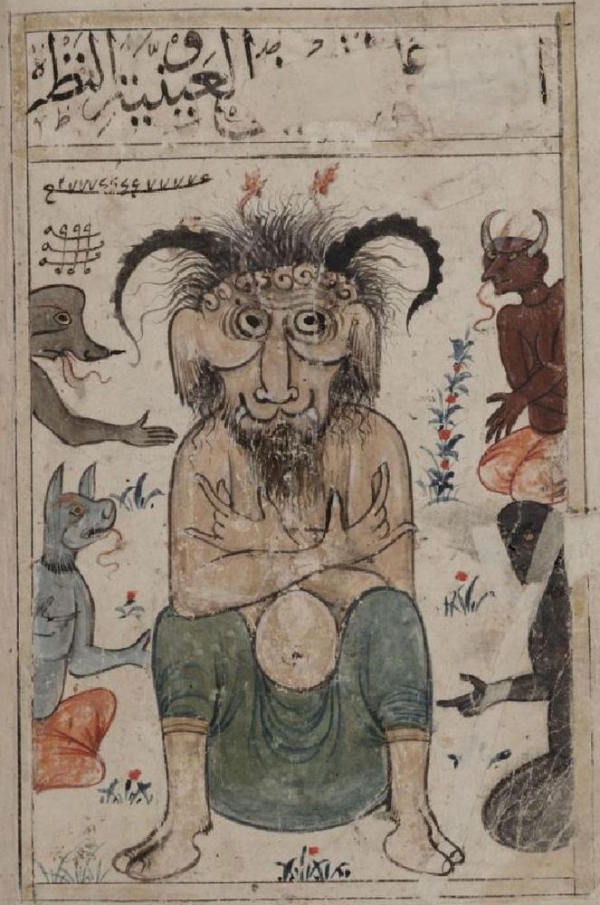 ► Cet ouvrage musulman, connu pour ses figurations de djinns est un recueil illustré de sciences occultes - principalement divinatoires -, attribué à Albumasar {Abou Ma’shar al-Balkhî}. Il contient des traités sur l’astronomie et l’astrologie፧, la géomancie et la talismanie, ainsi qu’une clef des songes, une Histoire merveilleuse du Prophète et un traité de divination attribué à Ja’far al-Sadiq contenant par exemple, un tableau physiognomonique. Certaines illustrations sont inspirées des célébrissimes Merveilles de la création.