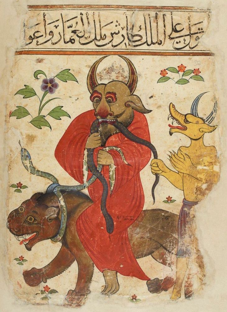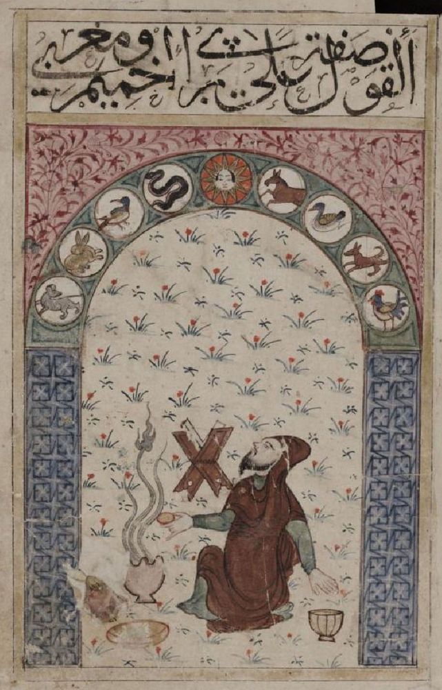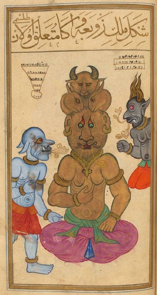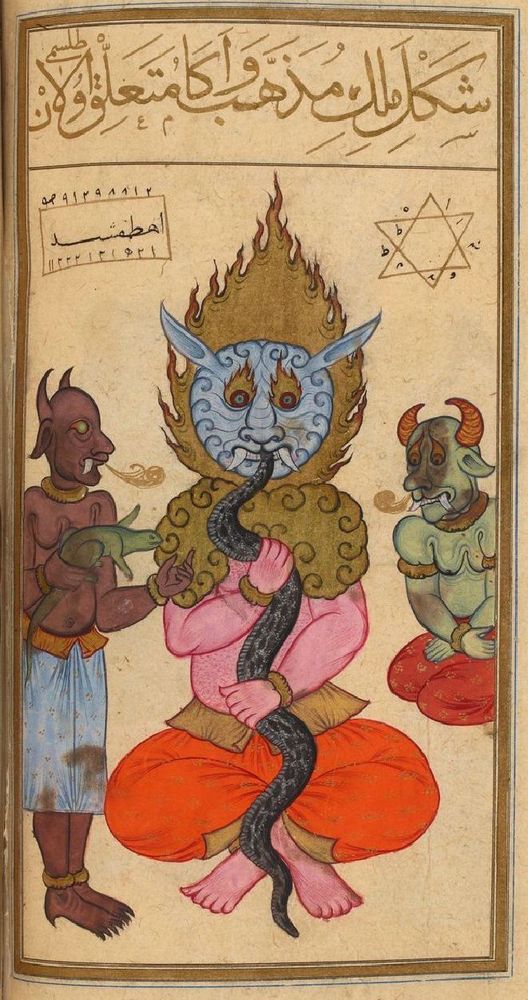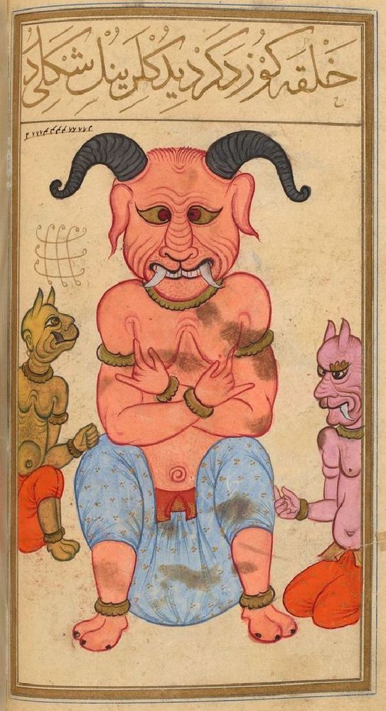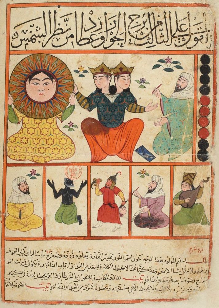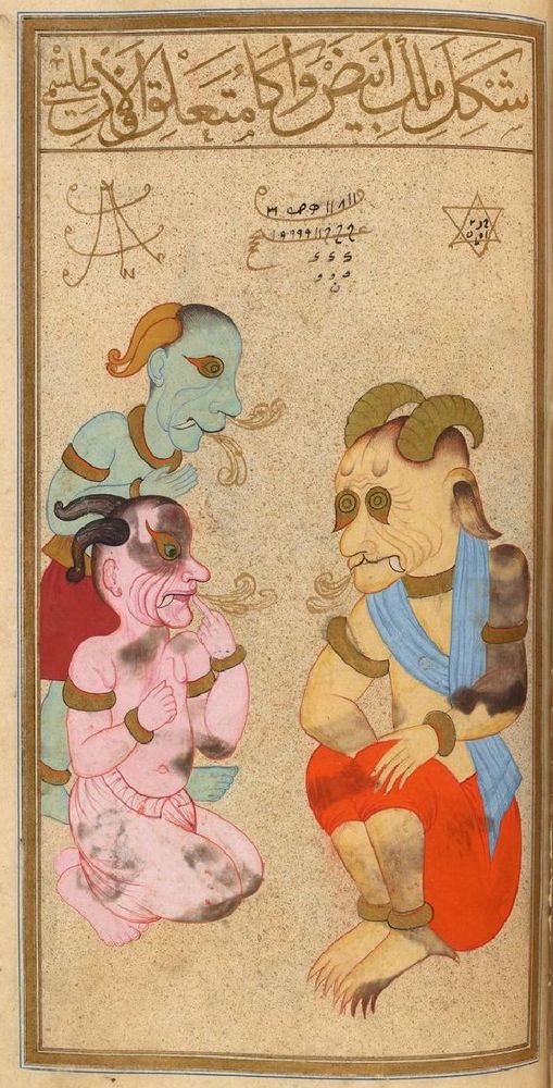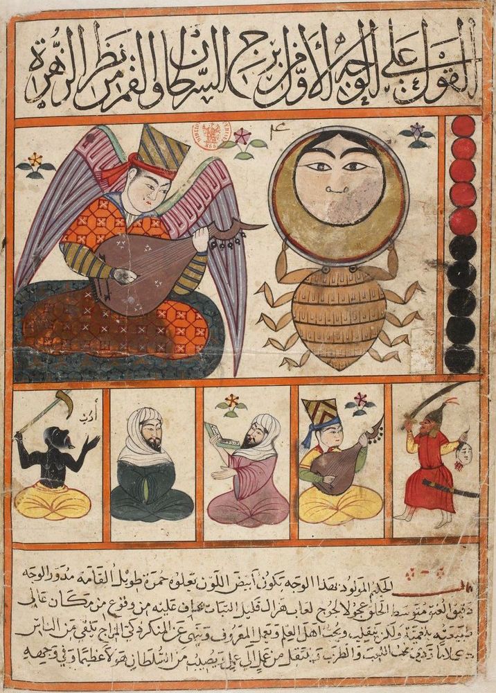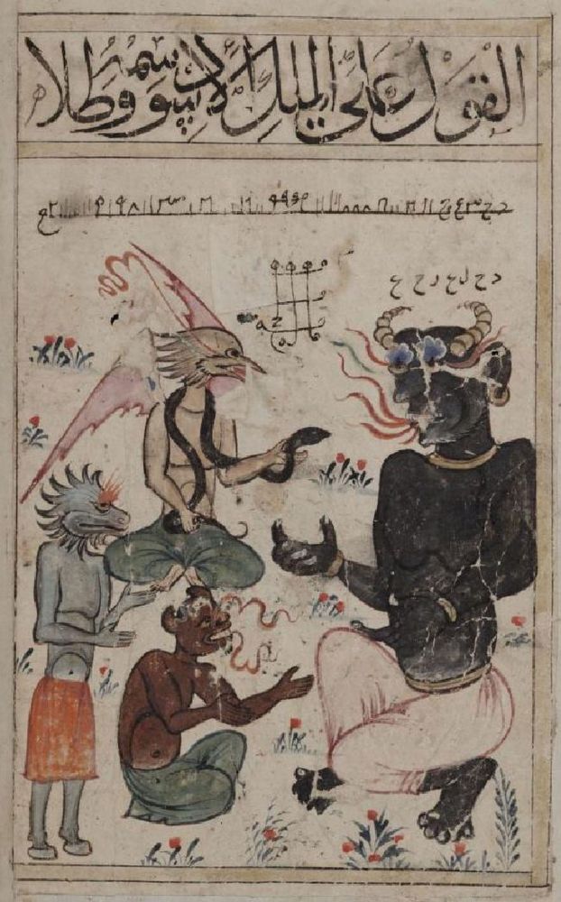 ► Cet ouvrage musulman, connu pour ses figurations de djinns est un recueil illustré de sciences occultes - principalement divinatoires -, attribué à Albumasar {Abou Ma’shar al-Balkhî}. Il contient des traités sur l’astronomie et l’astrologie፧, la géomancie et la talismanie, ainsi qu’une clef des songes, une Histoire merveilleuse du Prophète et un traité de divination attribué à Ja’far al-Sadiq contenant par exemple, un tableau physiognomonique. Certaines illustrations sont inspirées des célébrissimes Merveilles de la création.