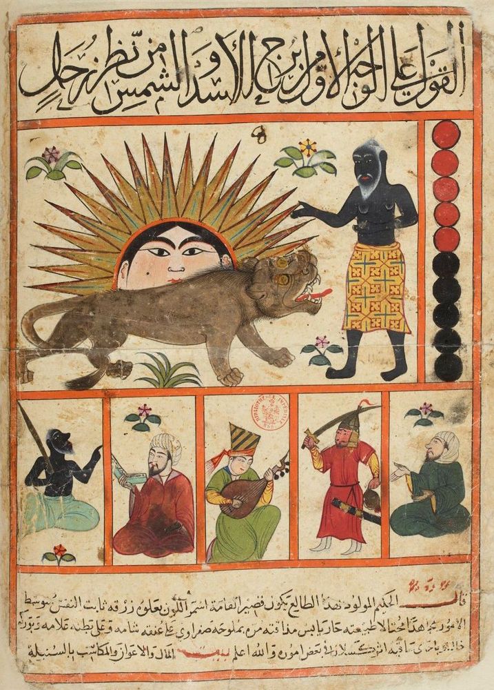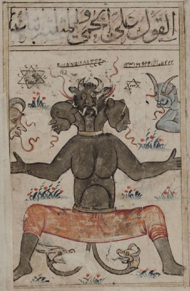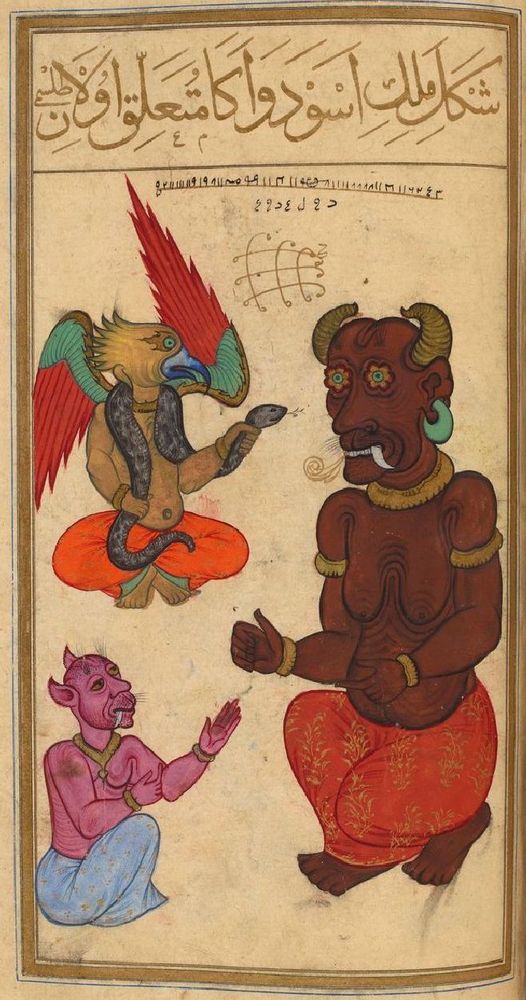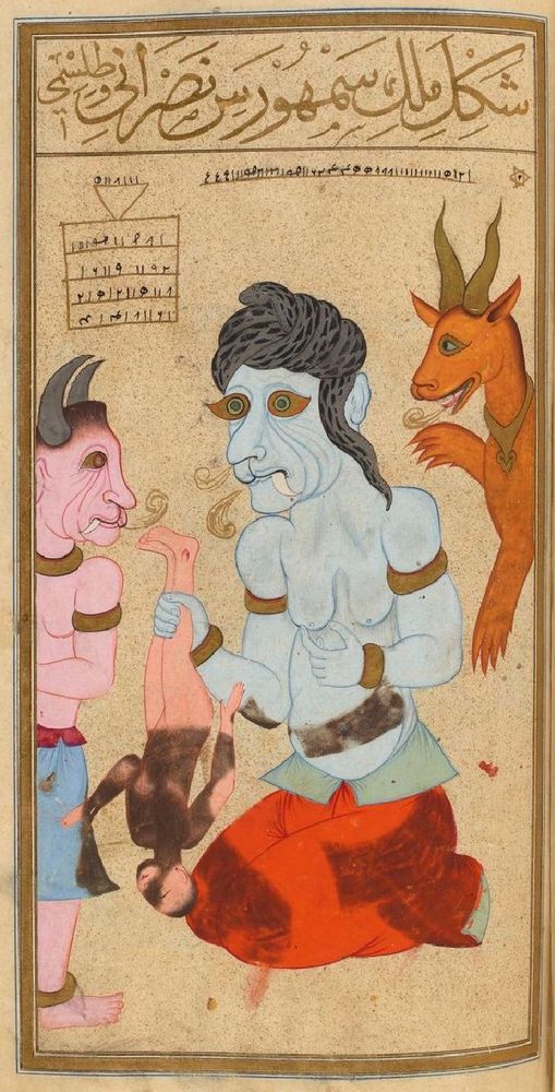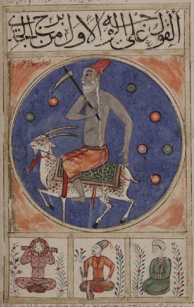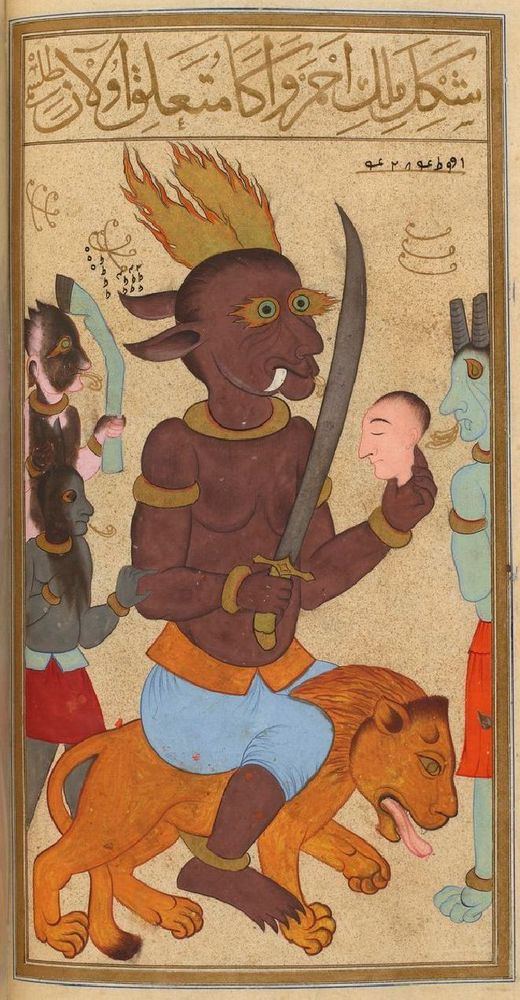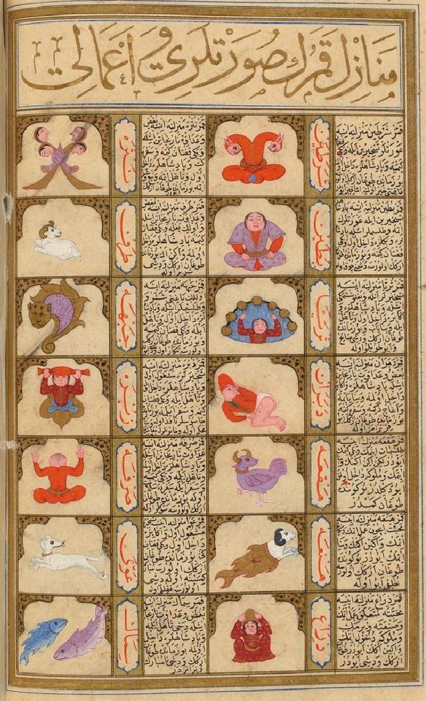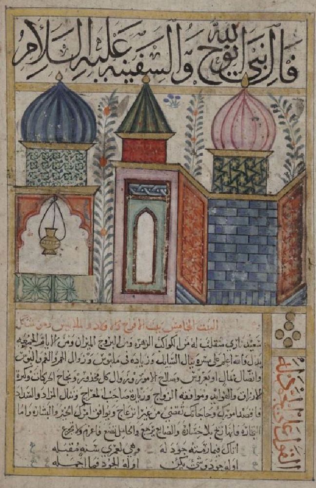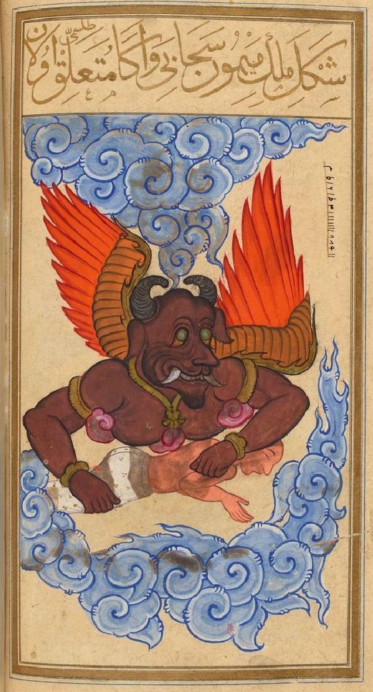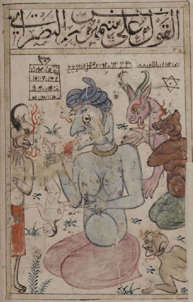 ► Cet ouvrage musulman, connu pour ses figurations de djinns est un recueil illustré de sciences occultes - principalement divinatoires -, attribué à Albumasar {Abou Ma’shar al-Balkhî}. Il contient des traités sur l’astronomie et l’astrologie፧, la géomancie et la talismanie, ainsi qu’une clef des songes, une Histoire merveilleuse du Prophète et un traité de divination attribué à Ja’far al-Sadiq contenant par exemple, un tableau physiognomonique. Certaines illustrations sont inspirées des célébrissimes Merveilles de la création.