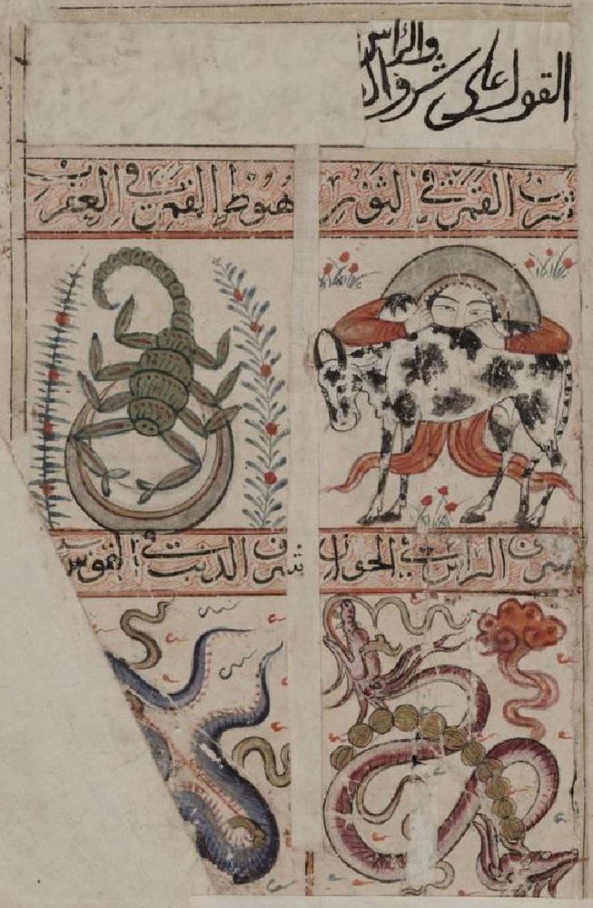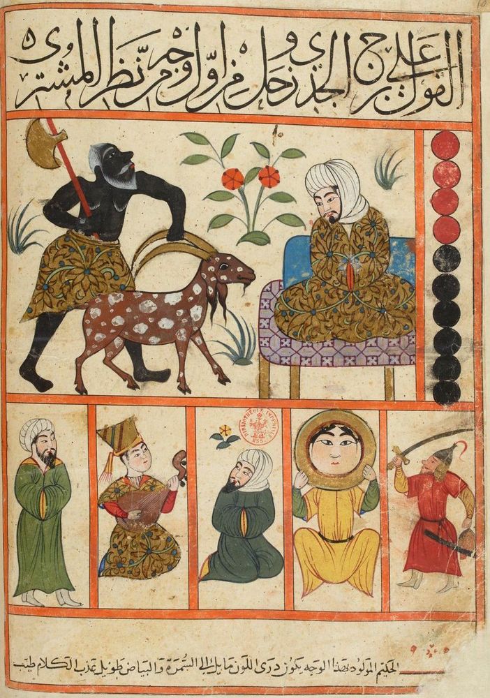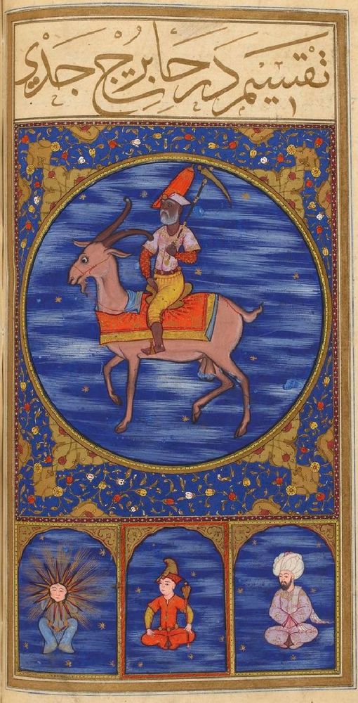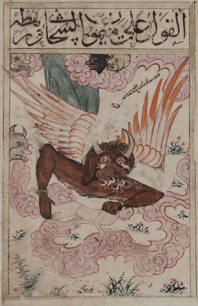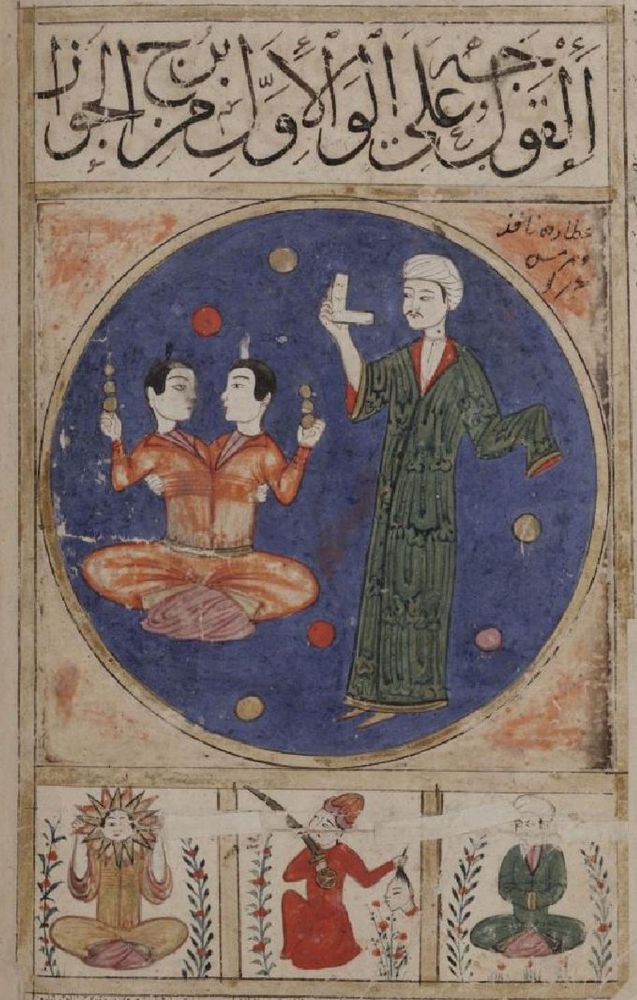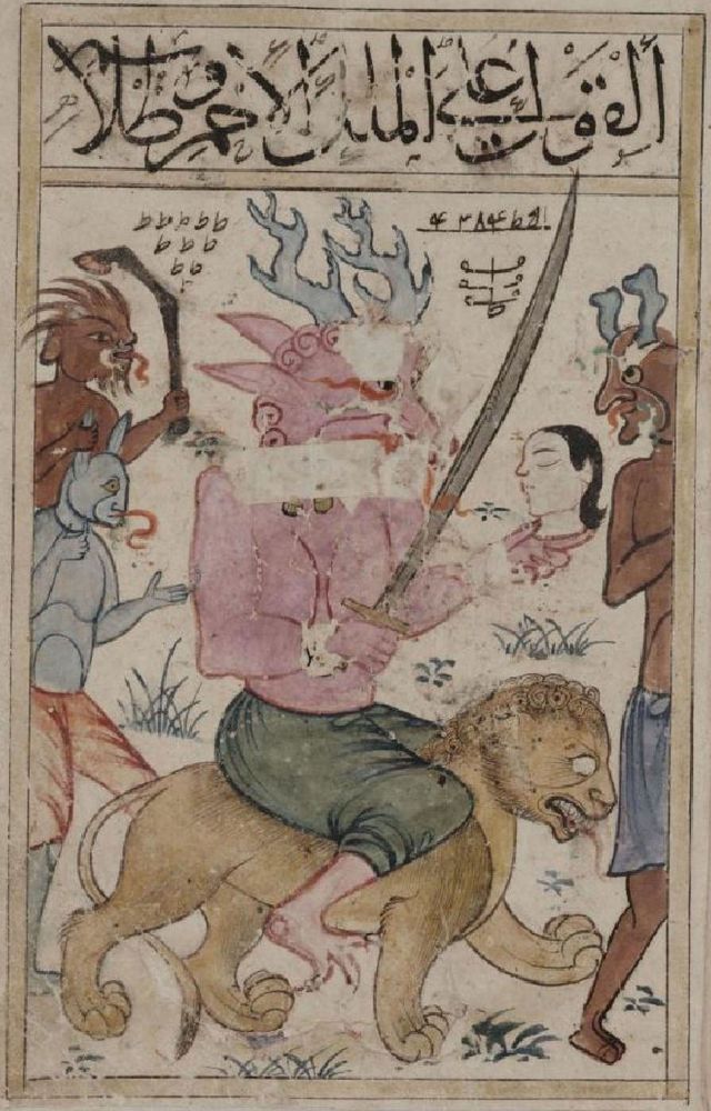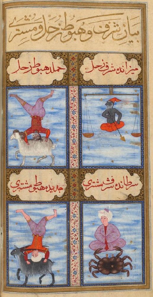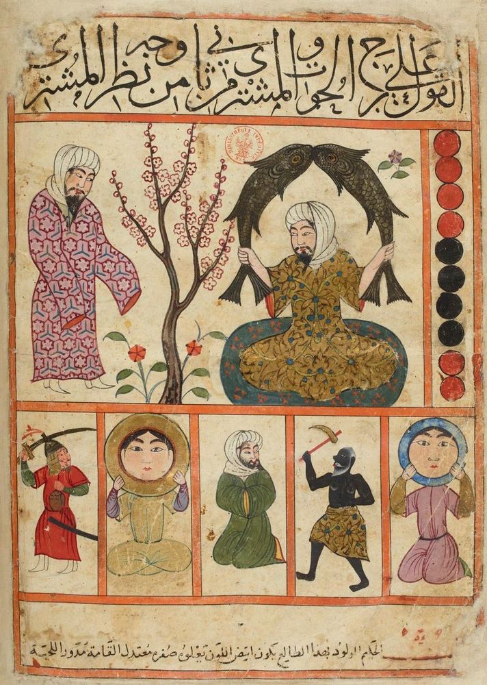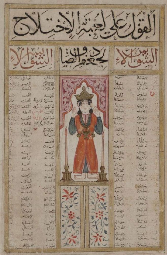 ► Cet ouvrage musulman, connu pour ses figurations de djinns est un recueil illustré de sciences occultes - principalement divinatoires -, attribué à Albumasar {Abou Ma’shar al-Balkhî}. Il contient des traités sur l’astronomie et l’astrologie፧, la géomancie et la talismanie, ainsi qu’une clef des songes, une Histoire merveilleuse du Prophète et un traité de divination attribué à Ja’far al-Sadiq contenant par exemple, un tableau physiognomonique. Certaines illustrations sont inspirées des célébrissimes Merveilles de la création.