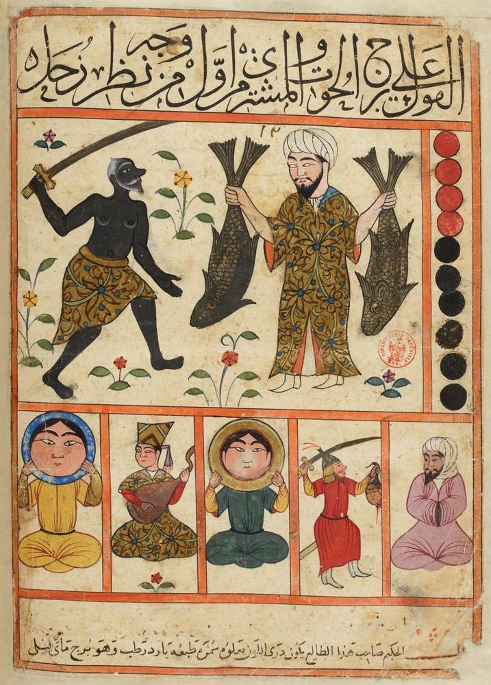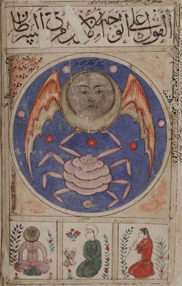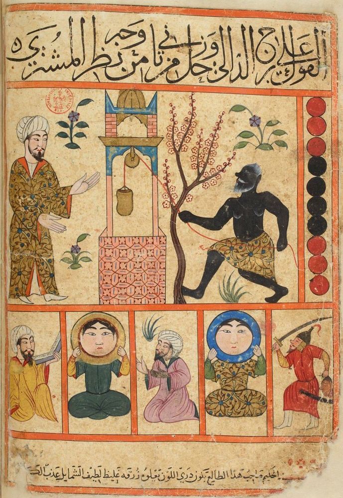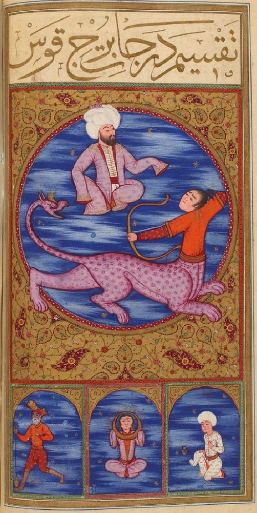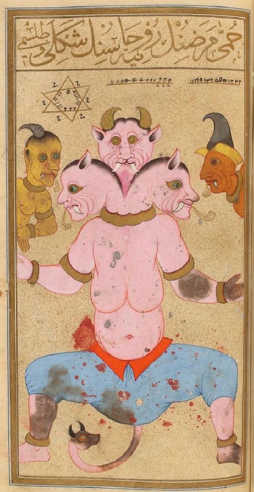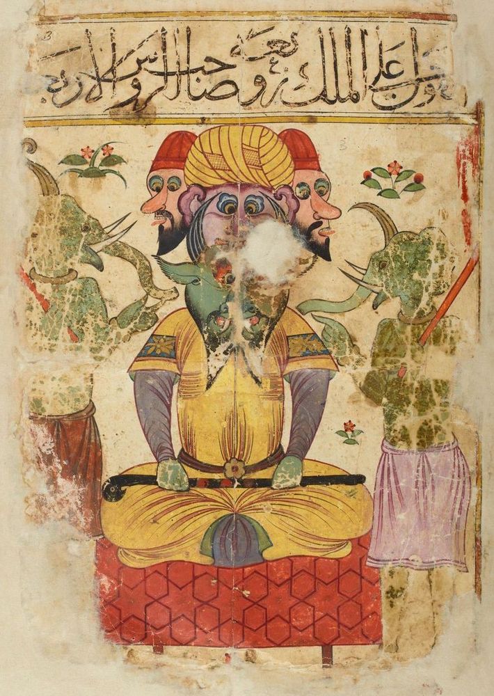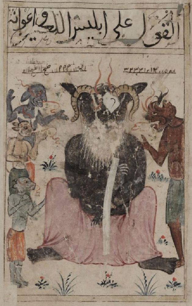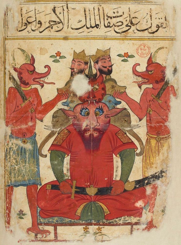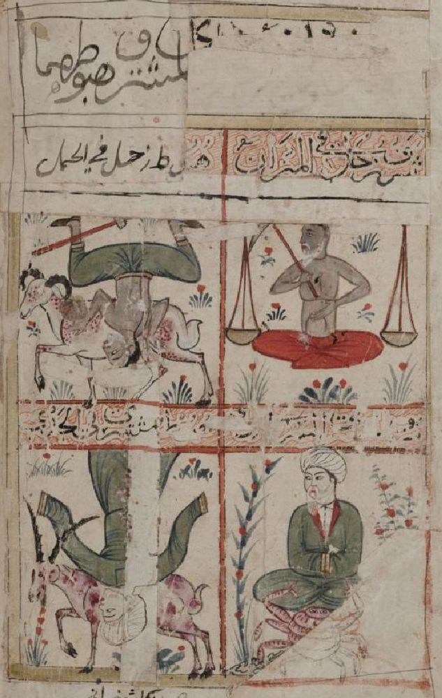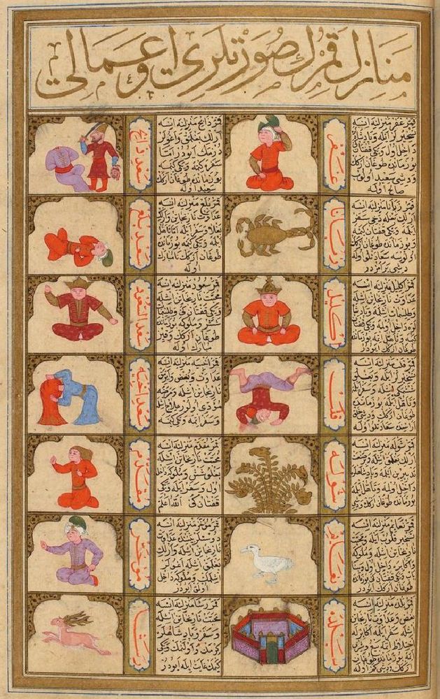 ► Cet ouvrage musulman, connu pour ses figurations de djinns est un recueil illustré de sciences occultes - principalement divinatoires -, attribué à Albumasar {Abou Ma’shar al-Balkhî}. Il contient des traités sur l’astronomie et l’astrologie፧, la géomancie et la talismanie, ainsi qu’une clef des songes, une Histoire merveilleuse du Prophète et un traité de divination attribué à Ja’far al-Sadiq contenant par exemple, un tableau physiognomonique. Certaines illustrations sont inspirées des célébrissimes Merveilles de la création.
