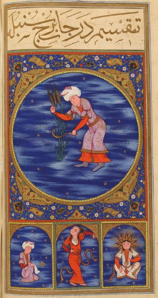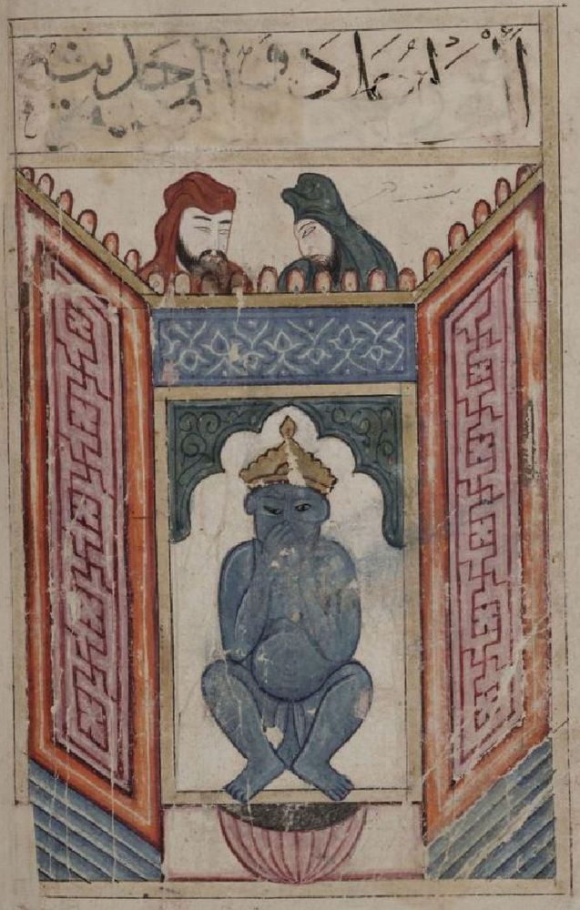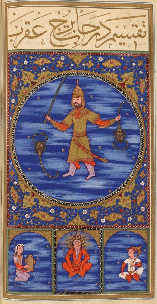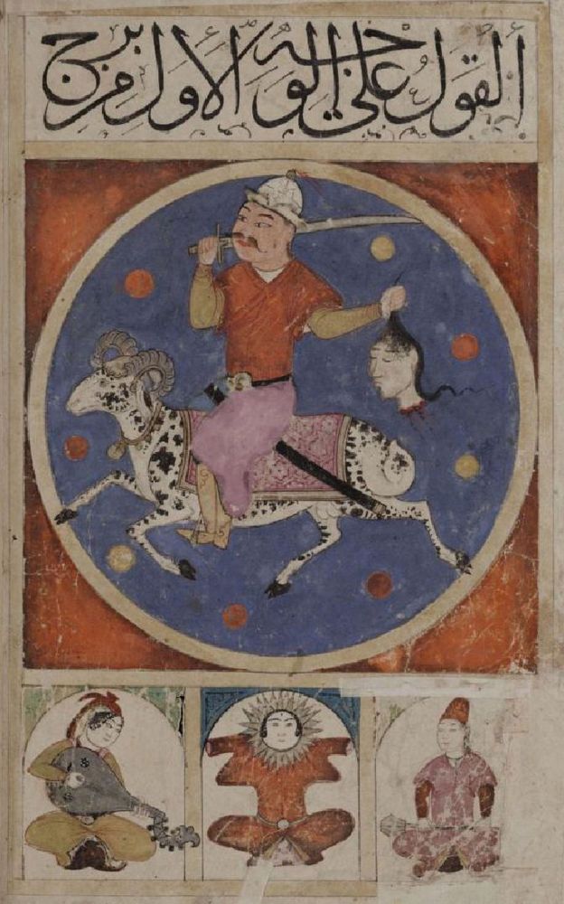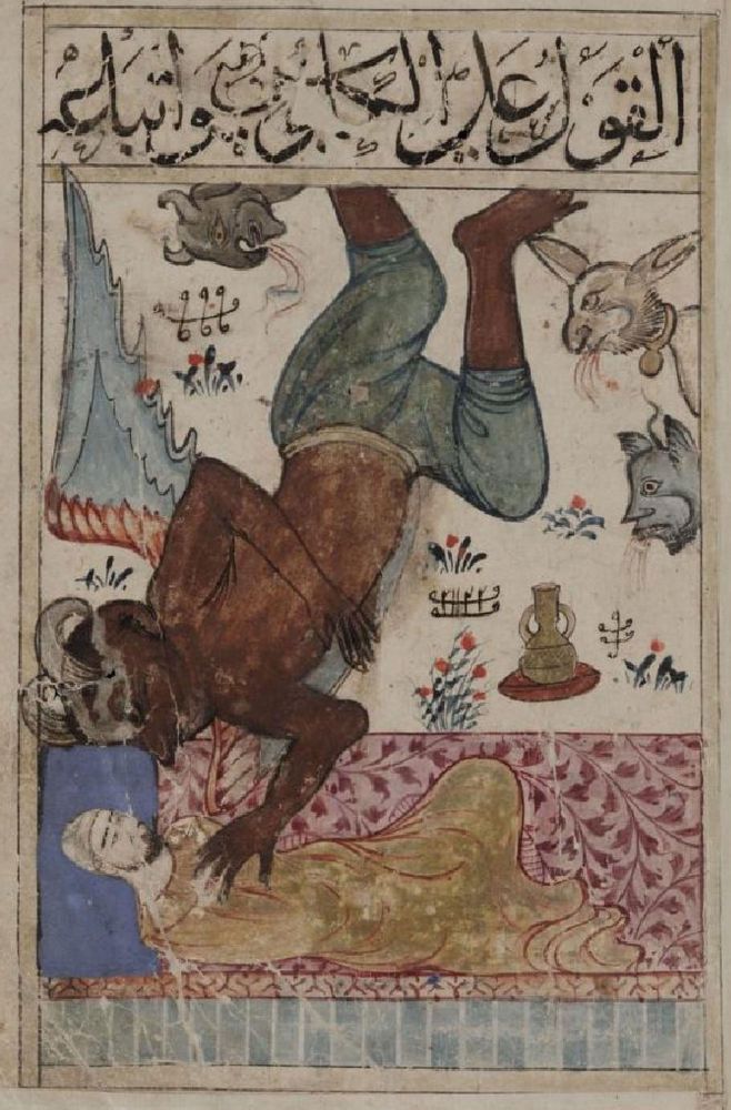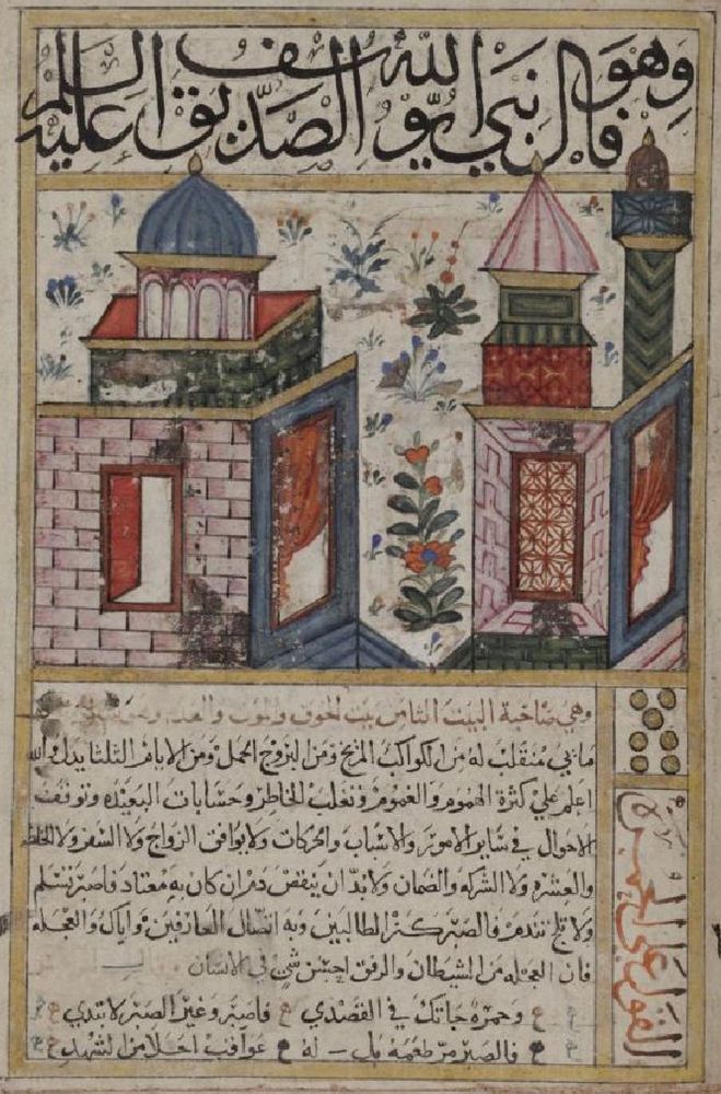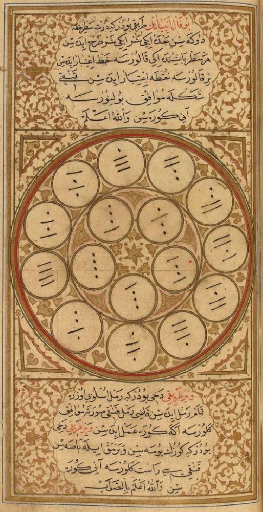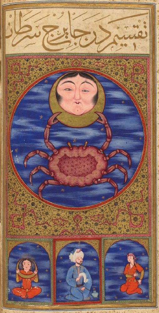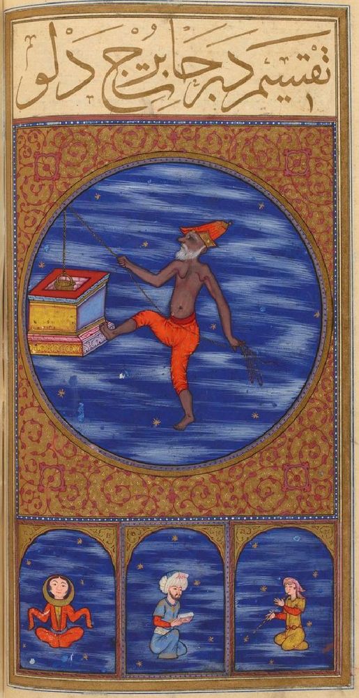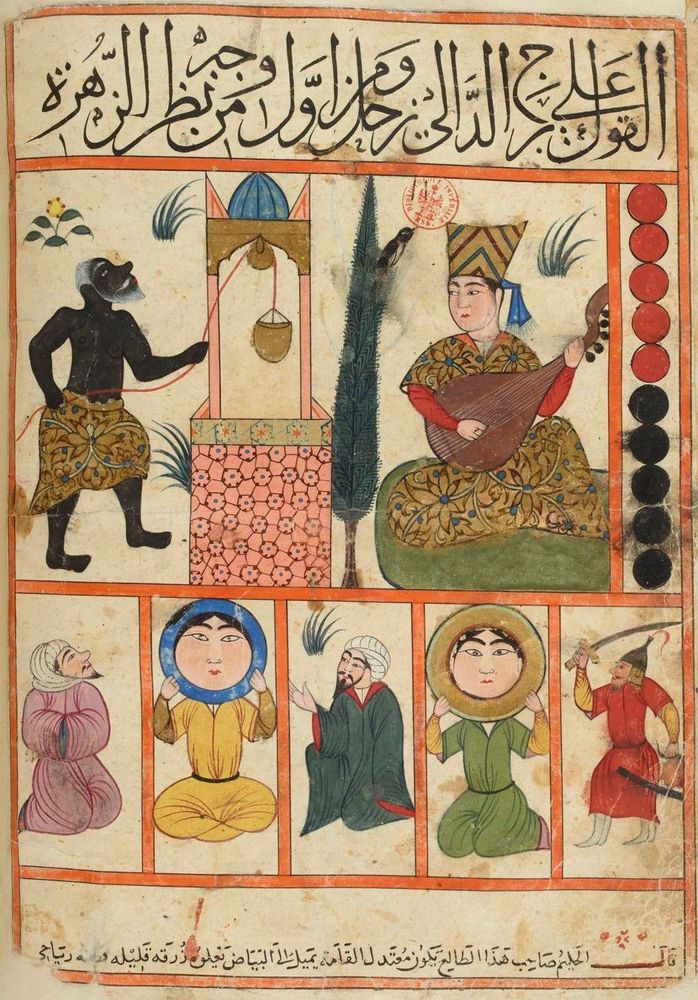 ► Cet ouvrage musulman, connu pour ses figurations de djinns est un recueil illustré de sciences occultes - principalement divinatoires -, attribué à Albumasar {Abou Ma’shar al-Balkhî}. Il contient des traités sur l’astronomie et l’astrologie፧, la géomancie et la talismanie, ainsi qu’une clef des songes, une Histoire merveilleuse du Prophète et un traité de divination attribué à Ja’far al-Sadiq contenant par exemple, un tableau physiognomonique. Certaines illustrations sont inspirées des célébrissimes Merveilles de la création.