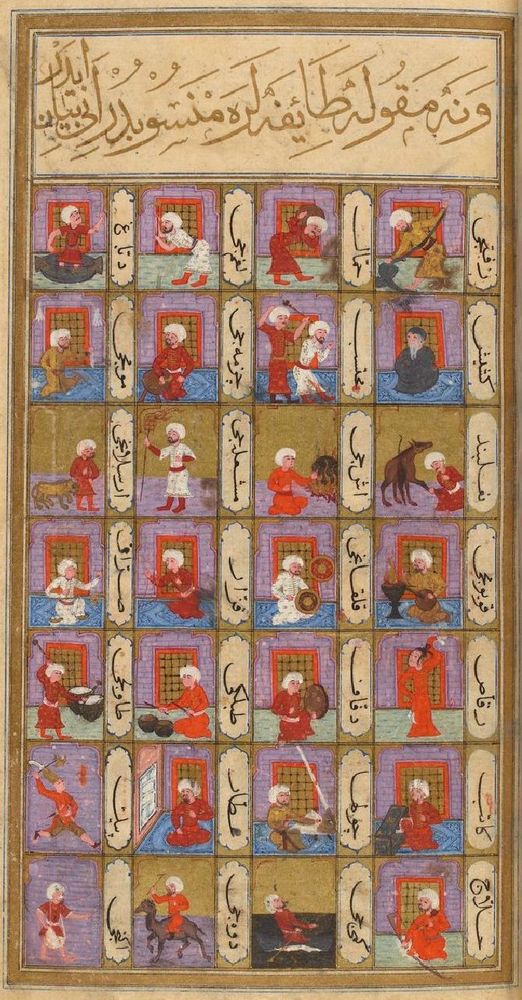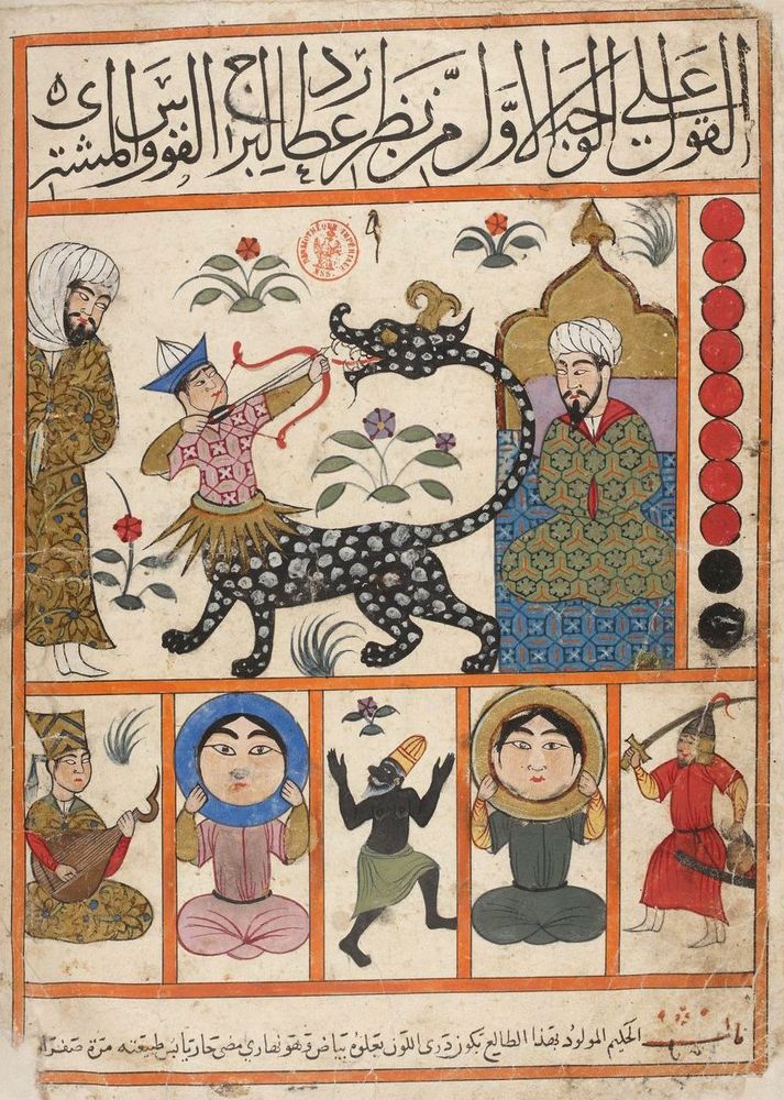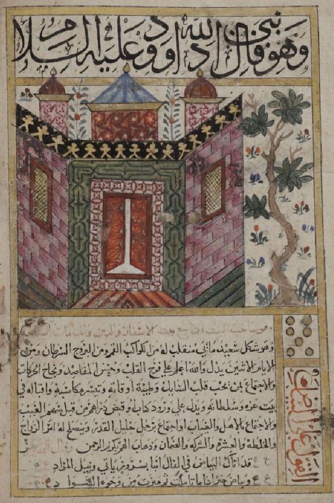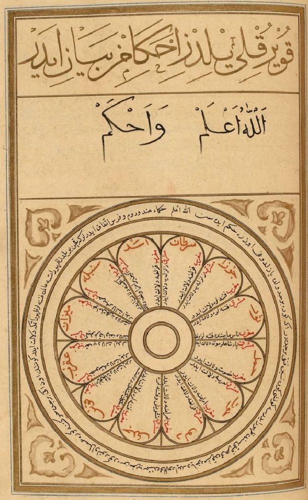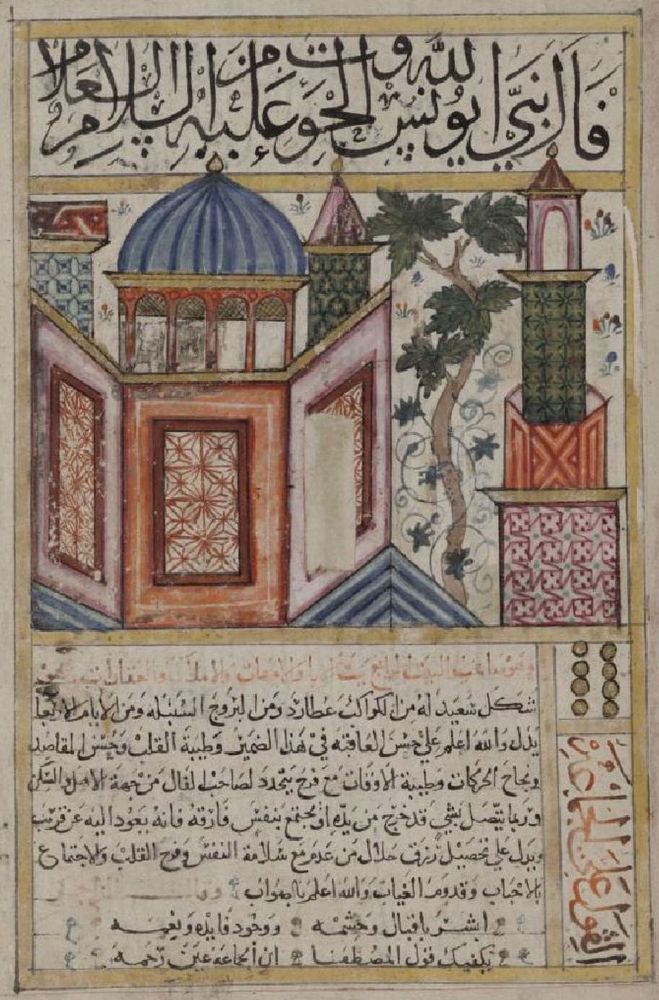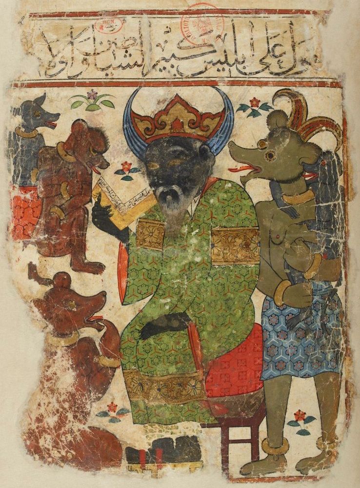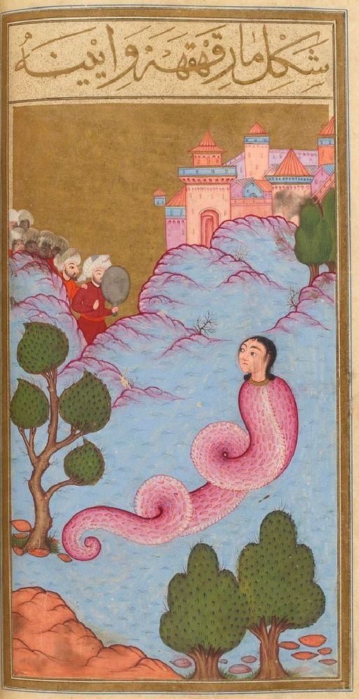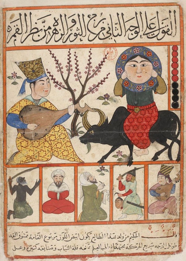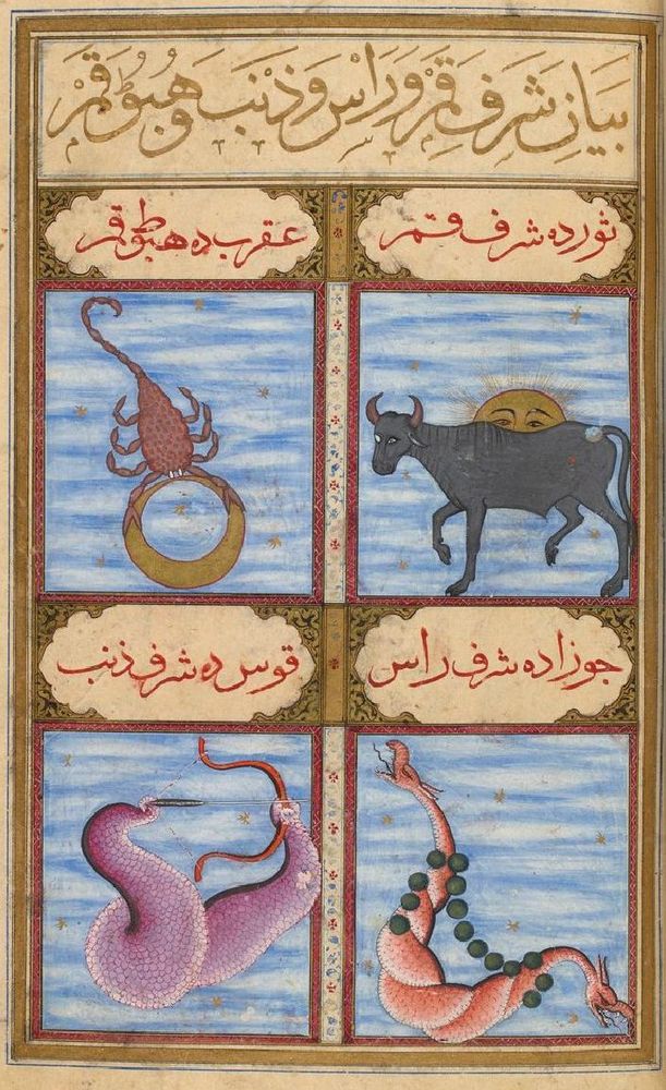 ► Cet ouvrage musulman, connu pour ses figurations de djinns est un recueil illustré de sciences occultes - principalement divinatoires -, attribué à Albumasar {Abou Ma’shar al-Balkhî}. Il contient des traités sur l’astronomie et l’astrologie፧, la géomancie et la talismanie, ainsi qu’une clef des songes, une Histoire merveilleuse du Prophète et un traité de divination attribué à Ja’far al-Sadiq contenant par exemple, un tableau physiognomonique. Certaines illustrations sont inspirées des célébrissimes Merveilles de la création.