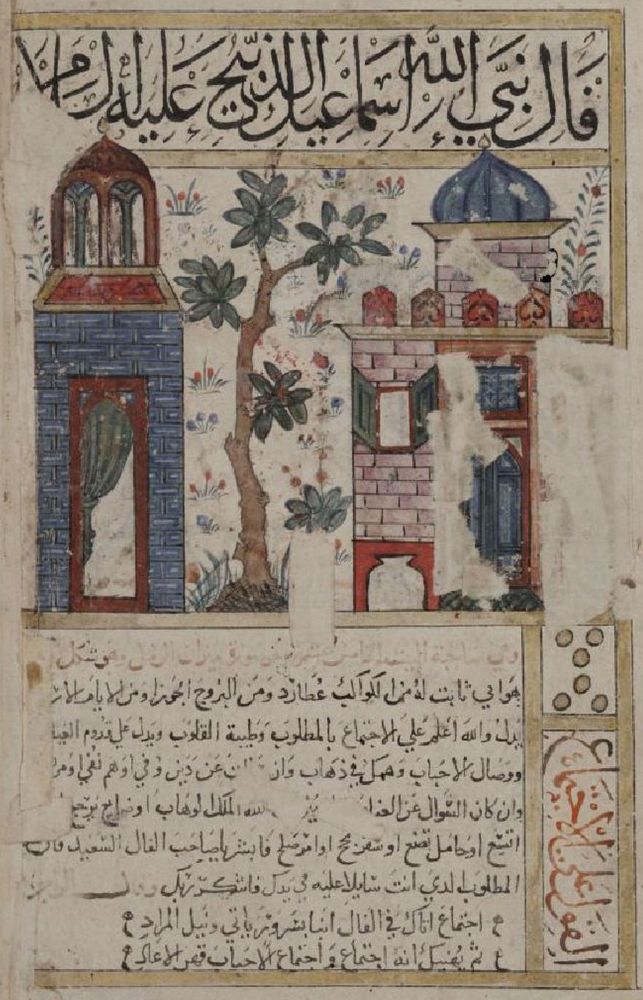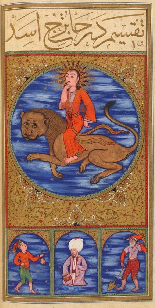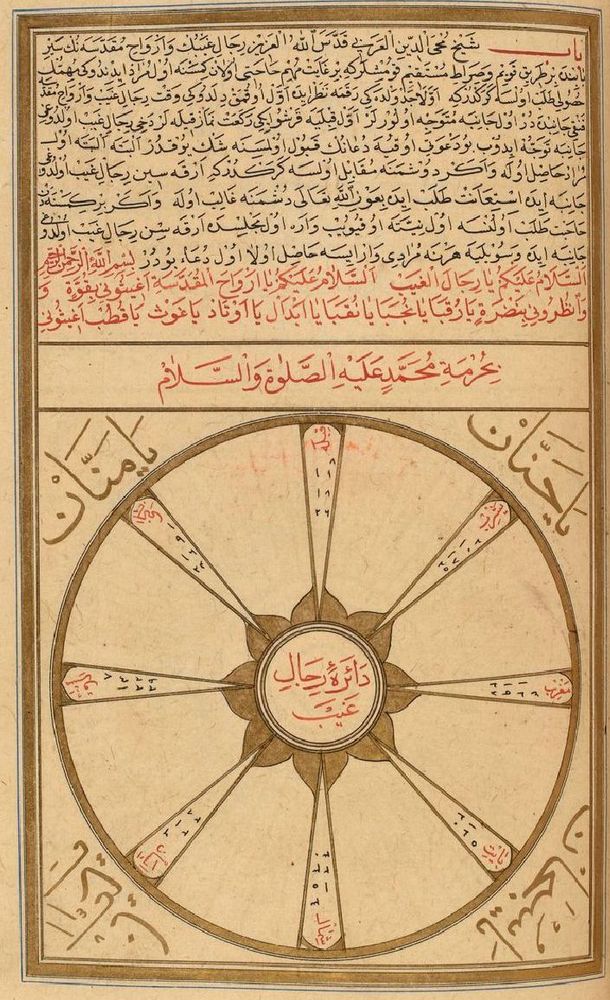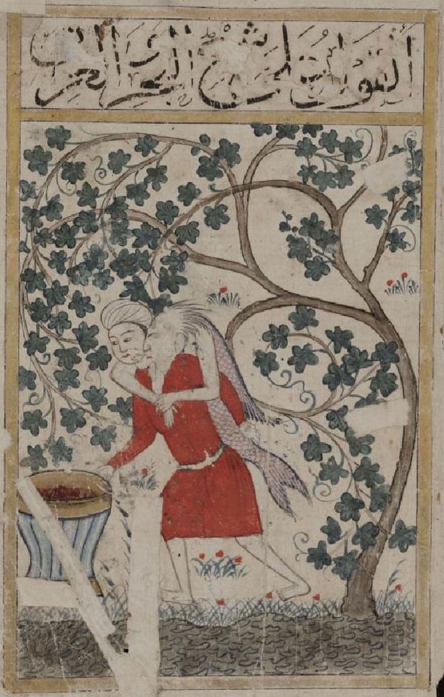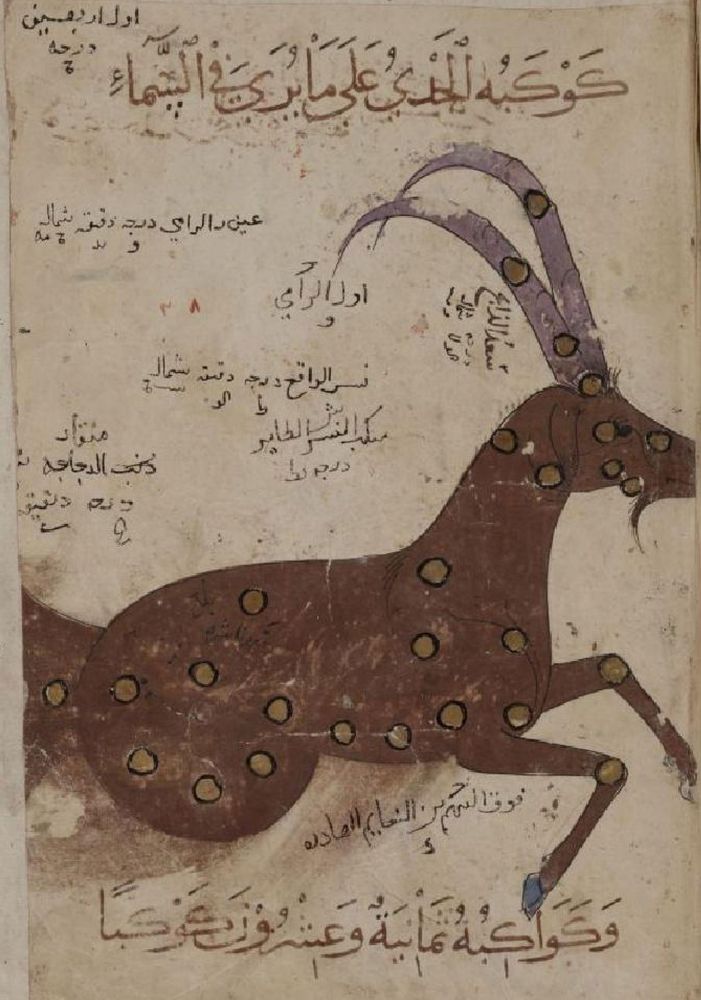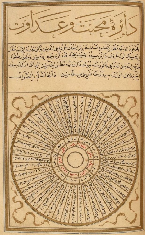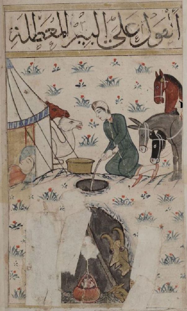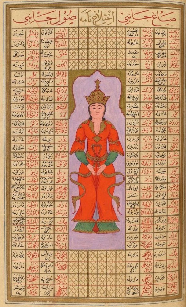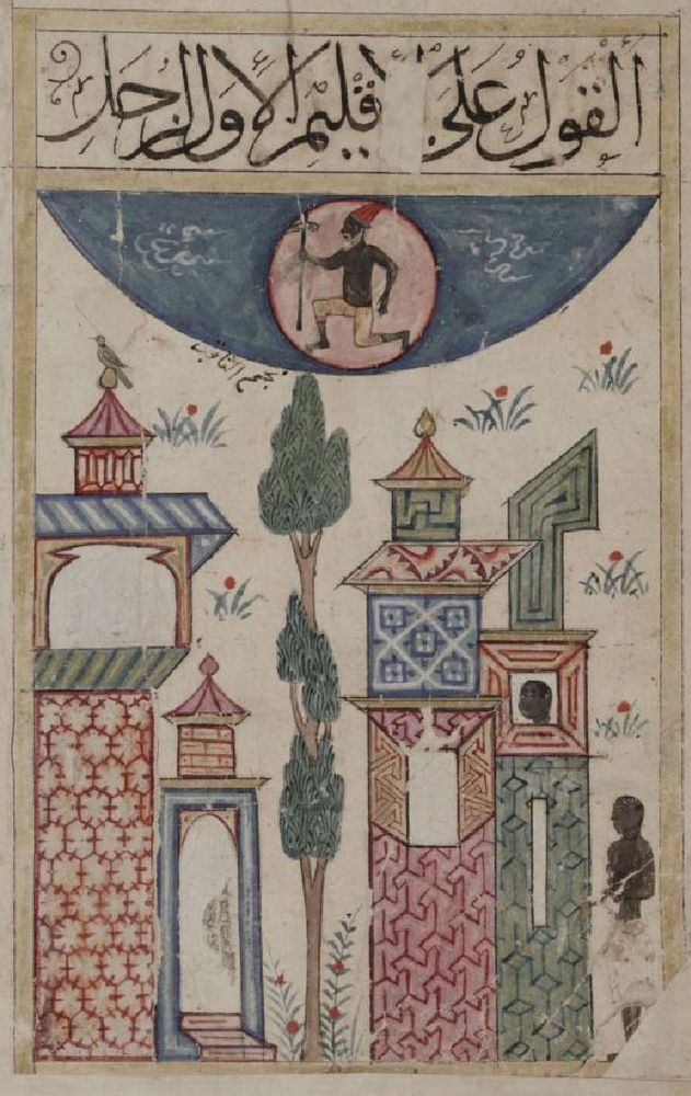 ► Cet ouvrage musulman, connu pour ses figurations de djinns est un recueil illustré de sciences occultes - principalement divinatoires -, attribué à Albumasar {Abou Ma’shar al-Balkhî}. Il contient des traités sur l’astronomie et l’astrologie፧, la géomancie et la talismanie, ainsi qu’une clef des songes, une Histoire merveilleuse du Prophète et un traité de divination attribué à Ja’far al-Sadiq contenant par exemple, un tableau physiognomonique. Certaines illustrations sont inspirées des célébrissimes Merveilles de la création.