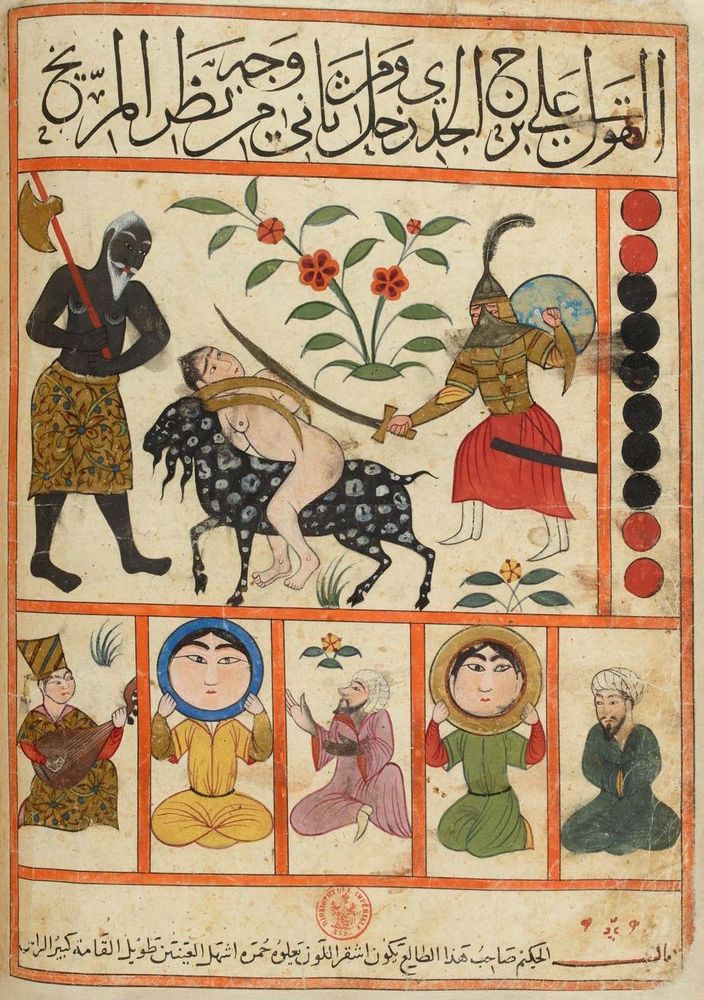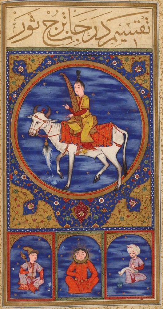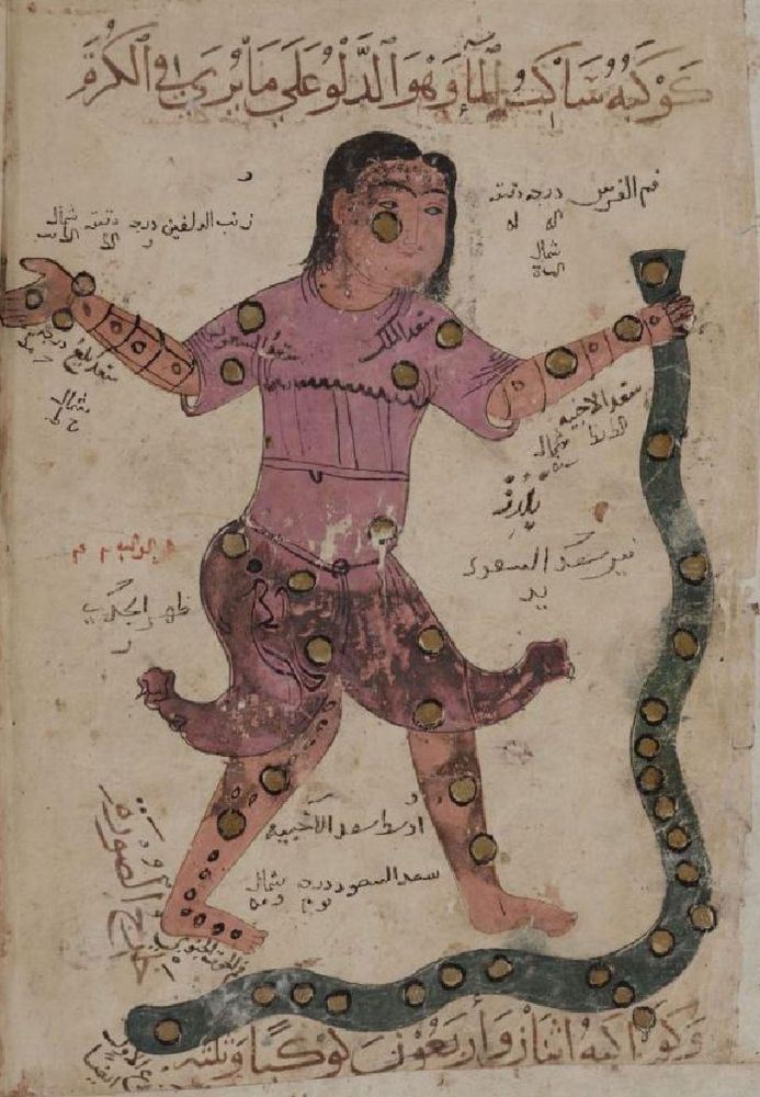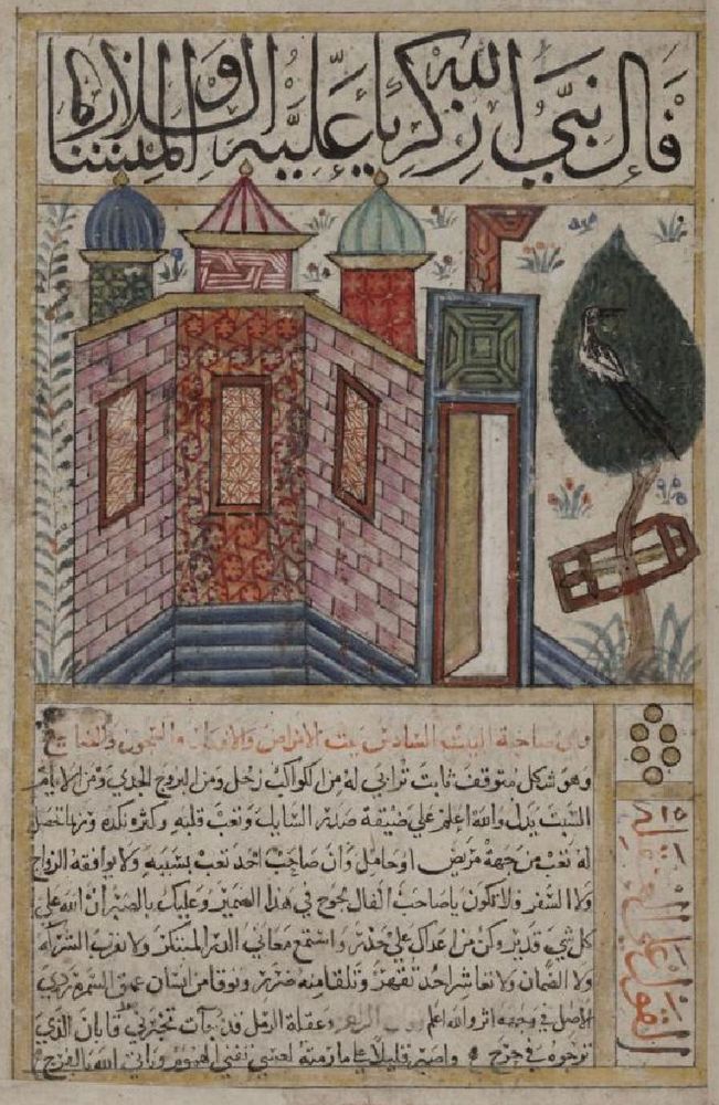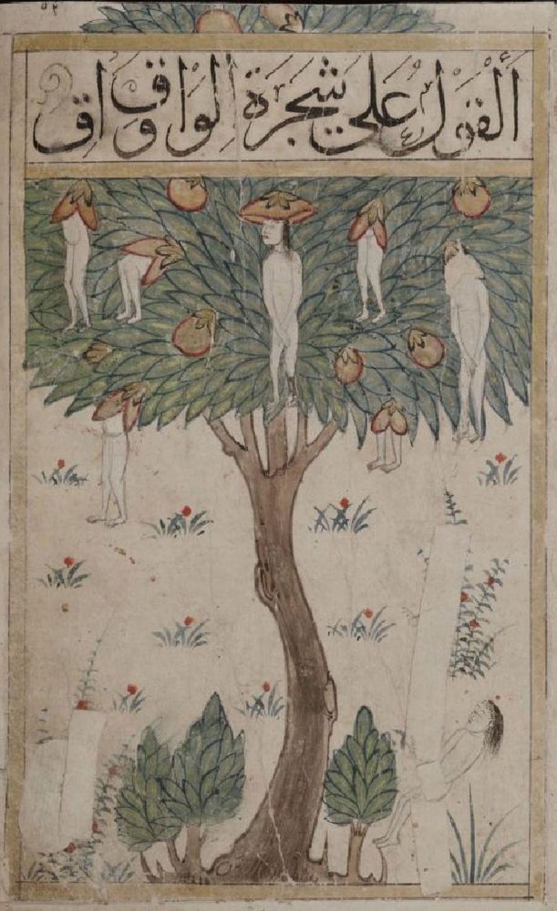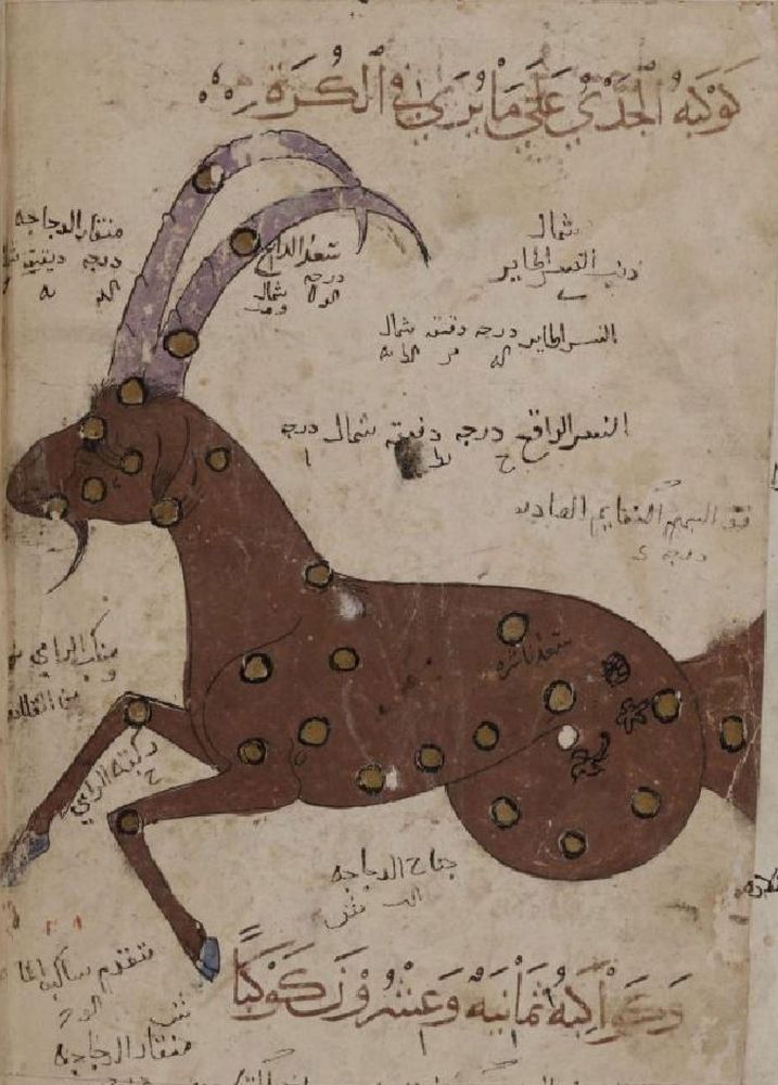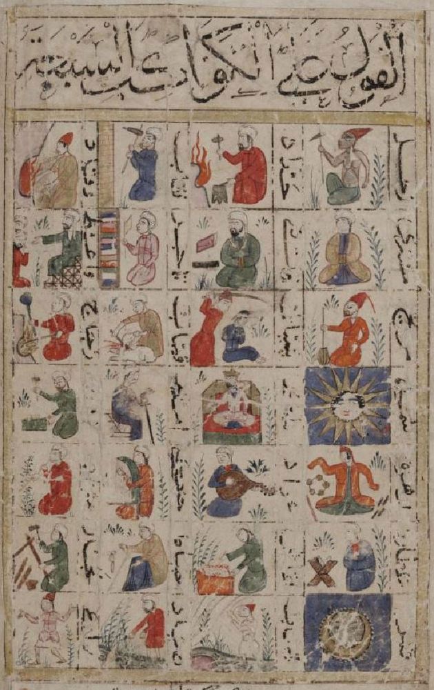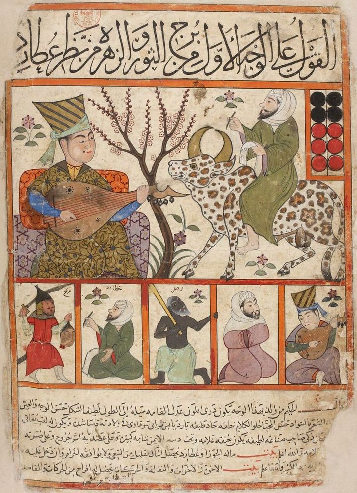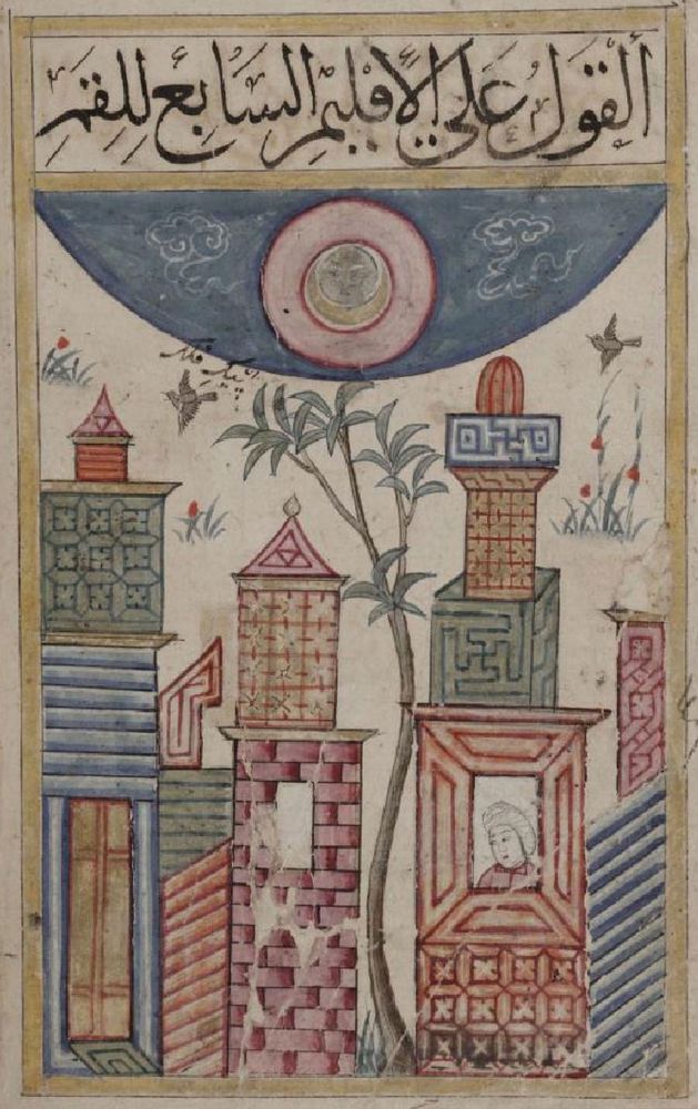 ► Cet ouvrage musulman, connu pour ses figurations de djinns est un recueil illustré de sciences occultes - principalement divinatoires -, attribué à Albumasar {Abou Ma’shar al-Balkhî}. Il contient des traités sur l’astronomie et l’astrologie፧, la géomancie et la talismanie, ainsi qu’une clef des songes, une Histoire merveilleuse du Prophète et un traité de divination attribué à Ja’far al-Sadiq contenant par exemple, un tableau physiognomonique. Certaines illustrations sont inspirées des célébrissimes Merveilles de la création.