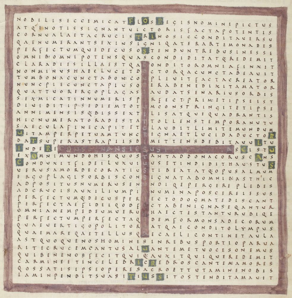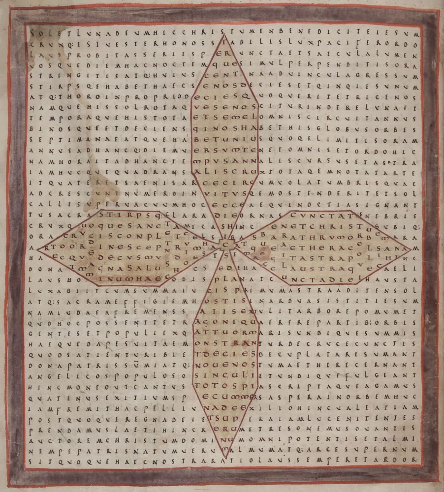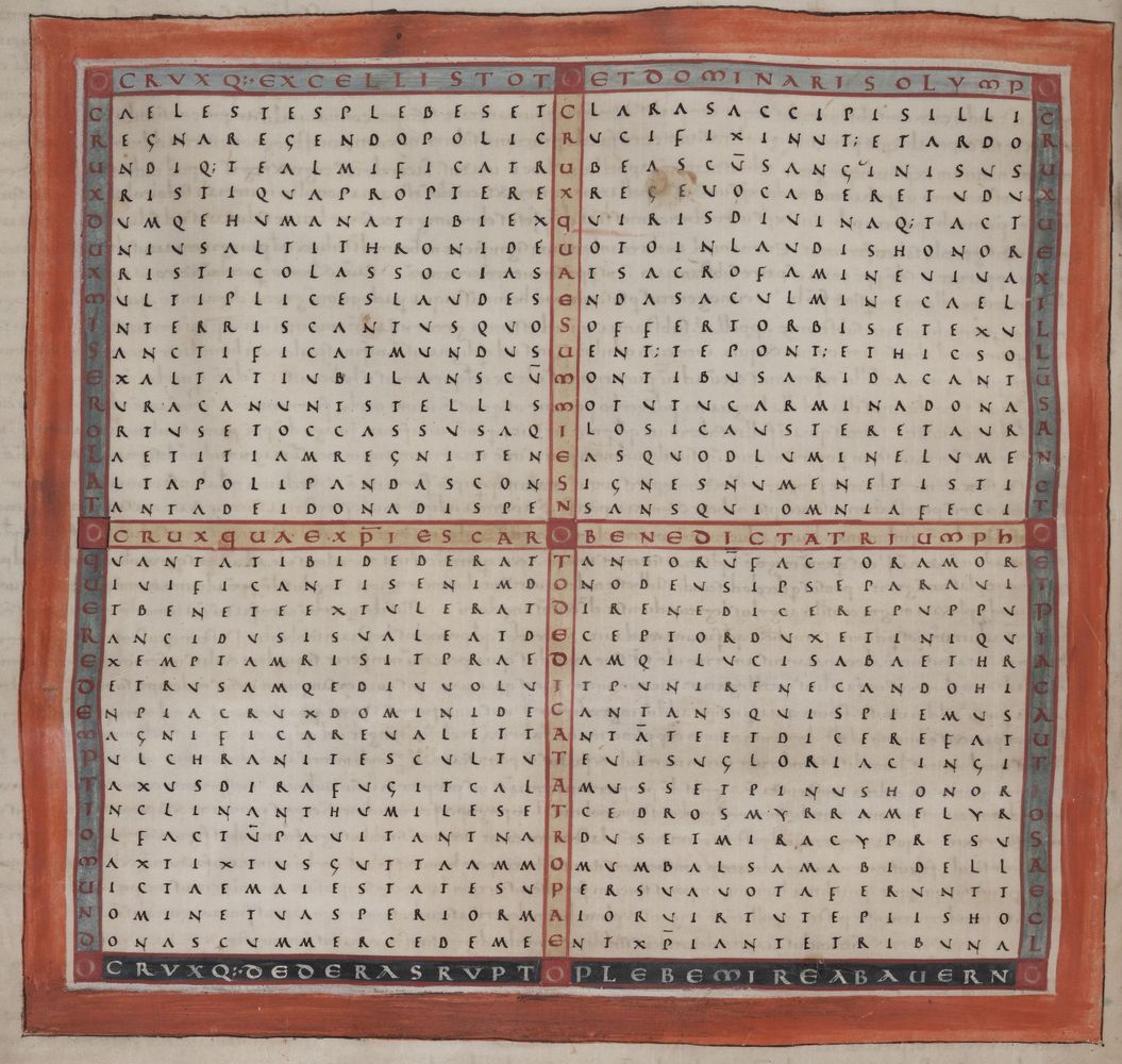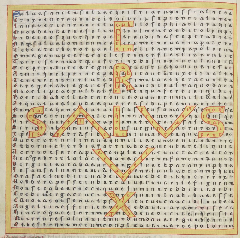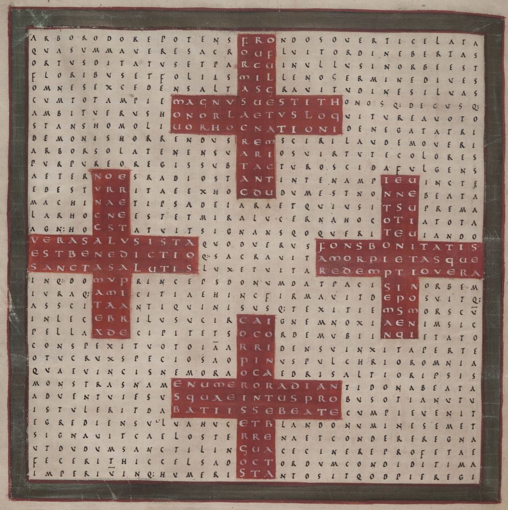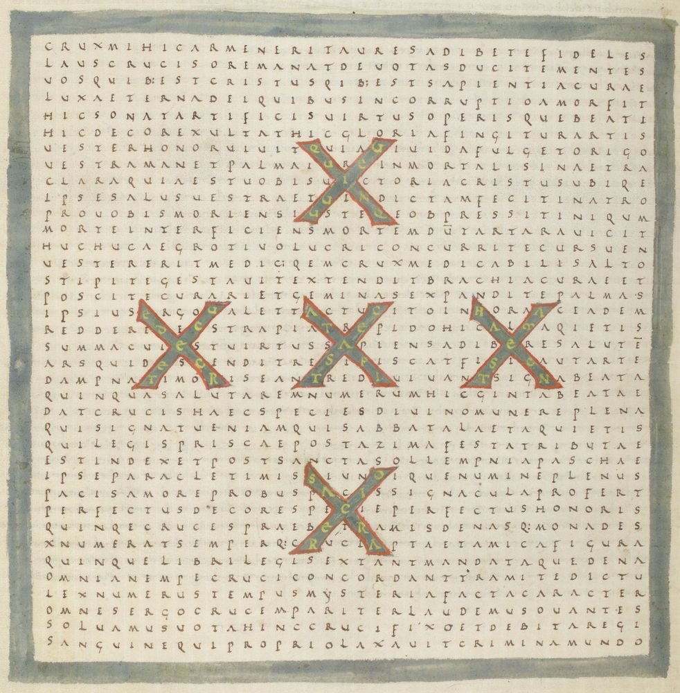 ► Cette œuvre de poétique et de prose, autant que d’art visuel, qui fut demandée par Alcuin et encensée par Reuchlin, se présente sous forme de carmina figurata et se destine à expliquer les mystères de la croix et la mystique des nombres attribués à différentes entités. Requérant une patience et un talent certain pour son élaboration, il s’agit d’un chef-d’œuvre de la période carolingienne, on la retrouve réutilisée dans l’Introduction à la Cabale.