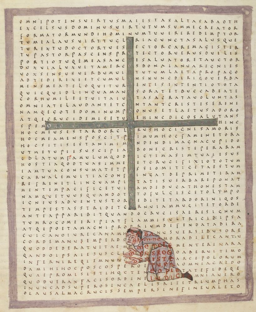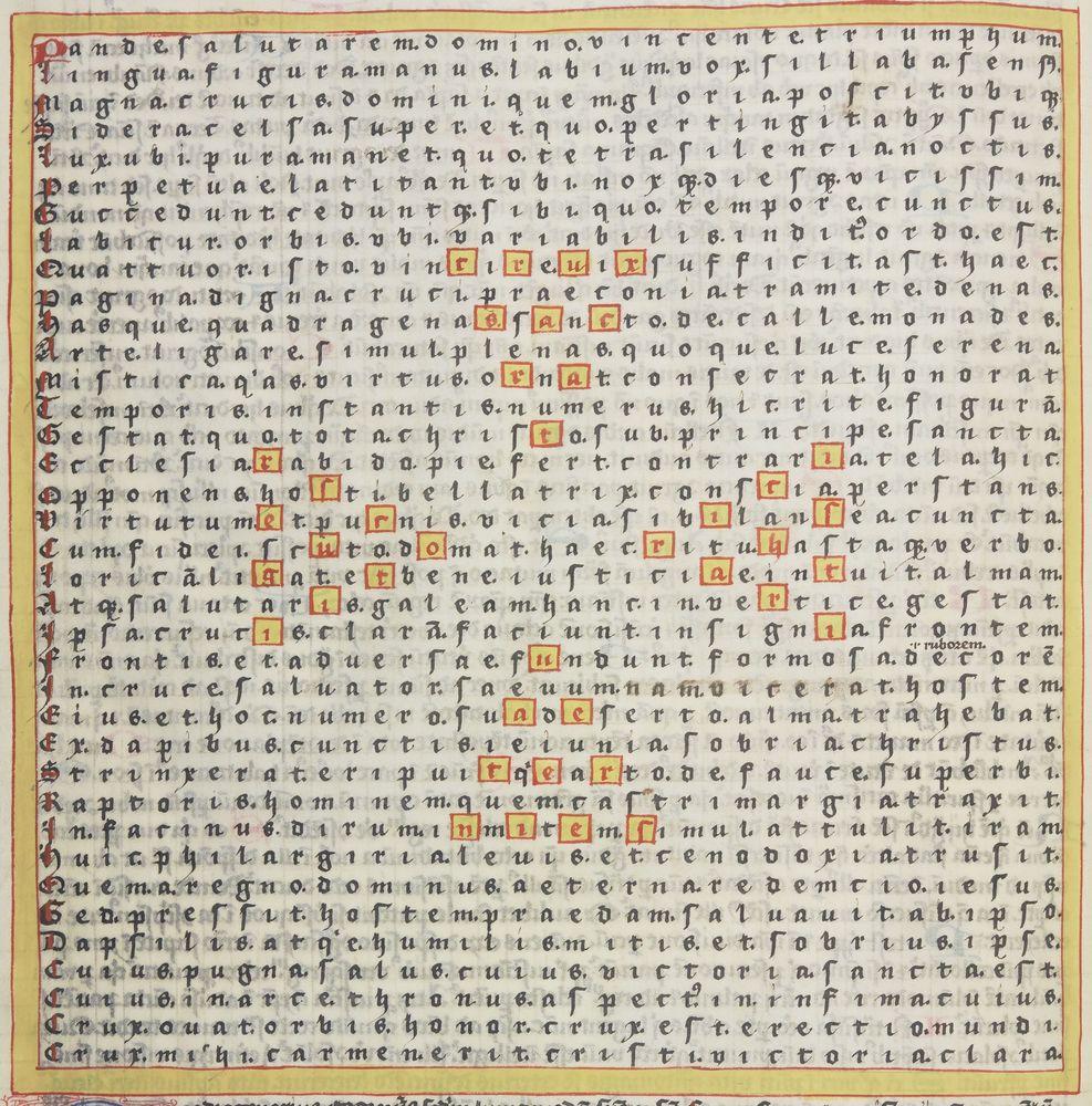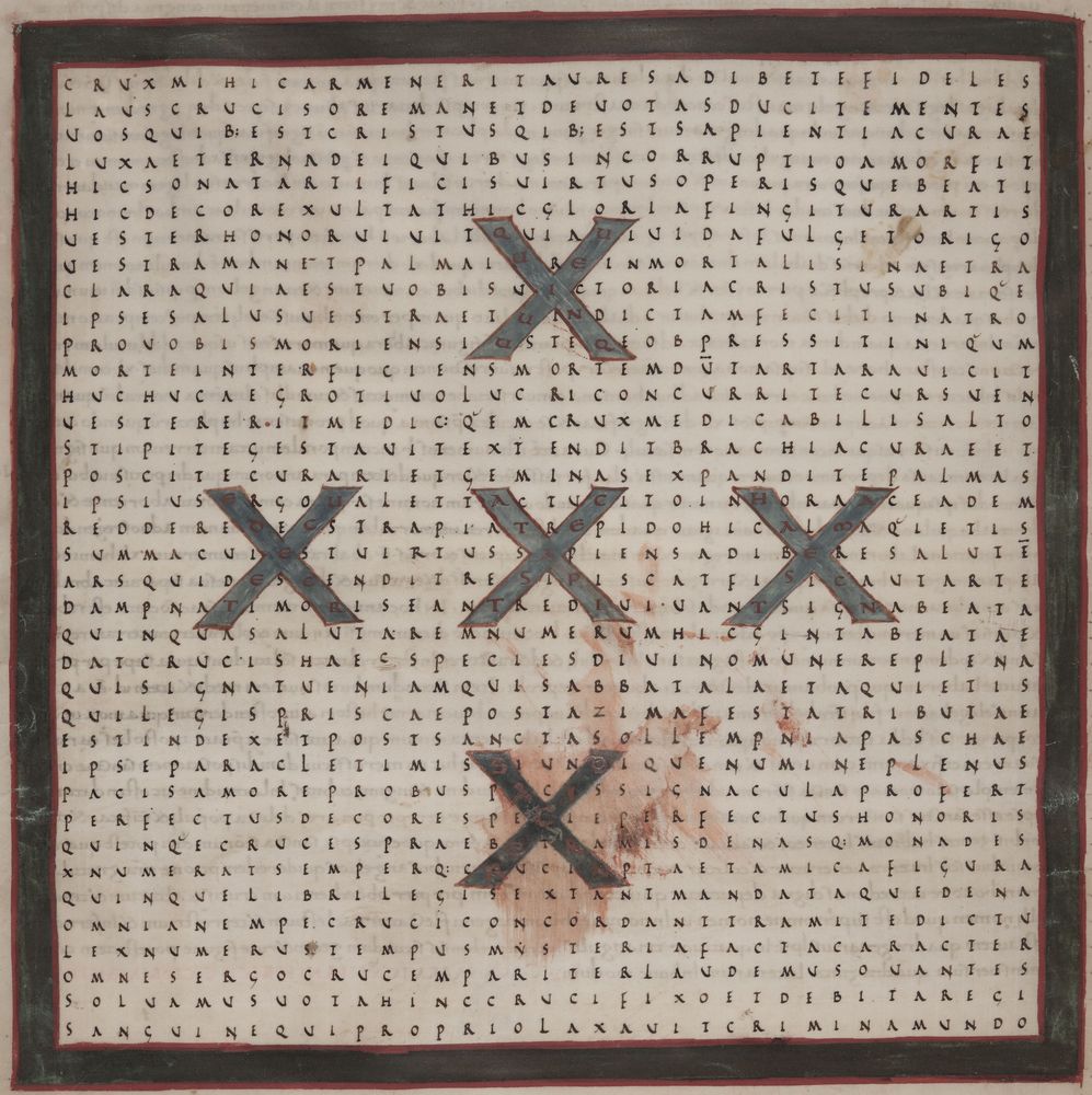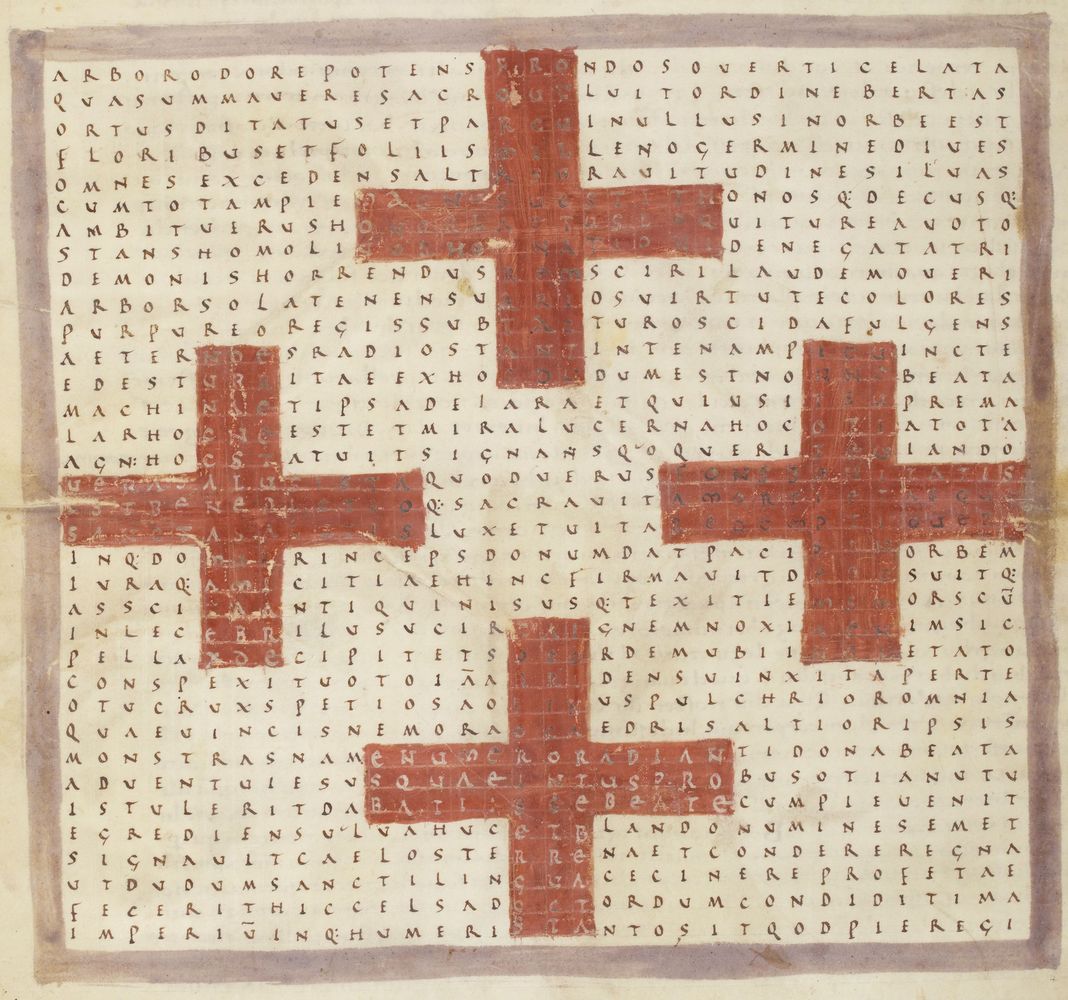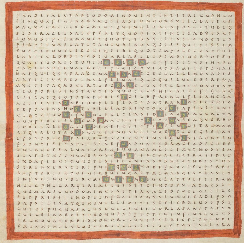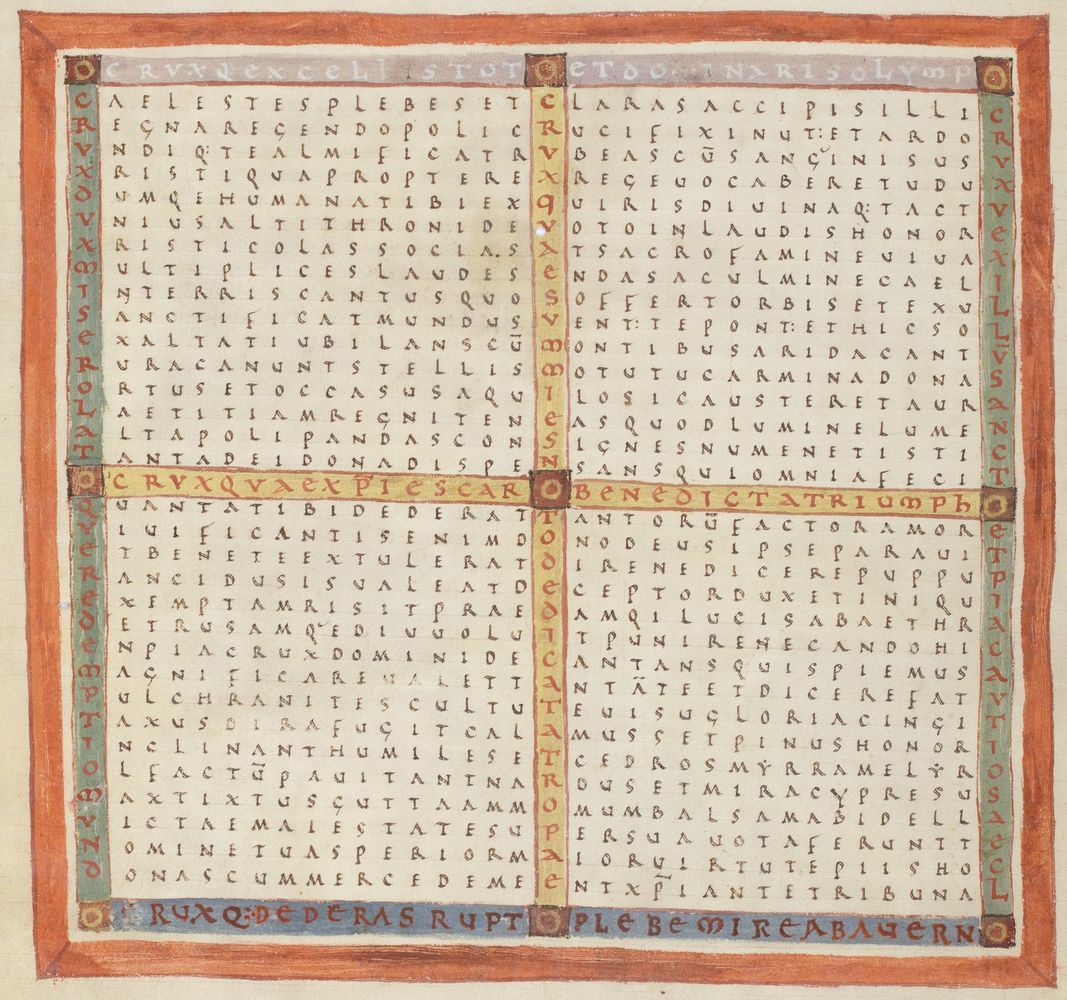 ► Cette œuvre de poétique et de prose, autant que d’art visuel, qui fut demandée par Alcuin et encensée par Reuchlin, se présente sous forme de carmina figurata et se destine à expliquer les mystères de la croix et la mystique des nombres attribués à différentes entités. Requérant une patience et un talent certain pour son élaboration, il s’agit d’un chef-d’œuvre de la période carolingienne, on la retrouve réutilisée dans l’Introduction à la Cabale.