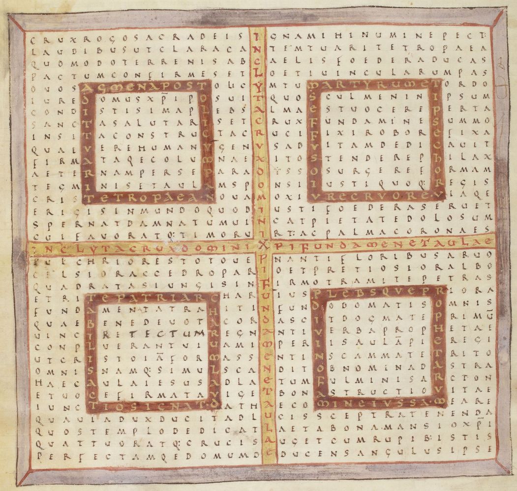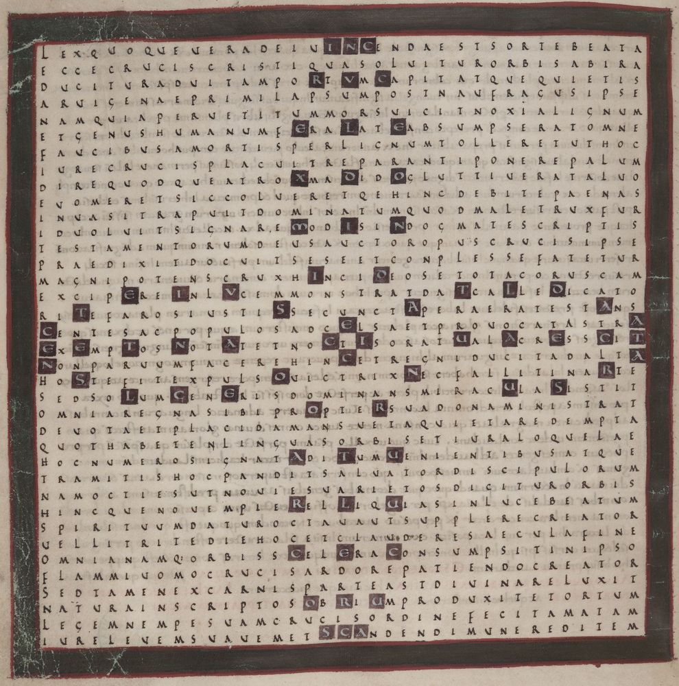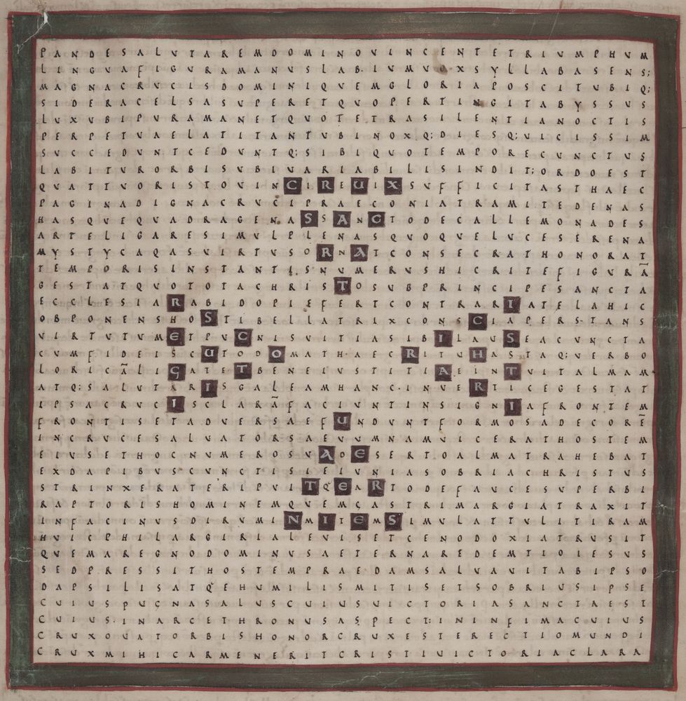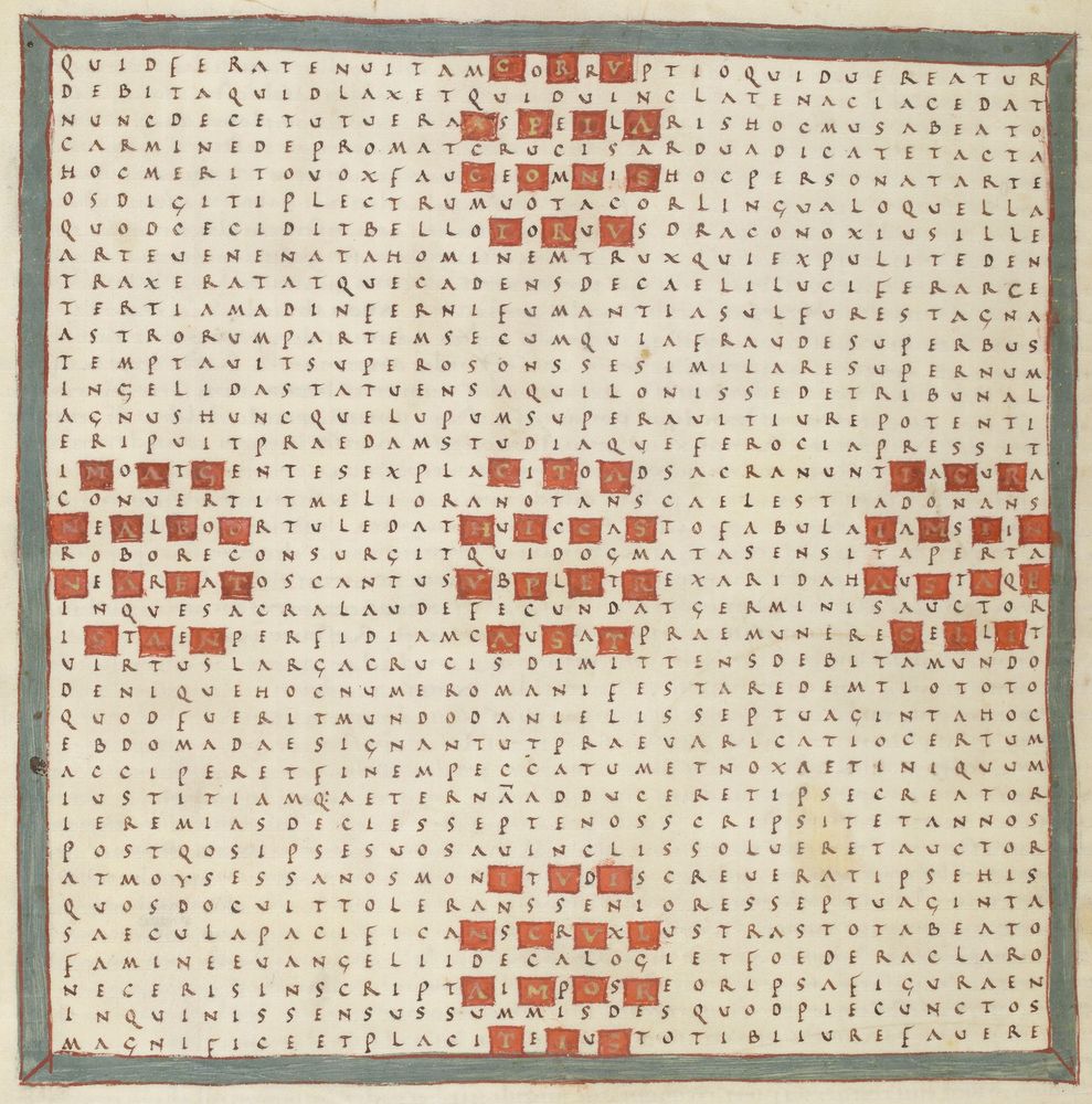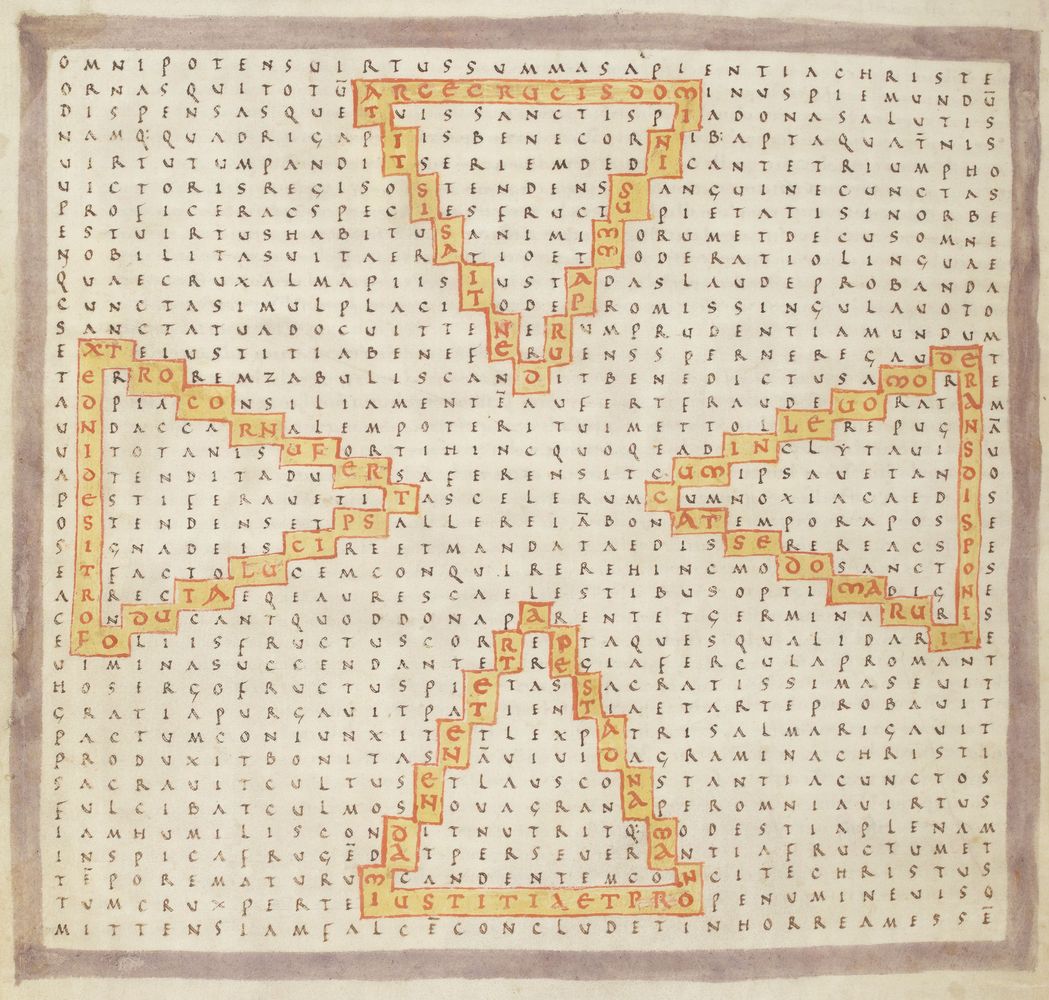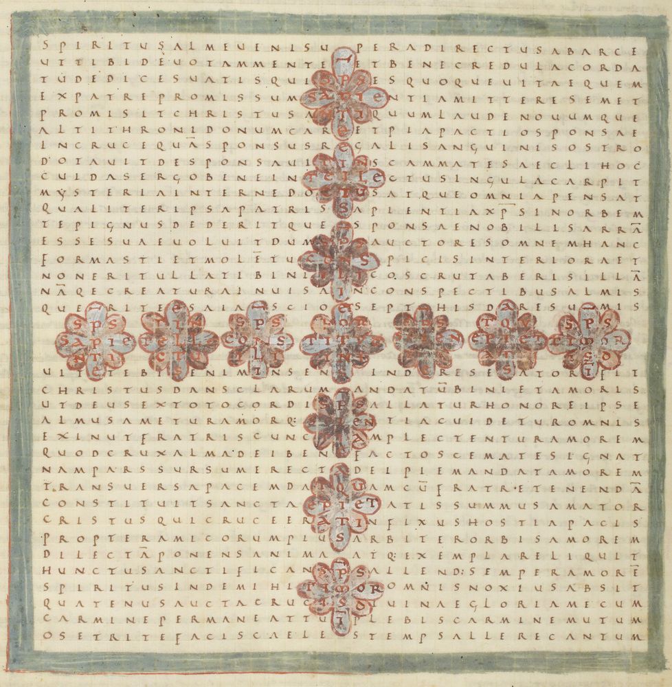 ► Cette œuvre de poétique et de prose, autant que d’art visuel, qui fut demandée par Alcuin et encensée par Reuchlin, se présente sous forme de carmina figurata et se destine à expliquer les mystères de la croix et la mystique des nombres attribués à différentes entités. Requérant une patience et un talent certain pour son élaboration, il s’agit d’un chef-d’œuvre de la période carolingienne, on la retrouve réutilisée dans l’Introduction à la Cabale.