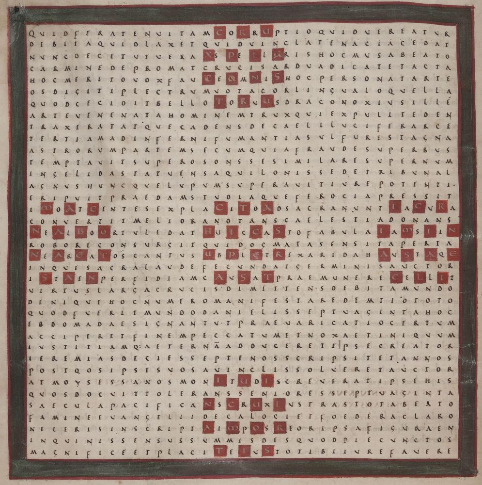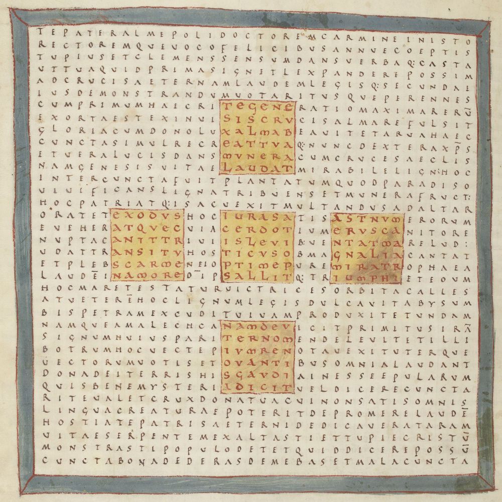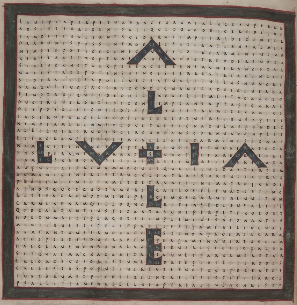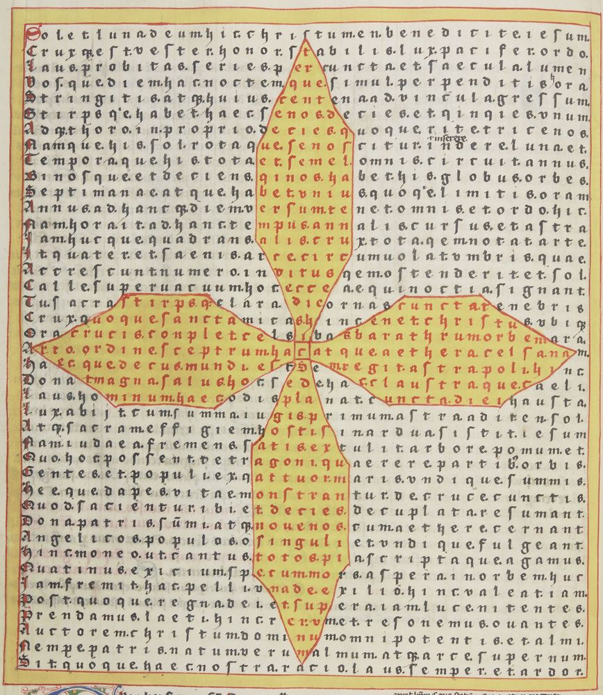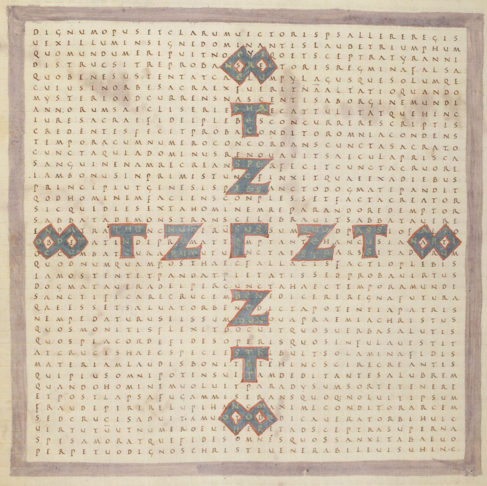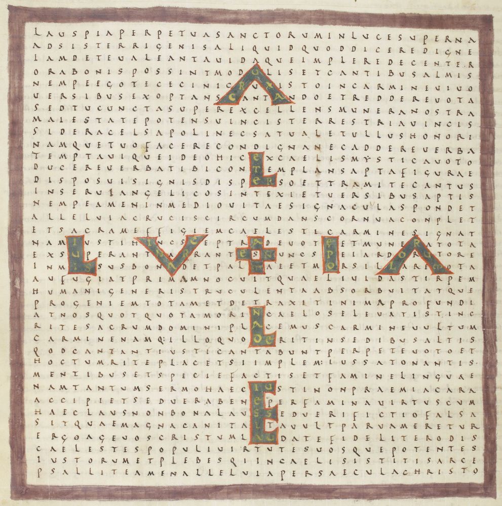 ► Cette œuvre de poétique et de prose, autant que d’art visuel, qui fut demandée par Alcuin et encensée par Reuchlin, se présente sous forme de carmina figurata et se destine à expliquer les mystères de la croix et la mystique des nombres attribués à différentes entités. Requérant une patience et un talent certain pour son élaboration, il s’agit d’un chef-d’œuvre de la période carolingienne, on la retrouve réutilisée dans l’Introduction à la Cabale.