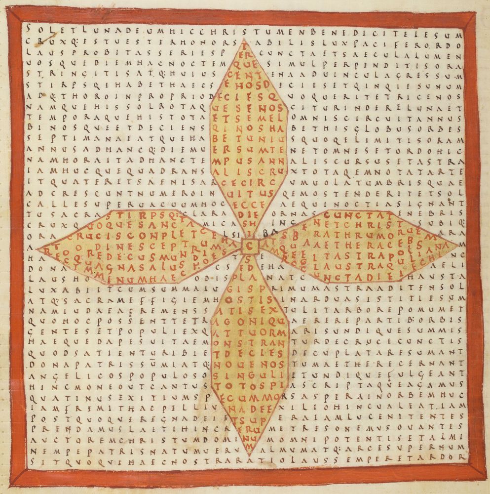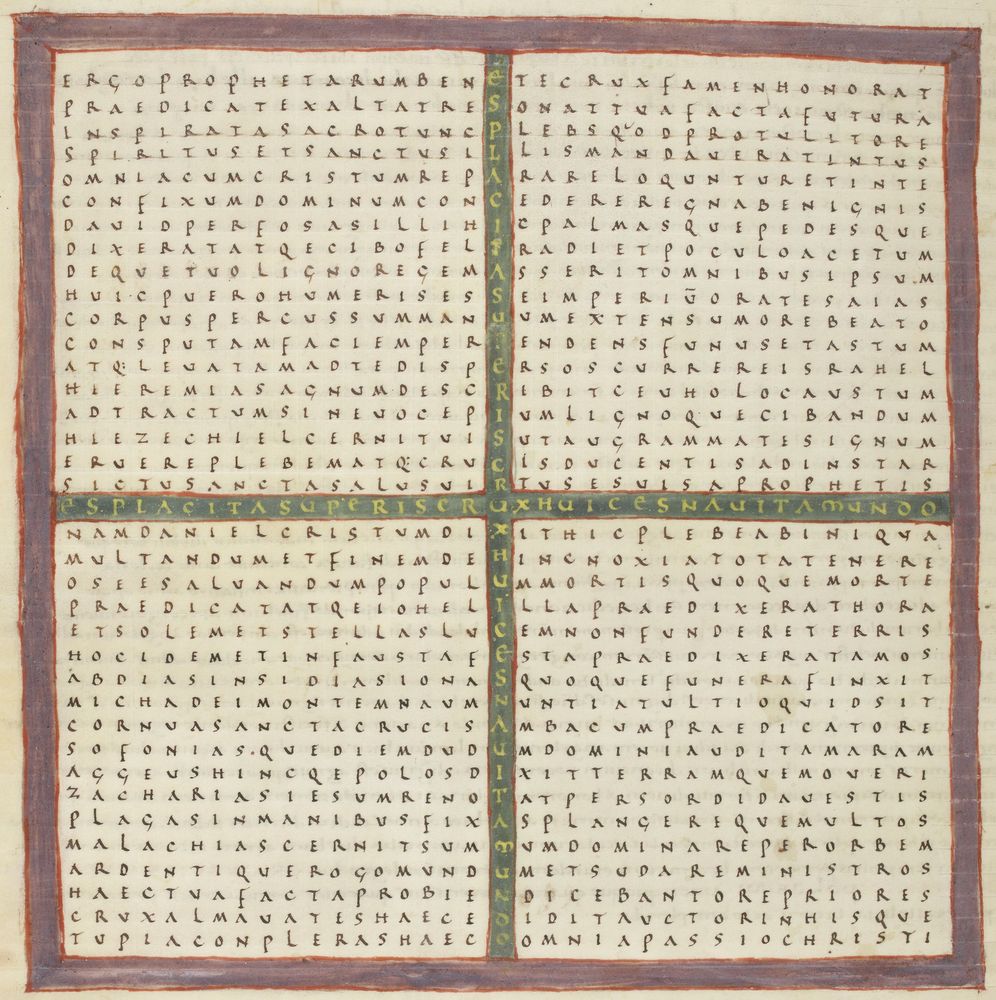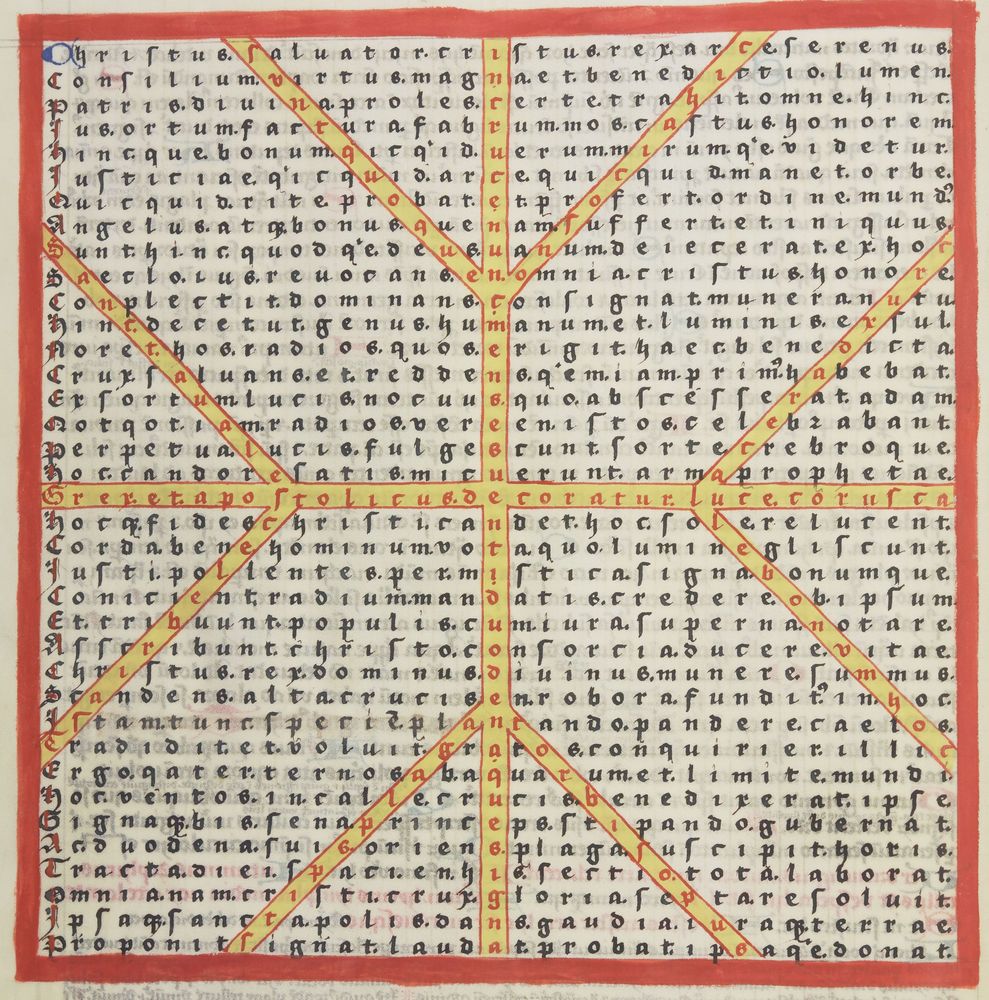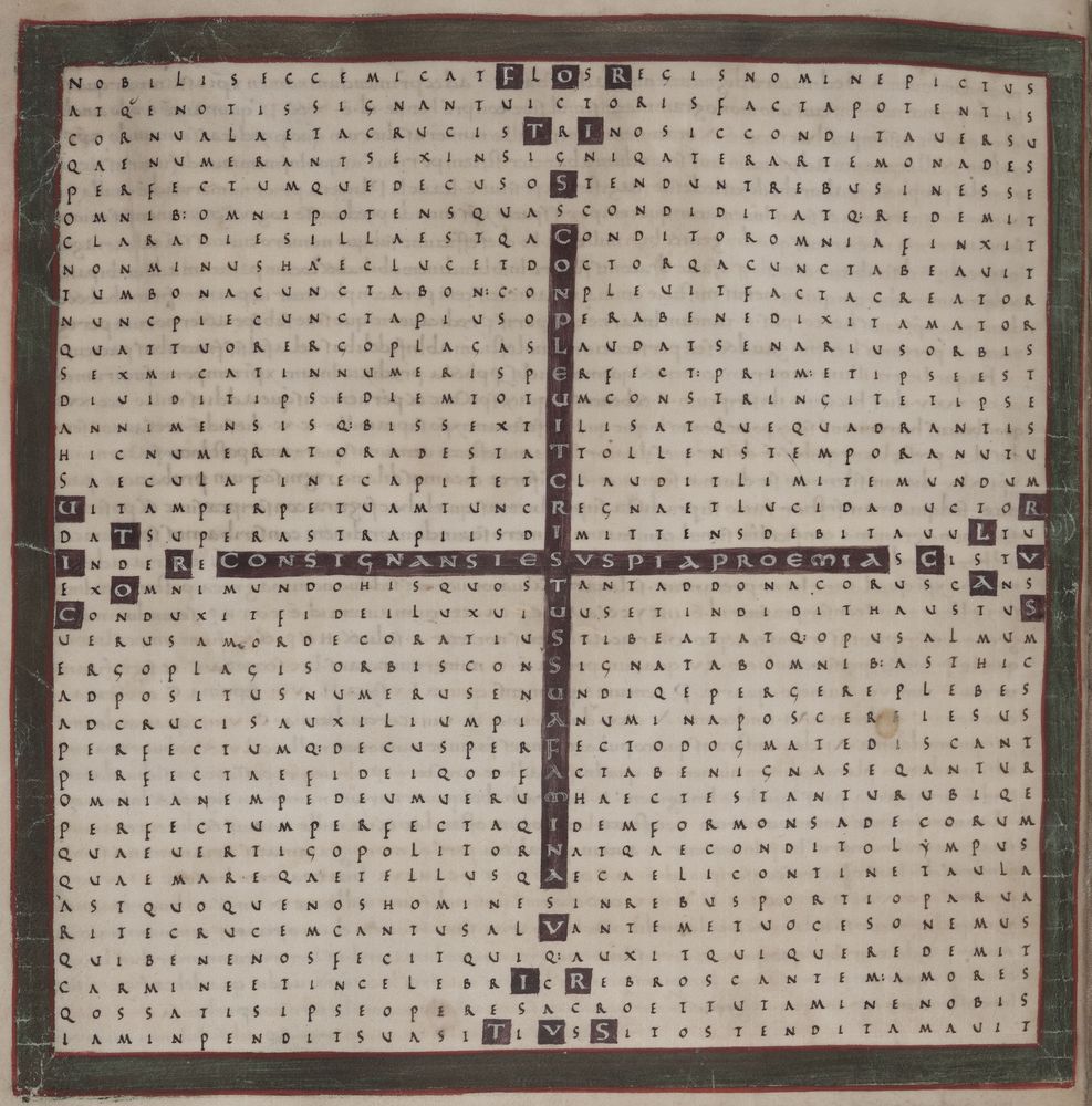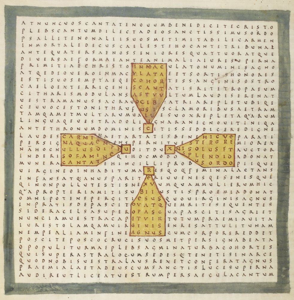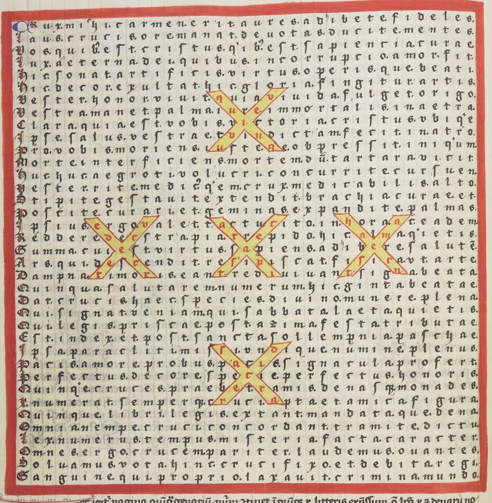 ► Cette œuvre de poétique et de prose, autant que d’art visuel, qui fut demandée par Alcuin et encensée par Reuchlin, se présente sous forme de carmina figurata et se destine à expliquer les mystères de la croix et la mystique des nombres attribués à différentes entités. Requérant une patience et un talent certain pour son élaboration, il s’agit d’un chef-d’œuvre de la période carolingienne, on la retrouve réutilisée dans l’Introduction à la Cabale.