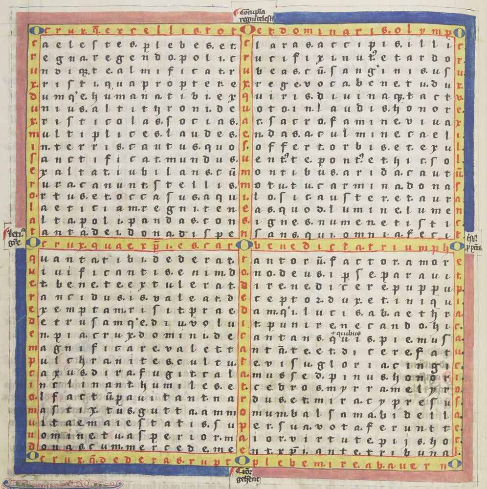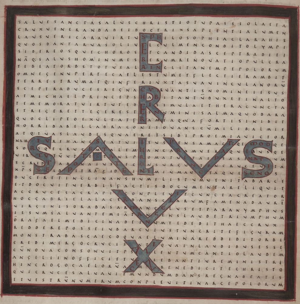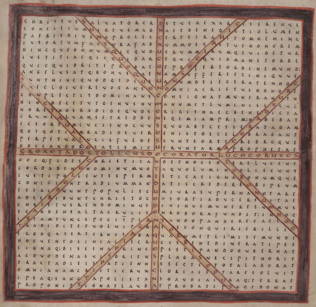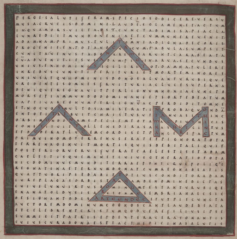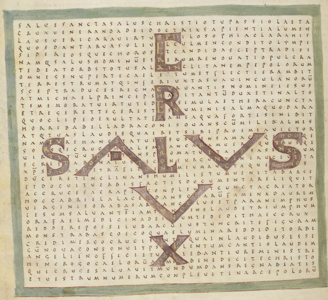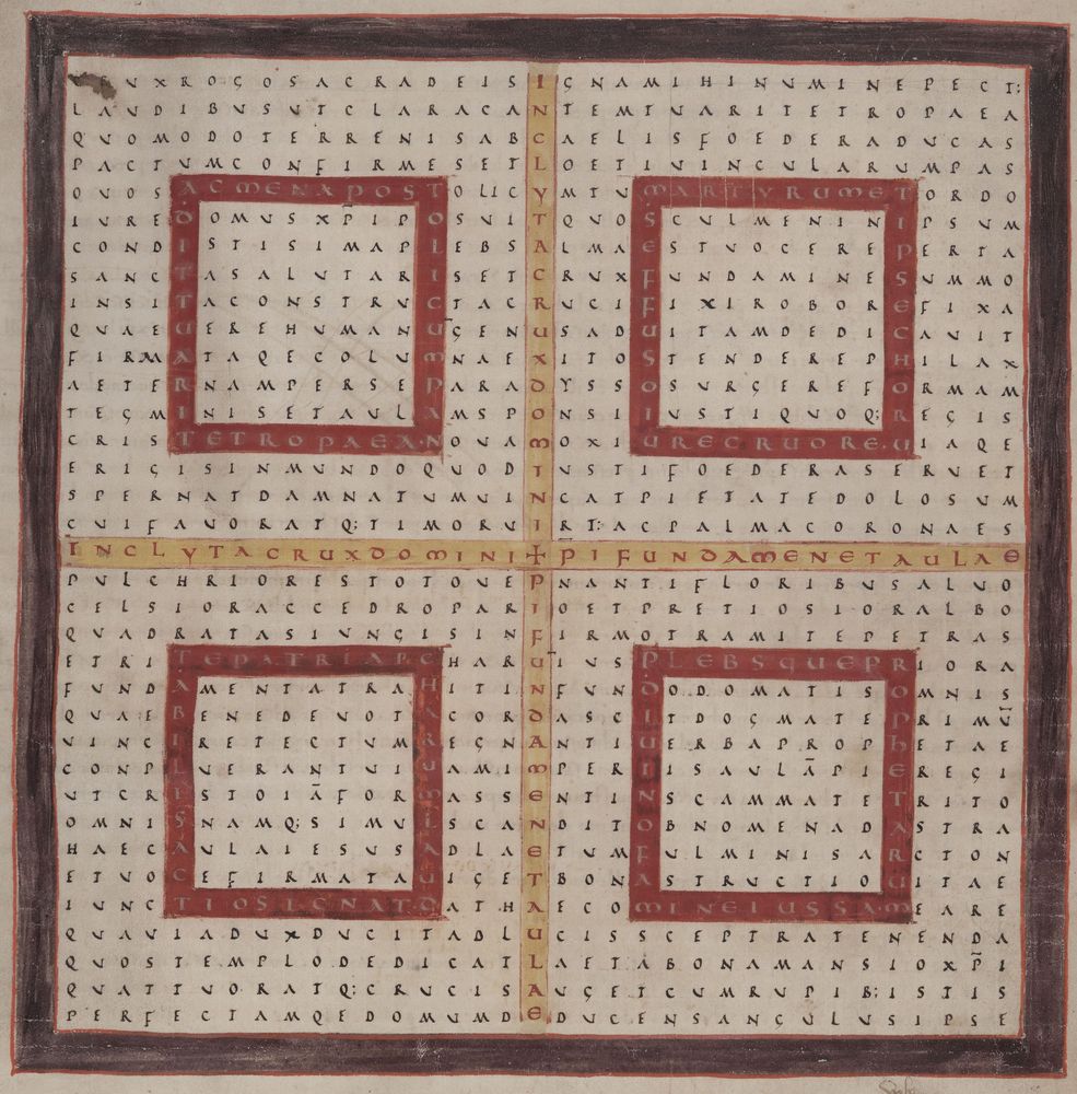 ► Cette œuvre de poétique et de prose, autant que d’art visuel, qui fut demandée par Alcuin et encensée par Reuchlin, se présente sous forme de carmina figurata et se destine à expliquer les mystères de la croix et la mystique des nombres attribués à différentes entités. Requérant une patience et un talent certain pour son élaboration, il s’agit d’un chef-d’œuvre de la période carolingienne, on la retrouve réutilisée dans l’Introduction à la Cabale.