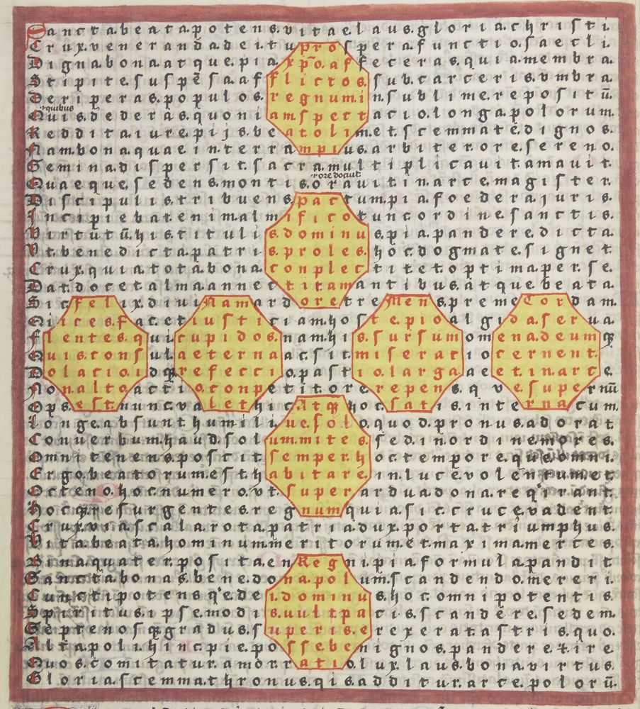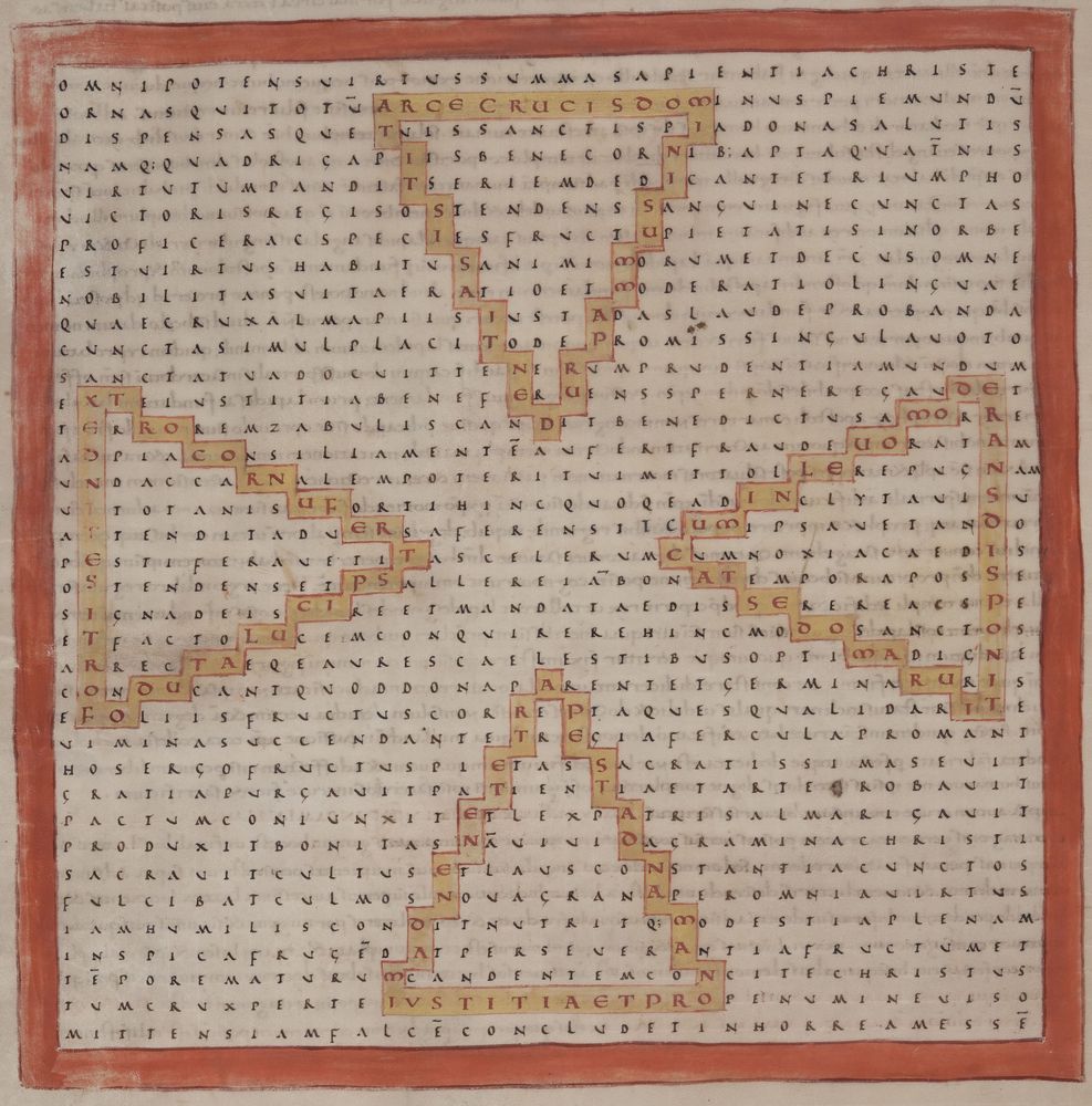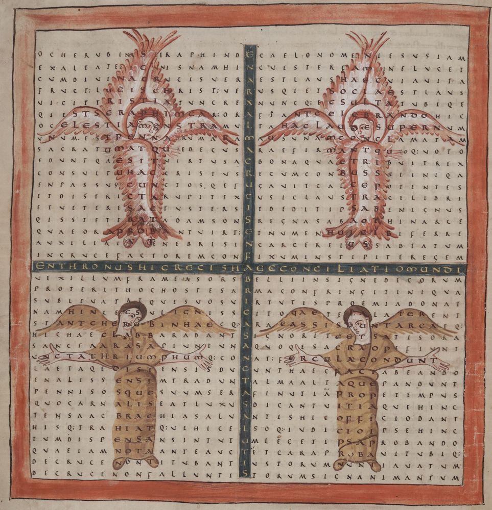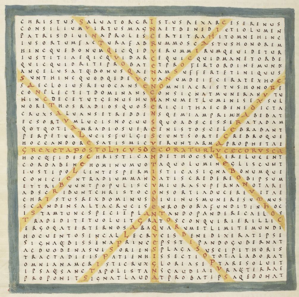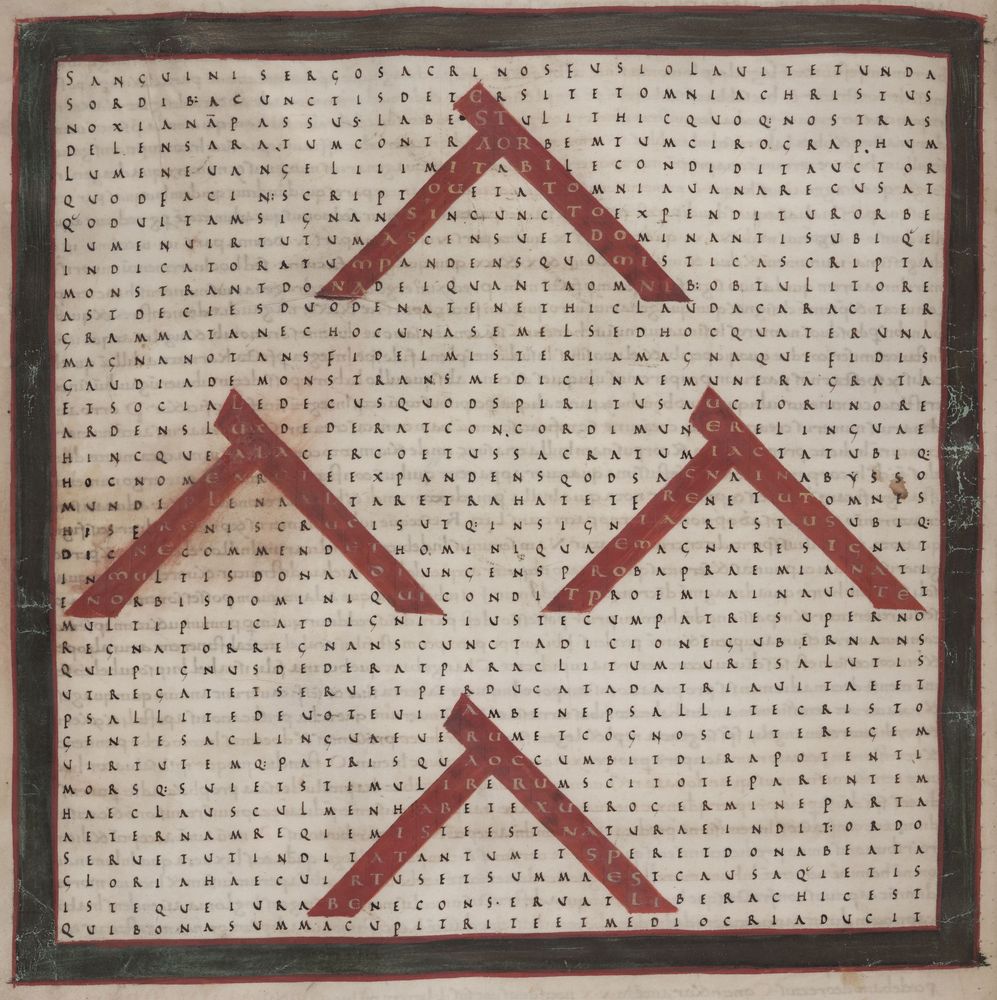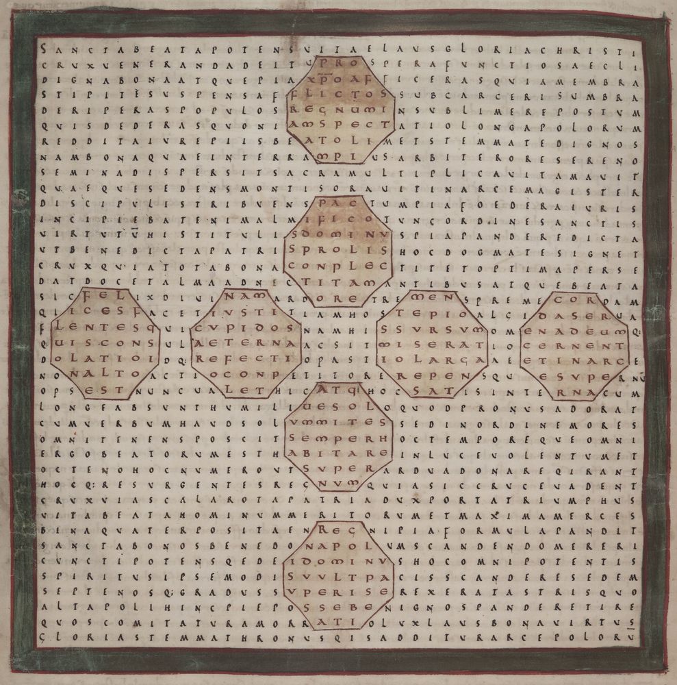 ► Cette œuvre de poétique et de prose, autant que d’art visuel, qui fut demandée par Alcuin et encensée par Reuchlin, se présente sous forme de carmina figurata et se destine à expliquer les mystères de la croix et la mystique des nombres attribués à différentes entités. Requérant une patience et un talent certain pour son élaboration, il s’agit d’un chef-d’œuvre de la période carolingienne, on la retrouve réutilisée dans l’Introduction à la Cabale.
