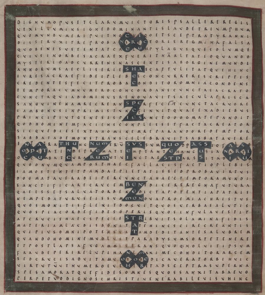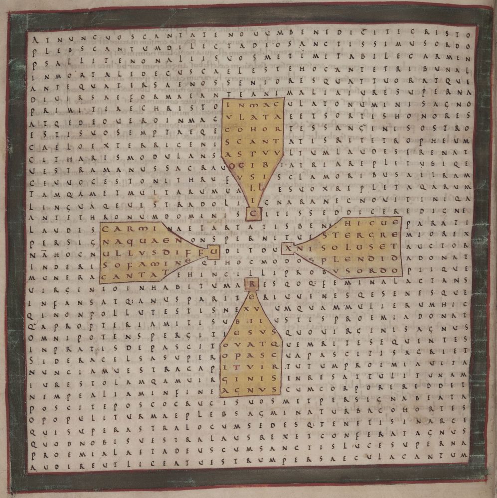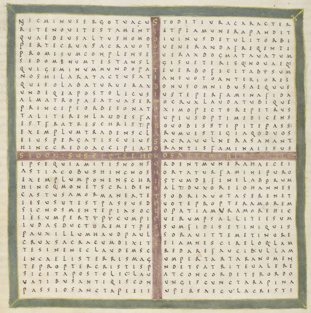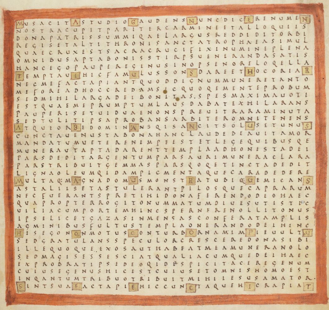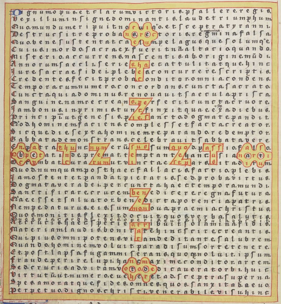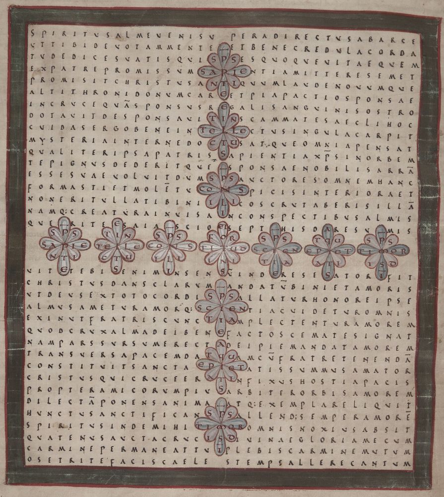 ► Cette œuvre de poétique et de prose, autant que d’art visuel, qui fut demandée par Alcuin et encensée par Reuchlin, se présente sous forme de carmina figurata et se destine à expliquer les mystères de la croix et la mystique des nombres attribués à différentes entités. Requérant une patience et un talent certain pour son élaboration, il s’agit d’un chef-d’œuvre de la période carolingienne, on la retrouve réutilisée dans l’Introduction à la Cabale.