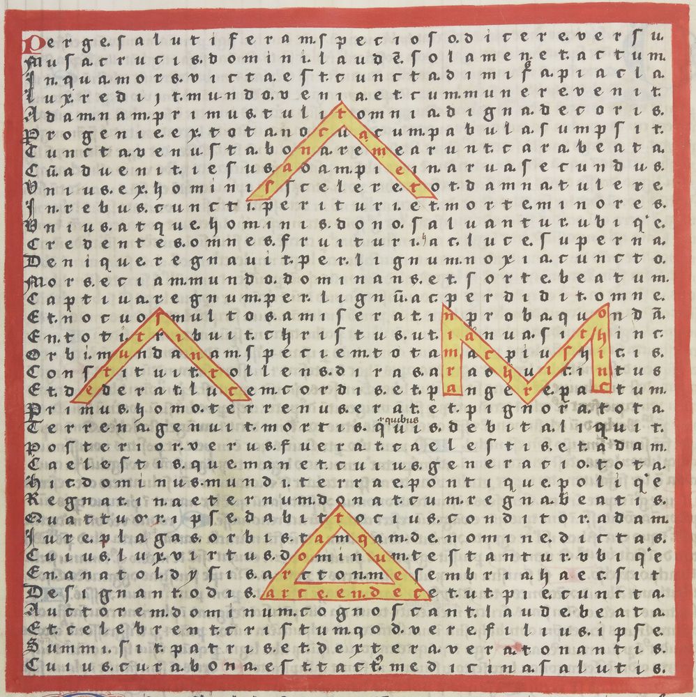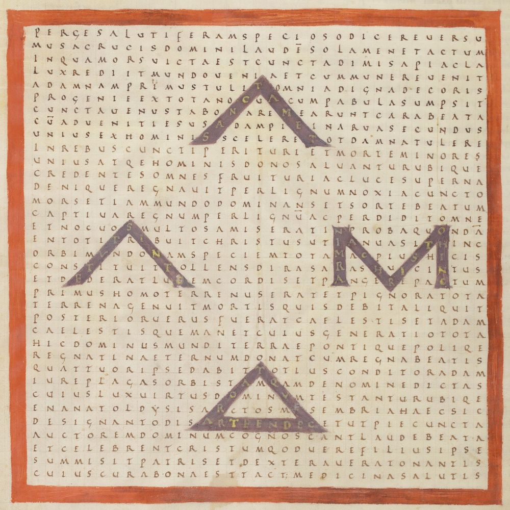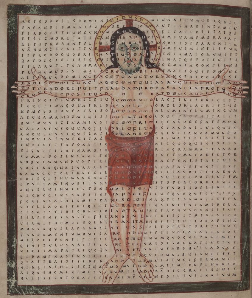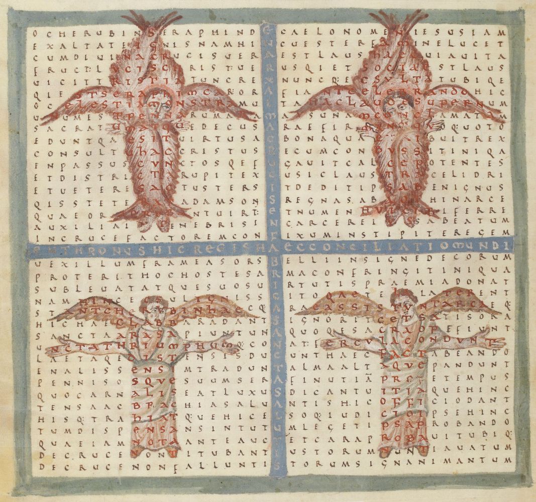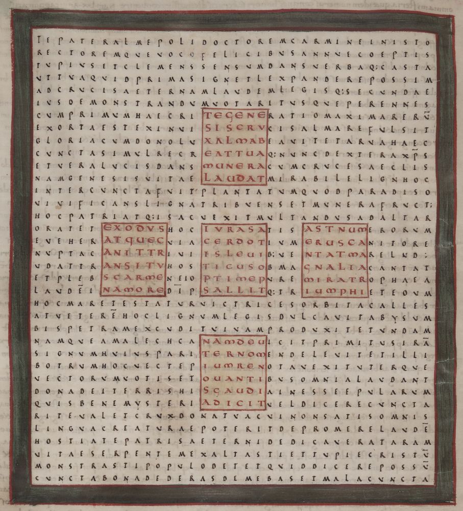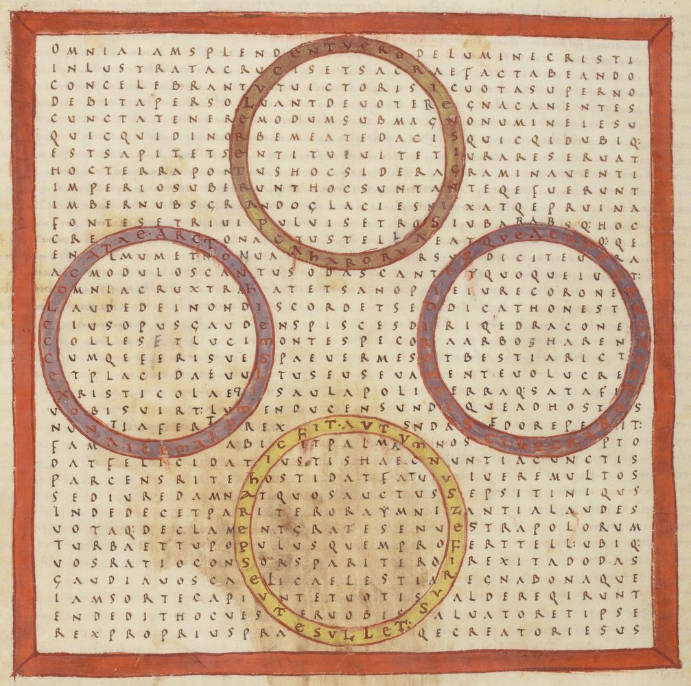 ► Cette œuvre de poétique et de prose, autant que d’art visuel, qui fut demandée par Alcuin et encensée par Reuchlin, se présente sous forme de carmina figurata et se destine à expliquer les mystères de la croix et la mystique des nombres attribués à différentes entités. Requérant une patience et un talent certain pour son élaboration, il s’agit d’un chef-d’œuvre de la période carolingienne, on la retrouve réutilisée dans l’Introduction à la Cabale.