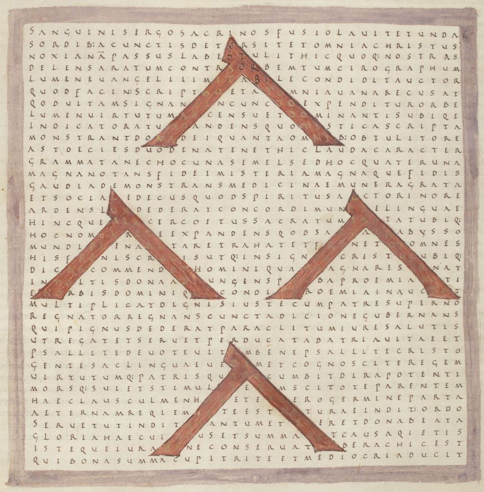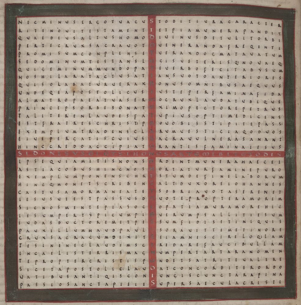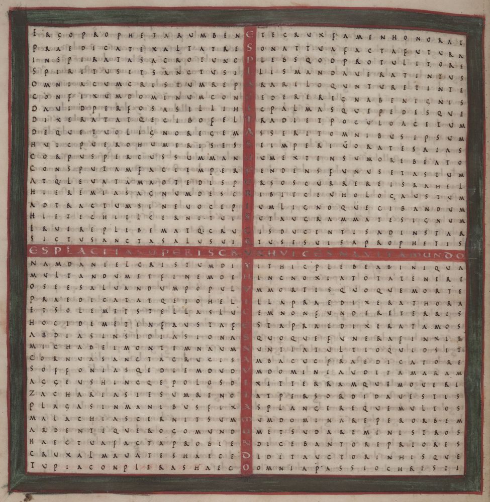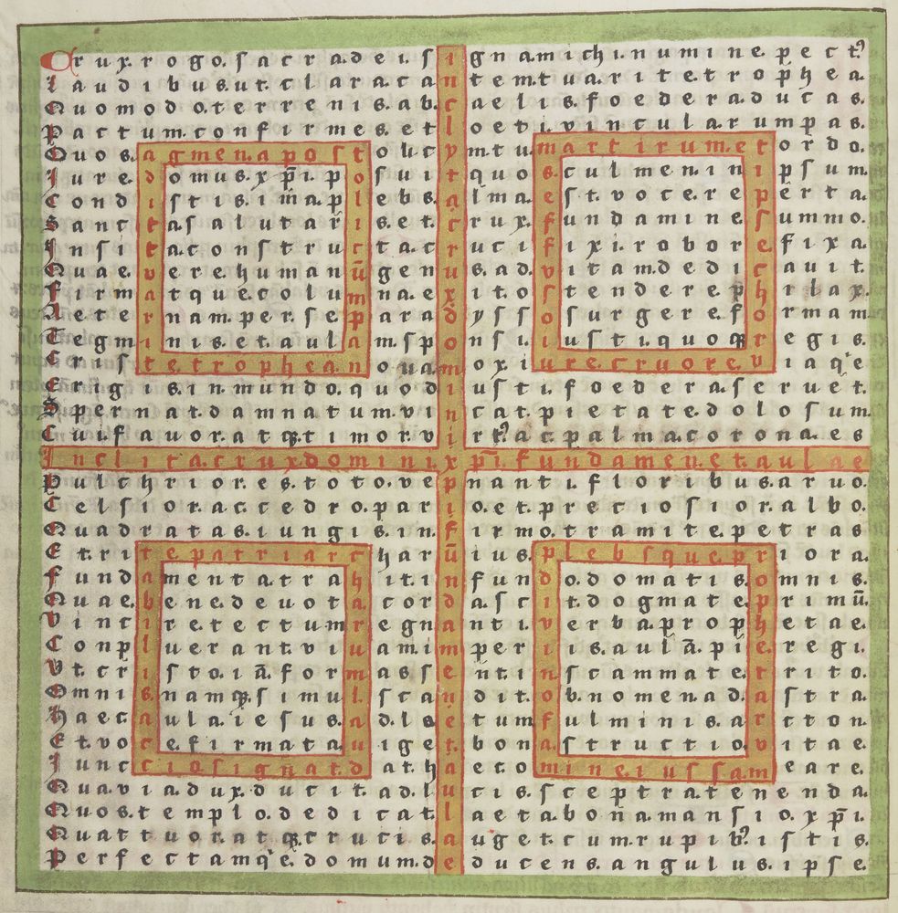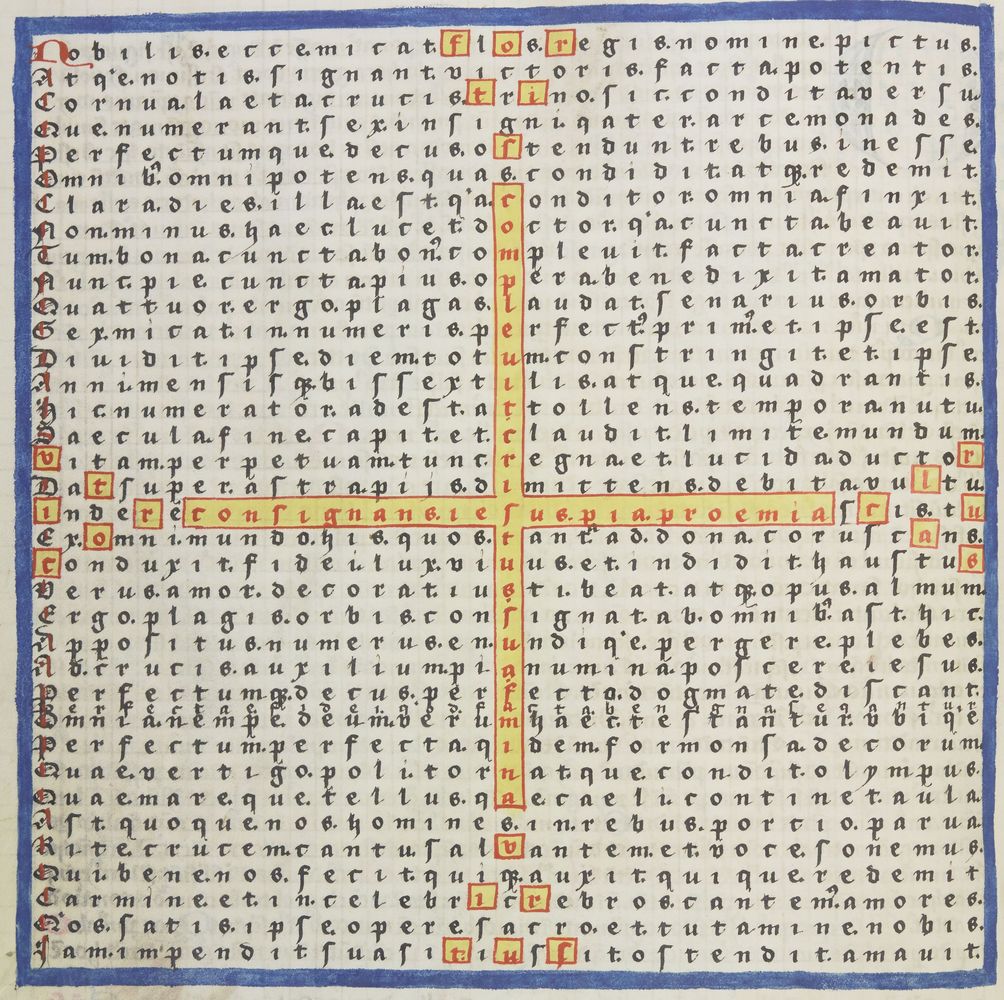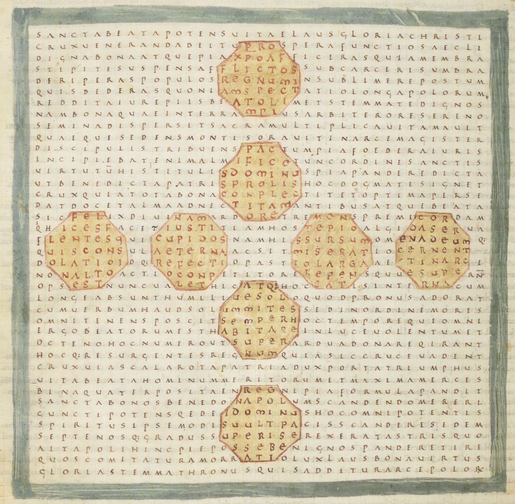 ► Cette œuvre de poétique et de prose, autant que d’art visuel, qui fut demandée par Alcuin et encensée par Reuchlin, se présente sous forme de carmina figurata et se destine à expliquer les mystères de la croix et la mystique des nombres attribués à différentes entités. Requérant une patience et un talent certain pour son élaboration, il s’agit d’un chef-d’œuvre de la période carolingienne, on la retrouve réutilisée dans l’Introduction à la Cabale.