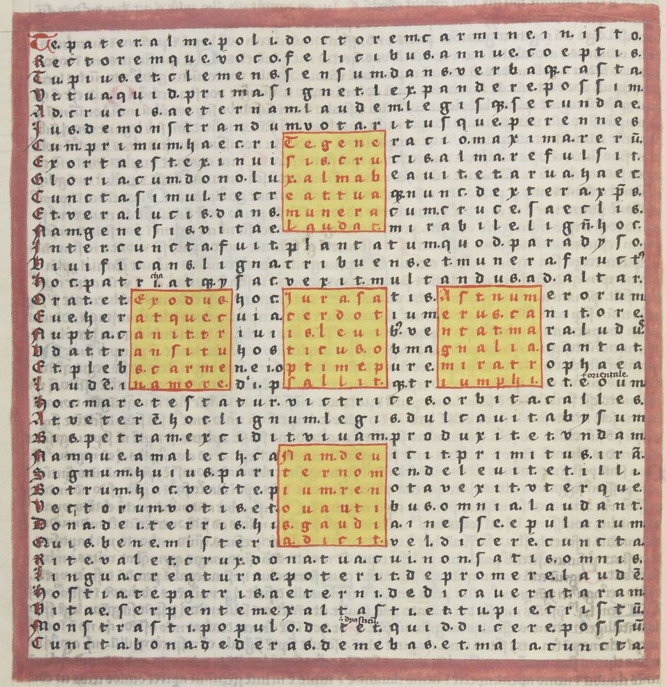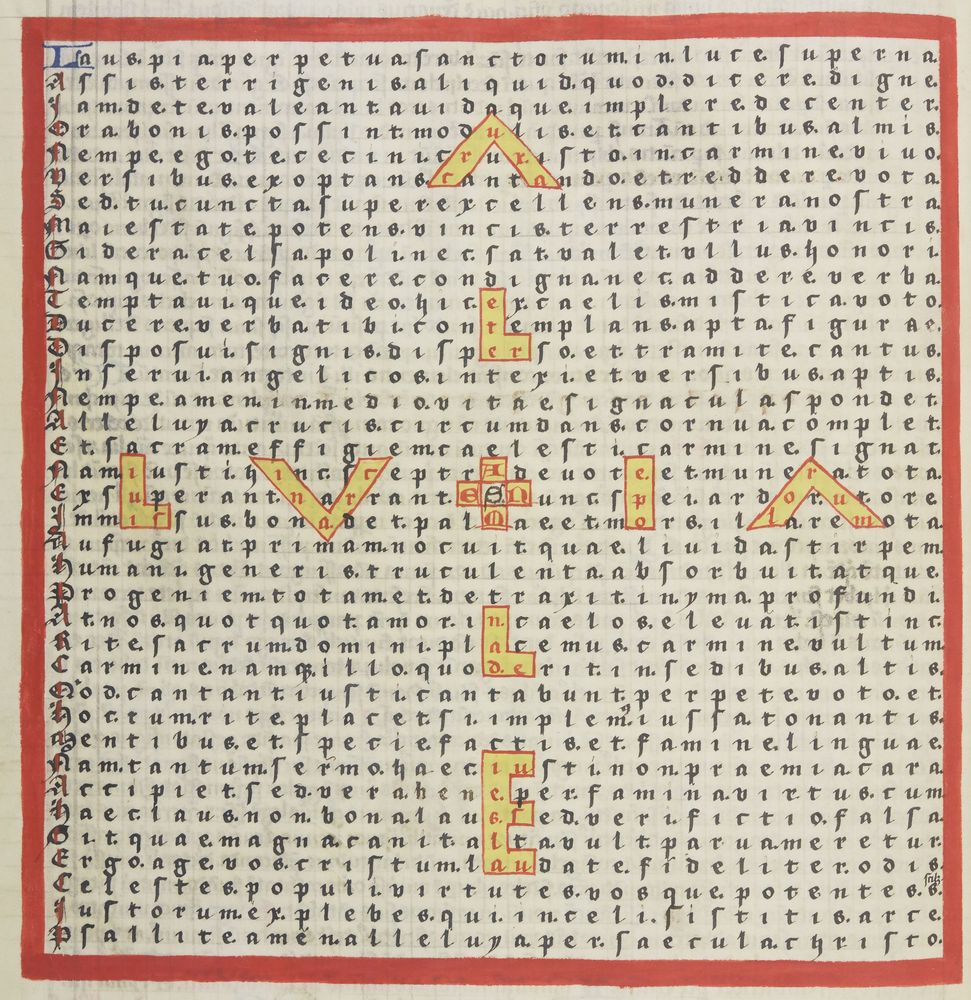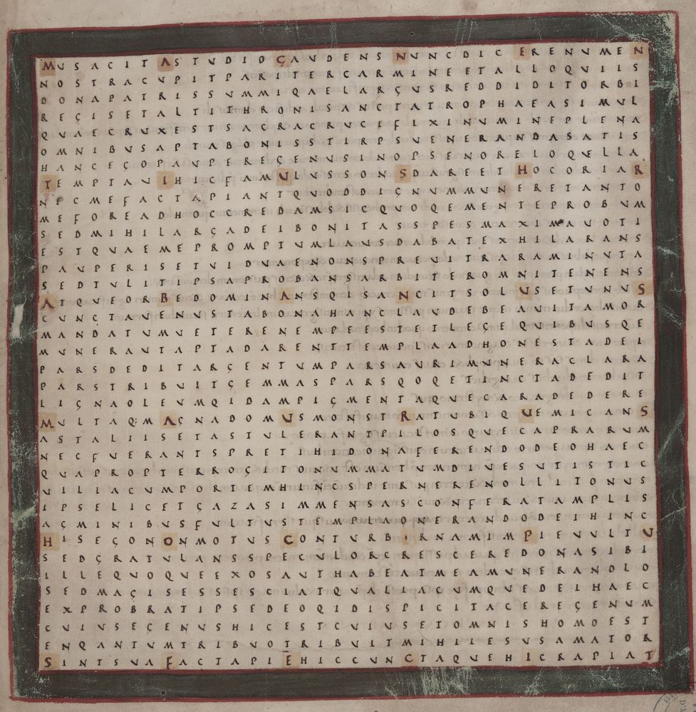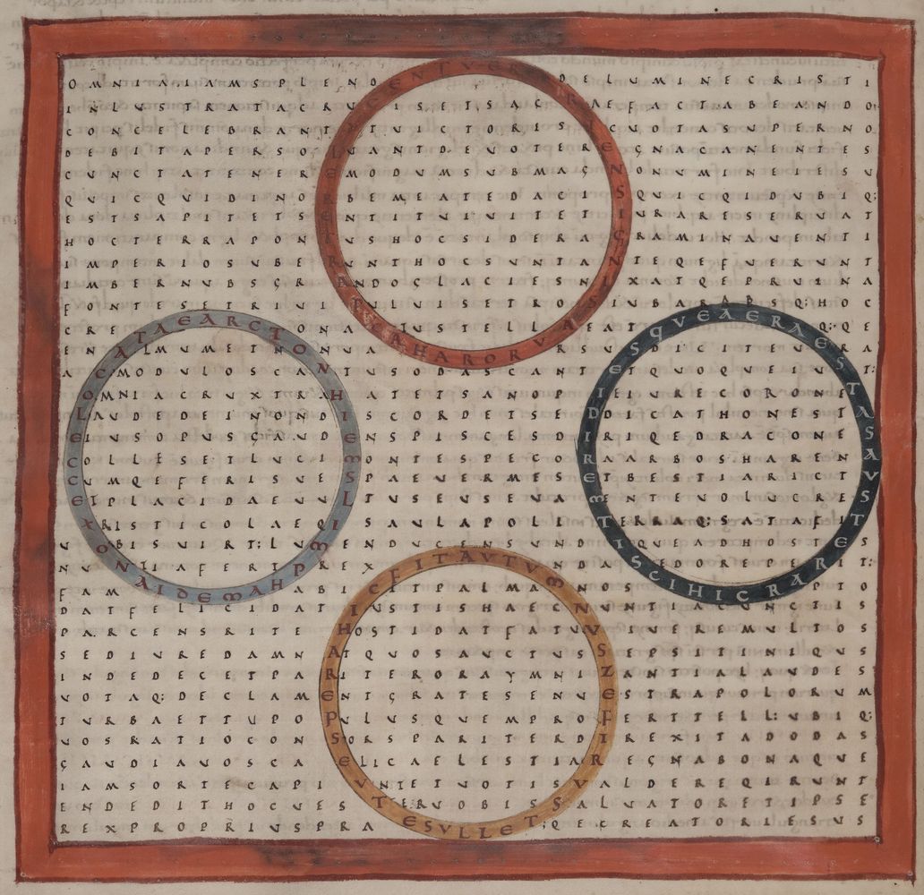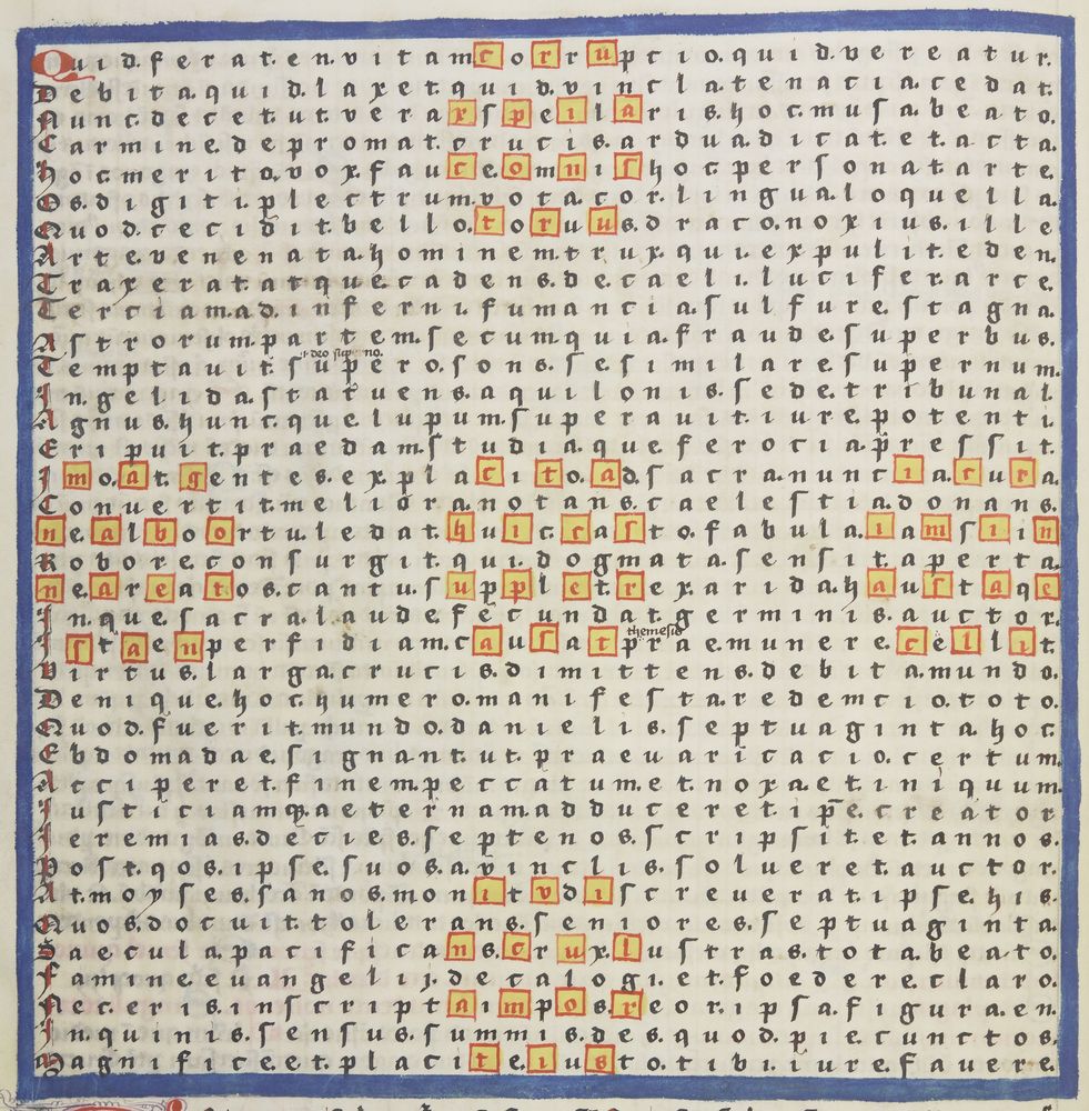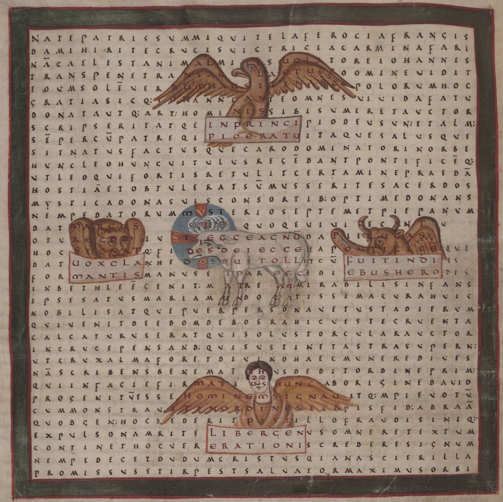 ► Cette œuvre de poétique et de prose, autant que d’art visuel, qui fut demandée par Alcuin et encensée par Reuchlin, se présente sous forme de carmina figurata et se destine à expliquer les mystères de la croix et la mystique des nombres attribués à différentes entités. Requérant une patience et un talent certain pour son élaboration, il s’agit d’un chef-d’œuvre de la période carolingienne, on la retrouve réutilisée dans l’Introduction à la Cabale.