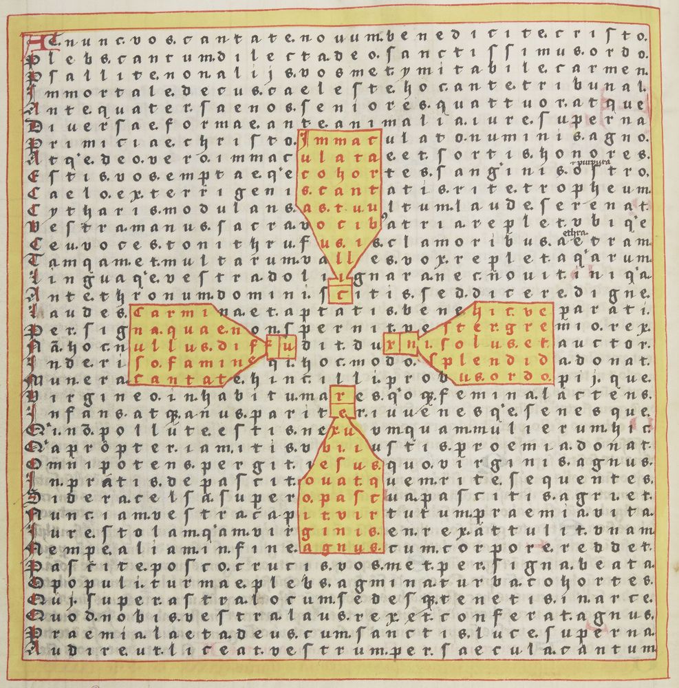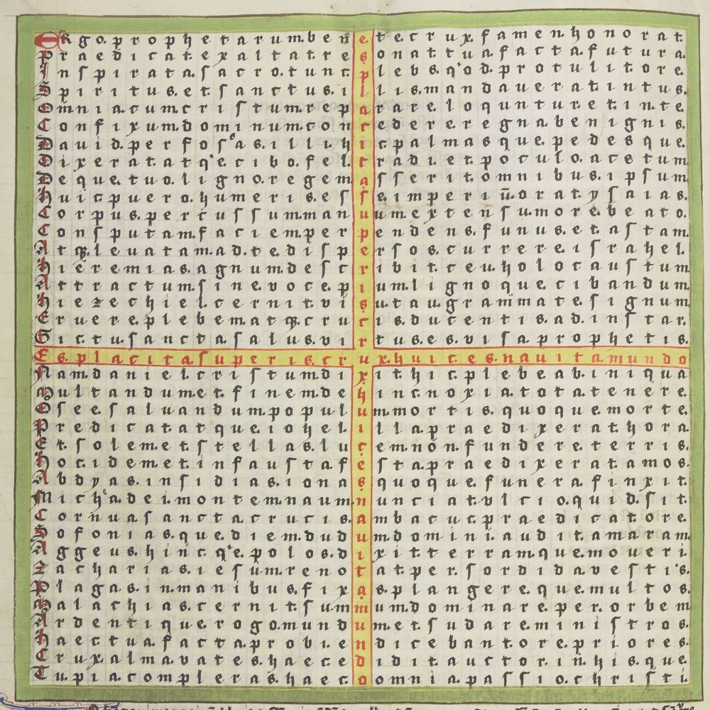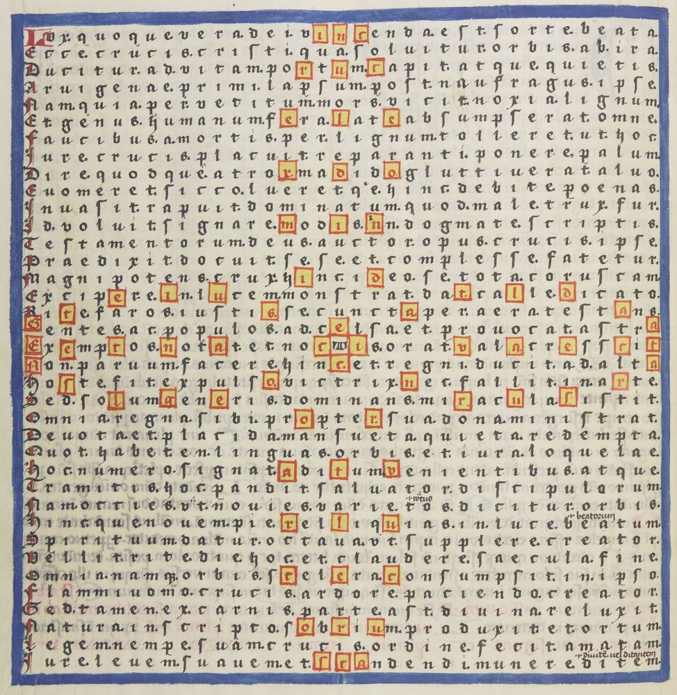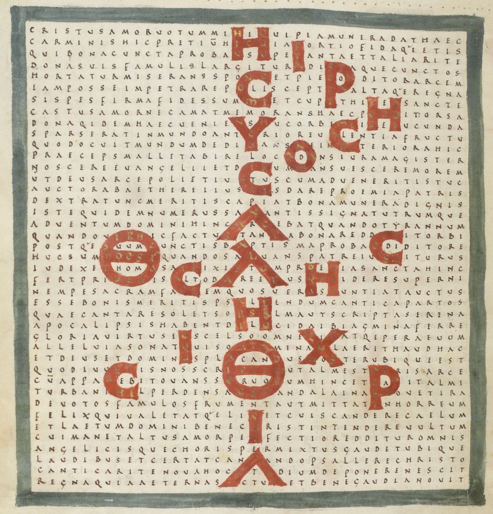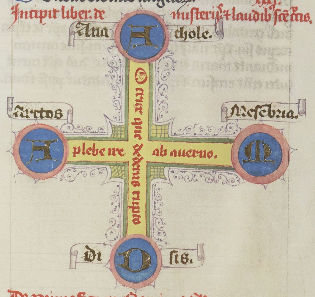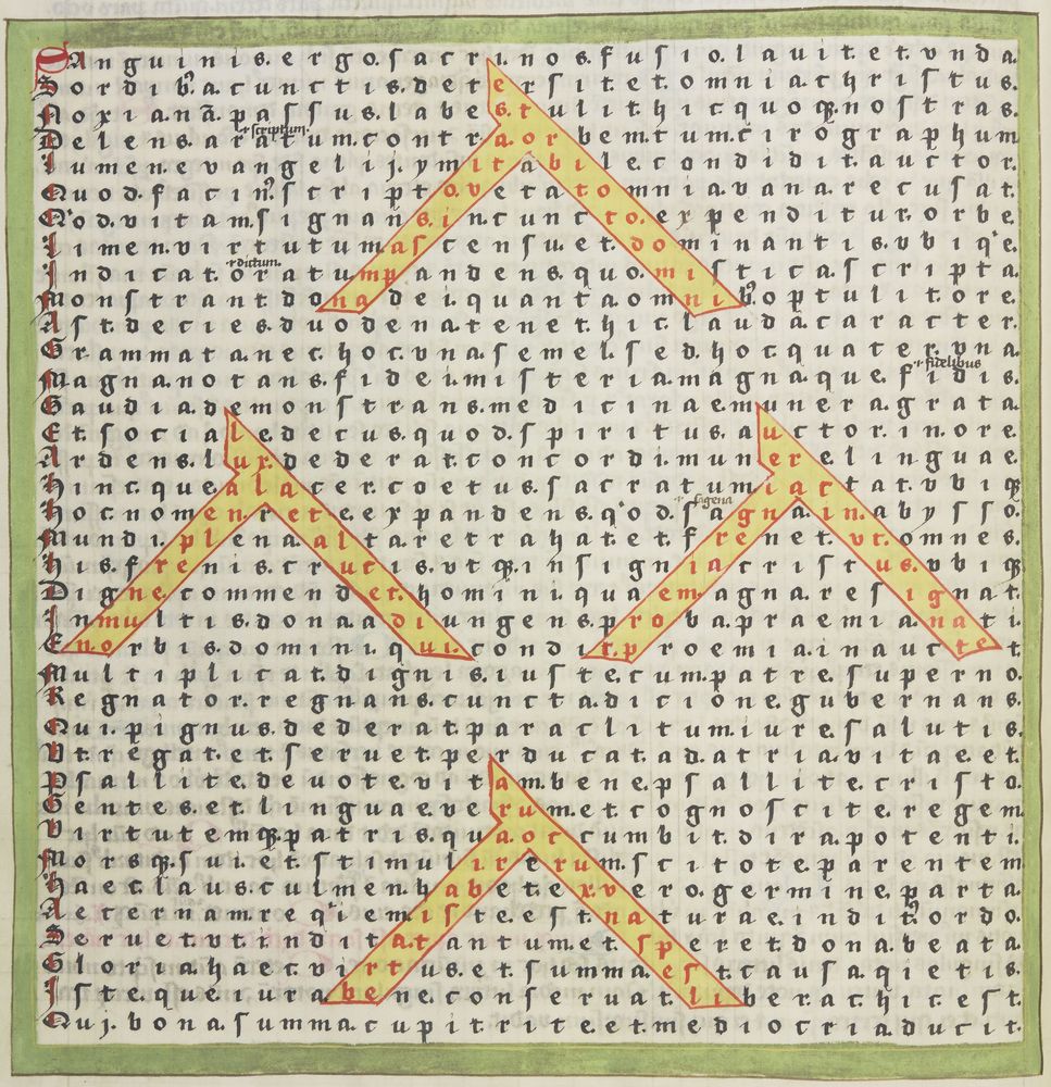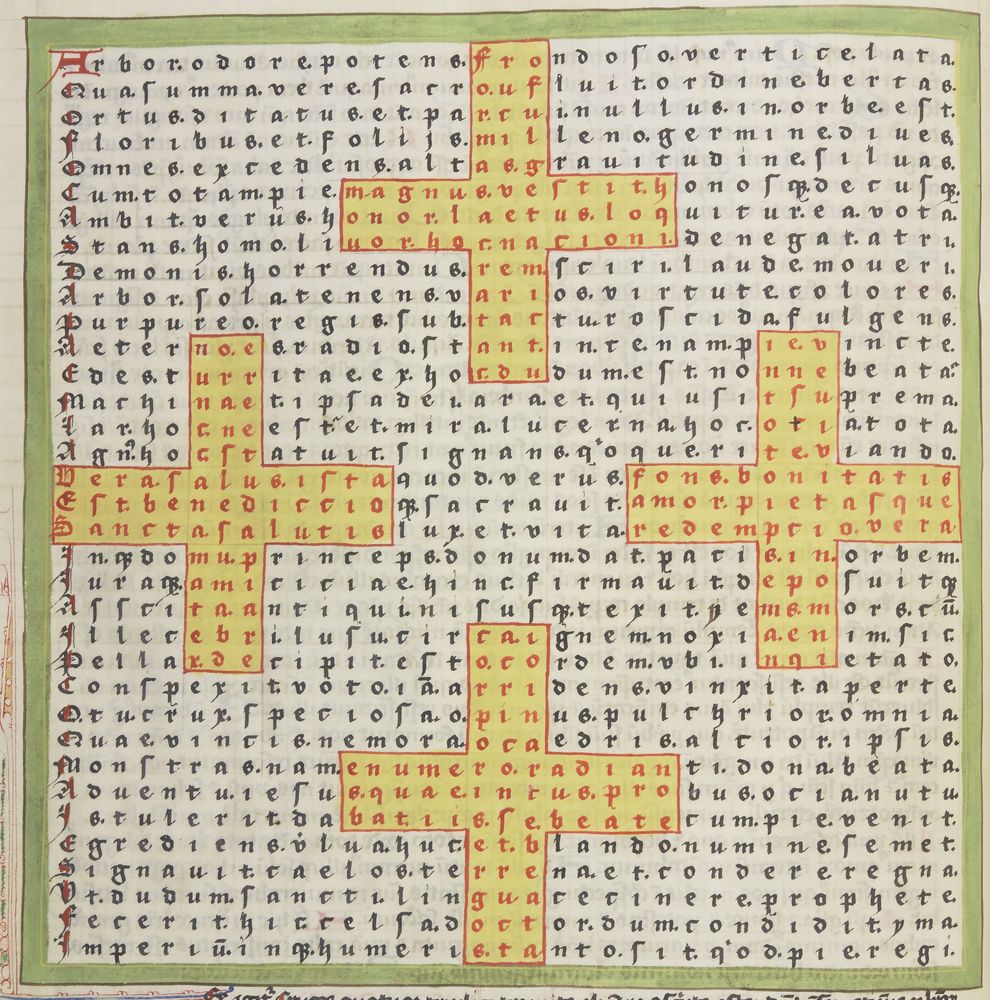► Cette œuvre de poétique et de prose, autant que d’art visuel, qui fut demandée par Alcuin et encensée par Reuchlin, se présente sous forme de carmina figurata et se destine à expliquer les mystères de la croix et la mystique des nombres attribués à différentes entités. Requérant une patience et un talent certain pour son élaboration, il s’agit d’un chef-d’œuvre de la période carolingienne, on la retrouve réutilisée dans l’Introduction à la Cabale.