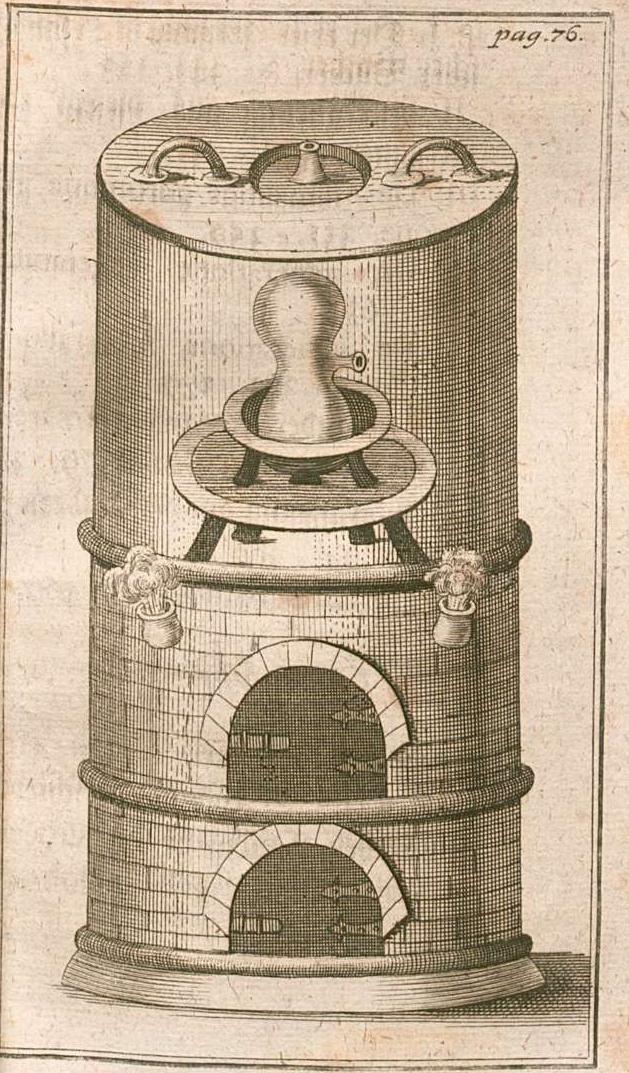 Tout d’abord créez un petit muret en bas avec de la bonne colle, ou avec de la terre préparée à cet effet, d’un pied long et haut. Après on met une grille de fer étroite, afin que les cendres de bois ou le charbon puissent tomber à travers. Mais sous le grill, il doit y avoir une petite porte, qu’il est possible d’ouvrir, afin d’enlever les cendres. Puis, au-dessus de grille du four, un peu plus élevé, un petit mur, d’un pied long et de large, avec une petite porte et des trous d’air aux quatre coins. Dessus, faites un plancher en terre, sans trous, afin que le four soit bien couvert, comme le montre cette illustration. Sur cet étage élever le mur ; mais tout d’abord mettez sur la terre, quatre supports de fer comme un trépied. Sur le dessus, il doit y avoir un vaisseau. Ces supports ainsi que le vaisseau ne doivent pas toucher la paroi du four. Aussi, il doit y avoir un autre trépied à l’intérieur du vaisseau ou essai, comme aussi un petit vaisseau sur lequel on peut mettre un verre ou un autre bol. Ce petit vaisseau doit être en bois.
